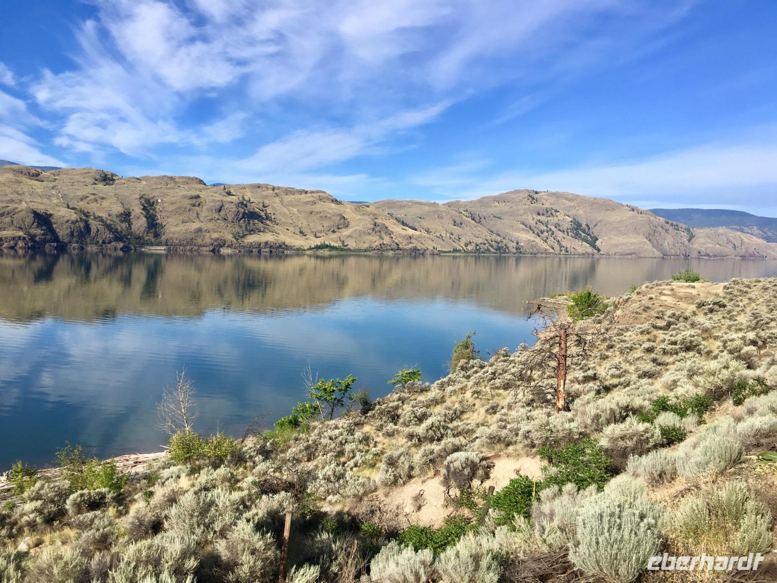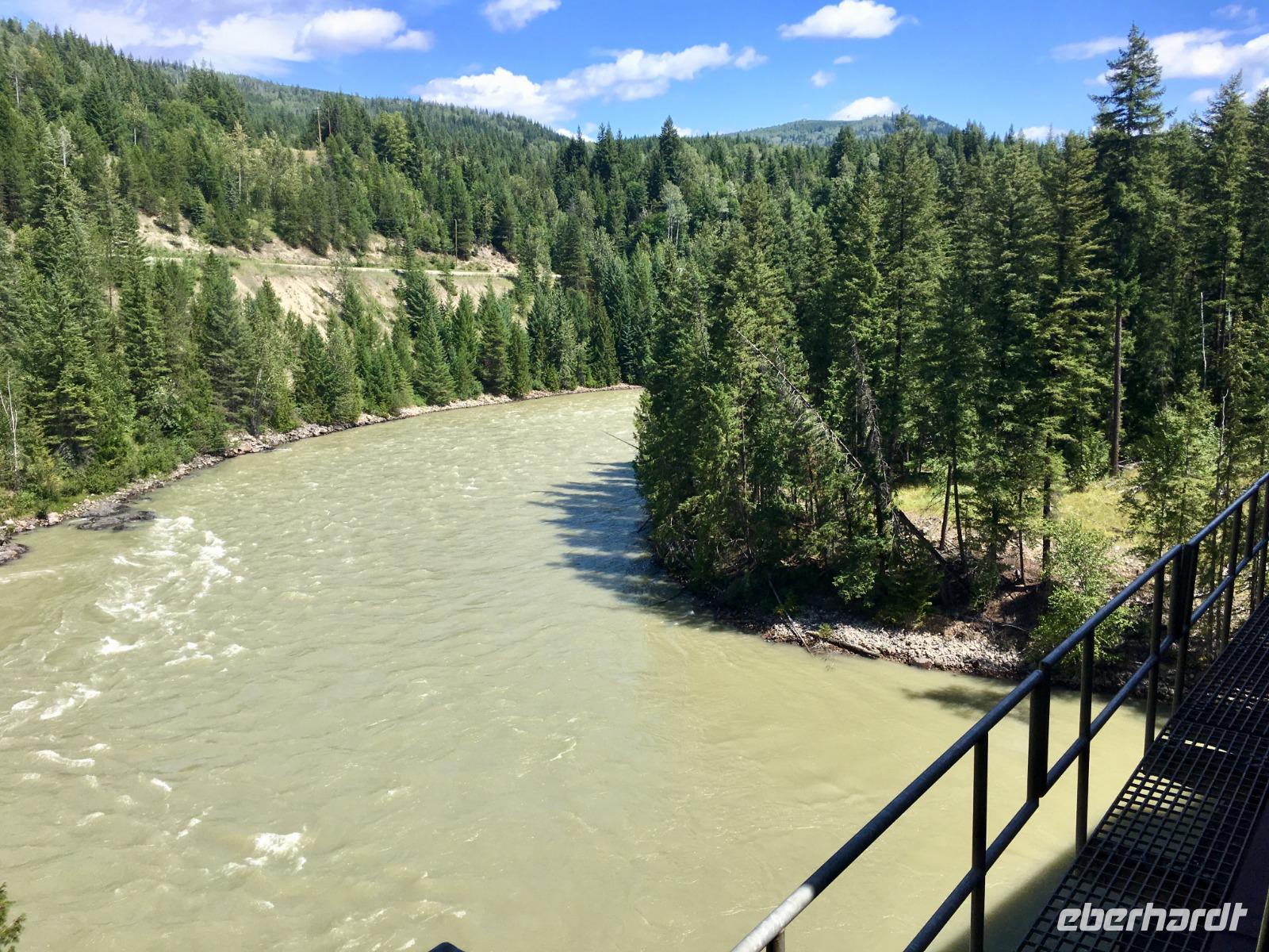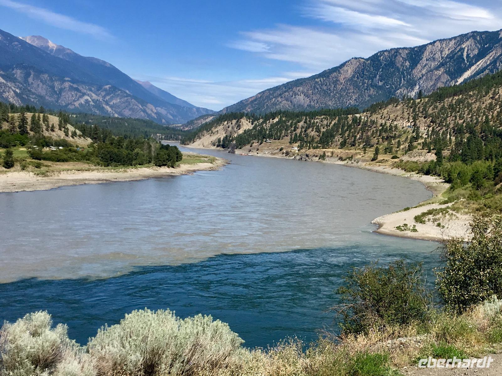 Die Sonne lacht, keine Wolke ist zu sehen, kein Ton zu hoeren. Halb verschlafen, besteigen wir den Bus, der uns zum Bahnhof von Jasper fuehrt. Heute beginnt ein ganz besonderer Teil unserer Reise. Denn fuer die naechsten 2 Tage fahren wir mit dem weltbekannten Rocky Mountaineer von Jasper nach Vancouver. Diese Bahnfahrt fuehrt uns heute aus den Rocky Mountains hinaus. Erst fahren wir, in einem Domwagen mit ledernen Sitzen, umhegt und vorzueglich betreut, ueber die Wasserscheide des amerikanischen Kontinents auf die westseite Kanadas. Vorbei an Bieberbauten verlassen wir nun Alberta und gelangen sang und klanglos nach Britisch Kolumbien. Ploetzlich ruft eine Zugbegleiterin, Baer to the right, Baer to the right. Alle Koepfe schnellen auf die rechte Seite (sprechen alle ploetzlich english ?) um den Schwarzbaeren zu sehen. Ruhe kehrt bald wieder ein und die naechste Aufregung ist das umstellen der Uhren. Der heutige Tag hat 25 Stunden, wir sind gerade wieder juenger geworden und haben eine Stunde mehr Spielzeit. Gelangen wir wieder in den Kindergarten wenn wir nun jahrelang gen Westen fahren ? Buegeln sich da alle Falten wieder glatt ? Item, der hoechste Berg Britisch Kolumbiens mit seinen 3954 Meter Hoehe ist auch heute bloss zu 2/3 zu sehen. Eine weisse Wolke umhuellt die Spitze des maechtigen Mount Robson. Von jetzt an werden die Berge immer niedriger, die Landschaft gruener und ueppiger. Der Fraser Fluss entspringt hier und biegt aber auch bald einmal gen Westen wobei wir suedlich fahren. Hier begegnen wir dem North Thompson Fluss der uns durch die Columbia Bergkette bis nach Kamloops begleitet. An Bord des Zuges werden wir verwoehnt wie Gott in Frankreich. Auf bequemen Sesseln sitzen wir in einem Panoramawagen. Draussen zieht die maechtige Natur vorbei wobei die chramanten, jungen Fahrtbegleiterinnen aus dieser Zugreise ein Erlebnis gestalten. Kulinarisch hochstehende Speisen schauen wie Bilder aus und werden begleitet von besten BC Weinen Gaumenfreude und Augenweide. Wir erfahren auch allerhand ueber Land und Leute dieses nun 150 Jahre alten Landes und warten immer mal wieder bis ein Gleis fuer die Weiterfahrt frei wird. Alle Gueterzuege der Canadien Pacific Railway haben Vorrang und sie fahren nicht nach einem Zeitplan. Wir sind bloss Gaeste auf diesen Schienen und so weiss man auch nie wann man genau ankommt. Zeit wird auf einmal unwichtig wir koennen so richtig loslassen und das Erlebnis dieser Zugreise einfach geniessen. In Kamloops beziehen wir unsere Zimmer in einem Hotel wo unsere Koffer bereits in den Zimmern stehen und gehen auch gleich zum Thompson Fluss hinunter. Nur eine unter uns geht in dem 18 graedigem Fluss schwimmen ehe wir auf der Seepromenade Kamloops spazieren gehen. Dieser Spaziergang und ein Bierchen spaeter, bringt uns wieder zurueck zu unseren Koffer.