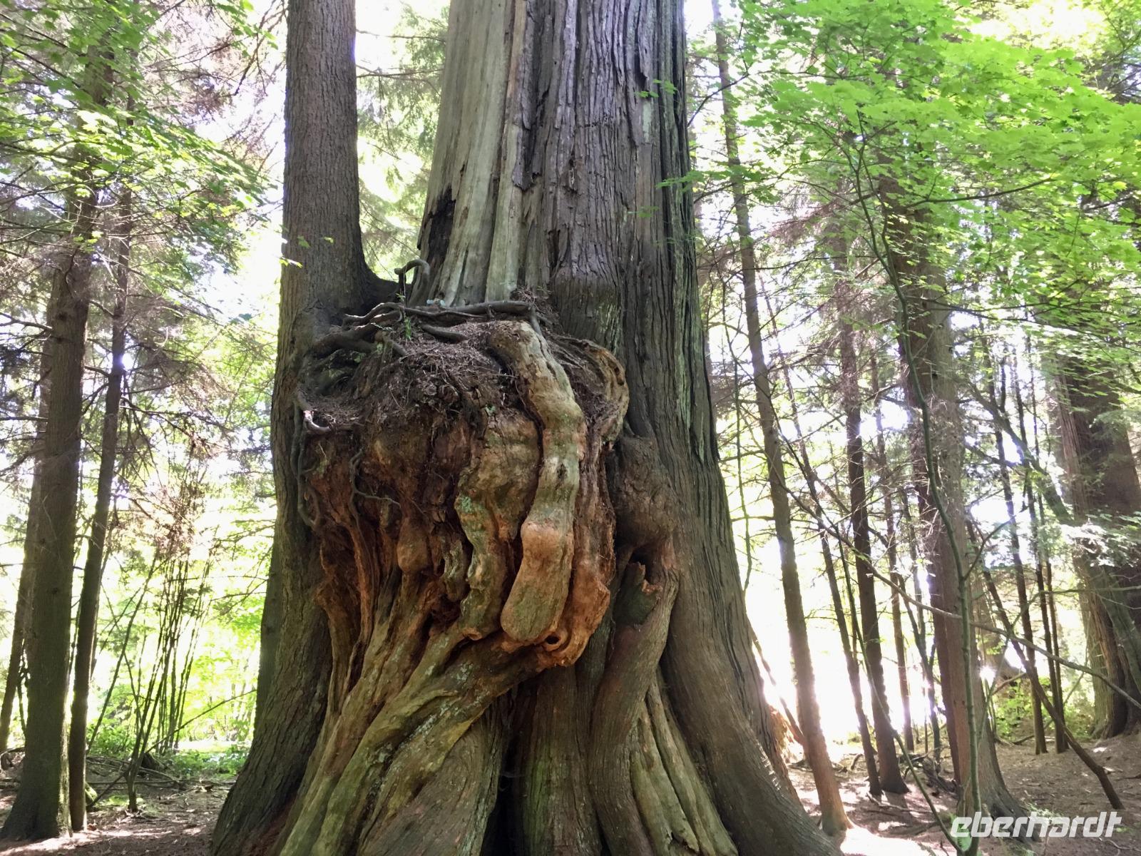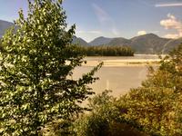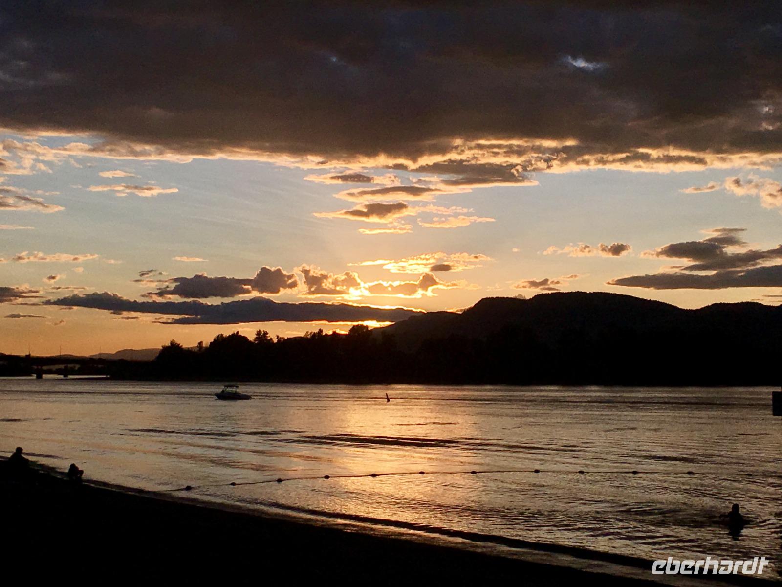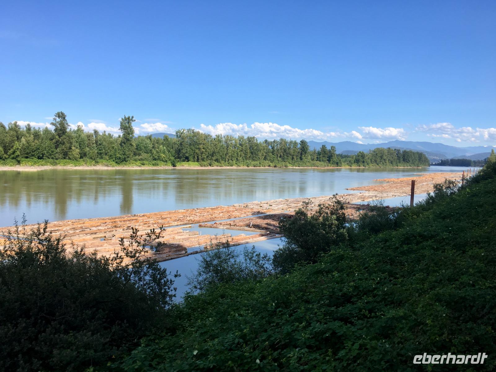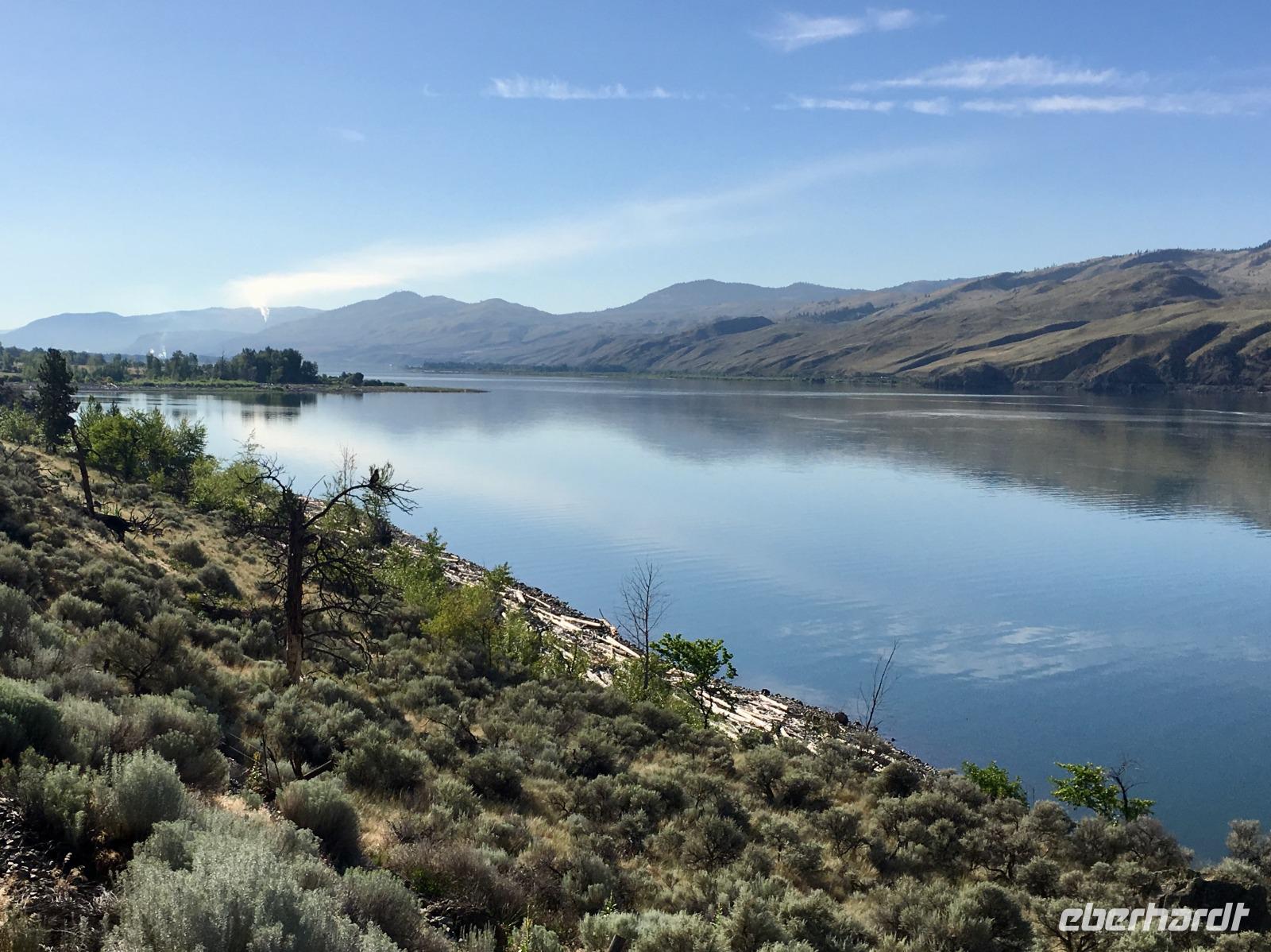 Die Sonne lacht, keine Wolke ist zu sehen, kein Ton zu hoeren. Halb verschlafen, besteigen wir den Bus, der uns zum Bahnhof von Jasper fuehrt. Heute beginnt ein ganz besonderer Teil unserer Reise. Denn fuer die naechsten 2 Tage fahren wir mit dem weltbekannten Rocky Mountaineer von Jasper nach Vancouver. Diese Bahnfahrt fuehrt uns heute aus den Rocky Mountains hinaus. Erst fahren wir, in einem Domwagen mit ledernen Sitzen, umhegt und vorzueglich betreut, ueber die Wasserscheide des amerikanischen Kontinents auf die westseite Kanadas. Vorbei an Bieberbauten verlassen wir nun Alberta und gelangen sang und klanglos nach Britisch Kolumbien. Ploetzlich ruft eine Zugbegleiterin, Baer to the right, Baer to the right. Alle Koepfe schnellen auf die rechte Seite (sprechen alle ploetzlich english ?) um den Schwarzbaeren zu sehen. Ruhe kehrt bald wieder ein und die naechste Aufregung ist das umstellen der Uhren. Der heutige Tag hat 25 Stunden, wir sind gerade wieder juenger geworden und haben eine Stunde mehr Spielzeit. Gelangen wir wieder in den Kindergarten wenn wir nun jahrelang gen Westen fahren ? Buegeln sich da alle Falten wieder glatt ? Item, der hoechste Berg Britisch Kolumbiens mit seinen 3954 Meter Hoehe ist auch heute bloss zu 2/3 zu sehen. Eine weisse Wolke umhuellt die Spitze des maechtigen Mount Robson. Von jetzt an werden die Berge immer niedriger, die Landschaft gruener und ueppiger. Der Fraser Fluss entspringt hier und biegt aber auch bald einmal gen Westen wobei wir suedlich fahren. Hier begegnen wir dem North Thompson Fluss der uns durch die Columbia Bergkette bis nach Kamloops begleitet. An Bord des Zuges werden wir verwoehnt wie Gott in Frankreich. Auf bequemen Sesseln sitzen wir in einem Panoramawagen. Draussen zieht die maechtige Natur vorbei wobei die chramanten, jungen Fahrtbegleiterinnen aus dieser Zugreise ein Erlebnis gestalten. Kulinarisch hochstehende Speisen schauen wie Bilder aus und werden begleitet von besten BC Weinen Gaumenfreude und Augenweide. Wir erfahren auch allerhand ueber Land und Leute dieses nun 150 Jahre alten Landes und warten immer mal wieder bis ein Gleis fuer die Weiterfahrt frei wird. Alle Gueterzuege der Canadien Pacific Railway haben Vorrang und sie fahren nicht nach einem Zeitplan. Wir sind bloss Gaeste auf diesen Schienen und so weiss man auch nie wann man genau ankommt. Zeit wird auf einmal unwichtig wir koennen so richtig loslassen und das Erlebnis dieser Zugreise einfach geniessen. In Kamloops beziehen wir unsere Zimmer in einem Hotel wo unsere Koffer bereits in den Zimmern stehen und gehen auch gleich zum Thompson Fluss hinunter. Nur eine unter uns geht in dem 18 graedigem Fluss schwimmen ehe wir auf der Seepromenade Kamloops spazieren gehen. Dieser Spaziergang und ein Bierchen spaeter, bringt uns wieder zurueck zu unseren Koffer.