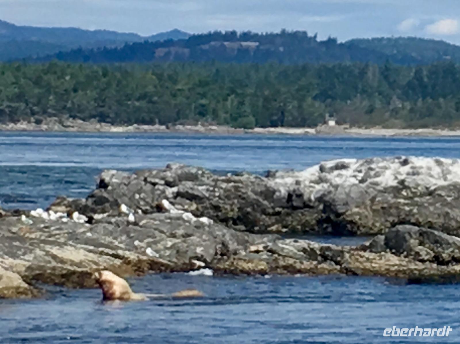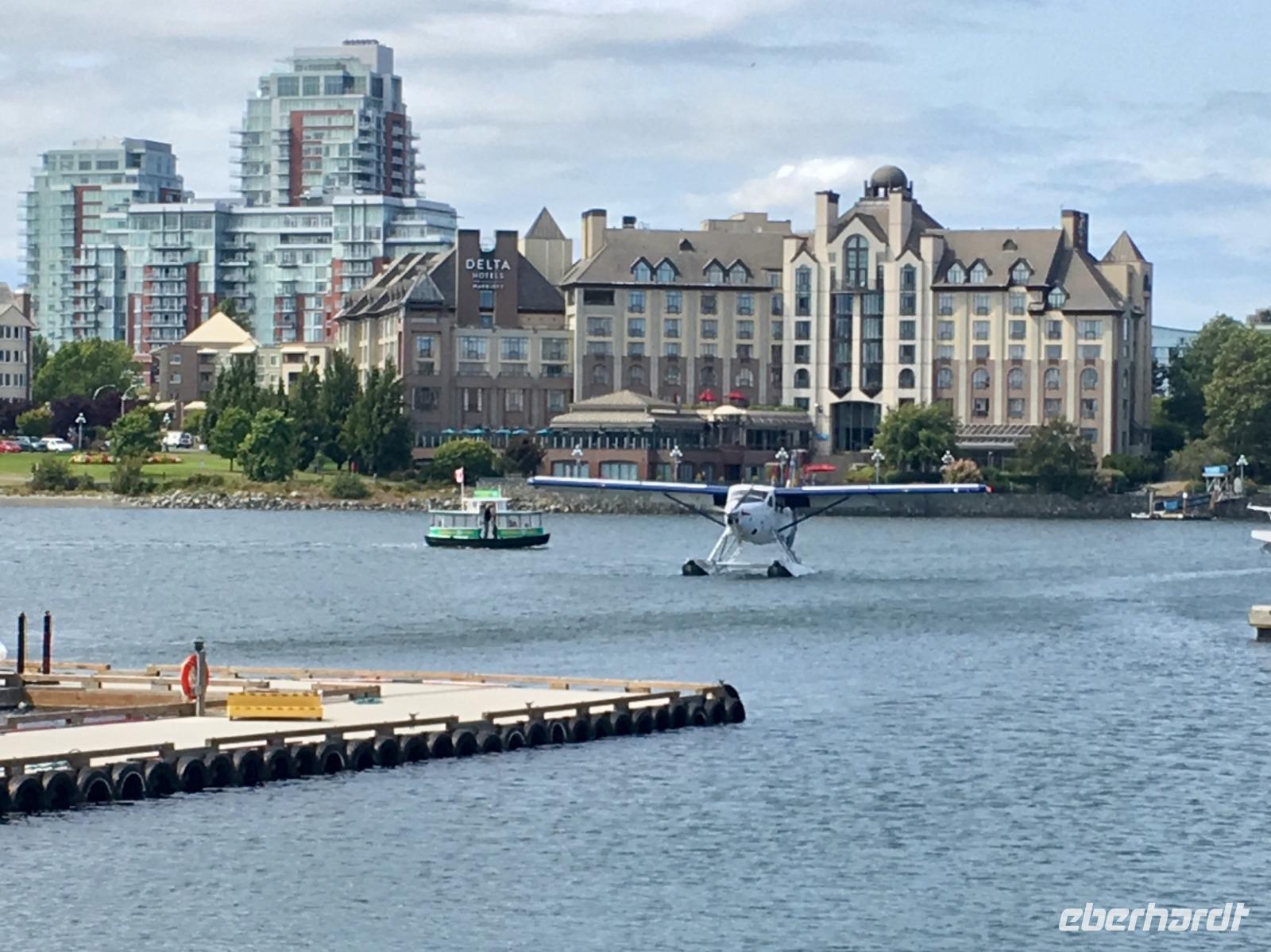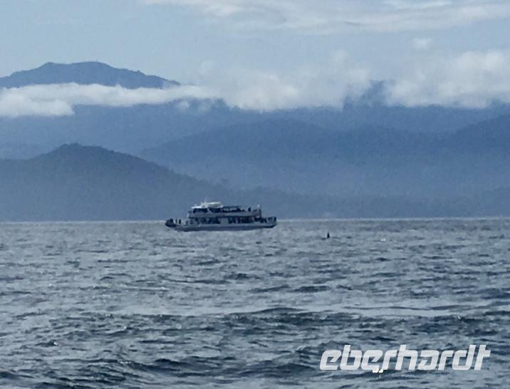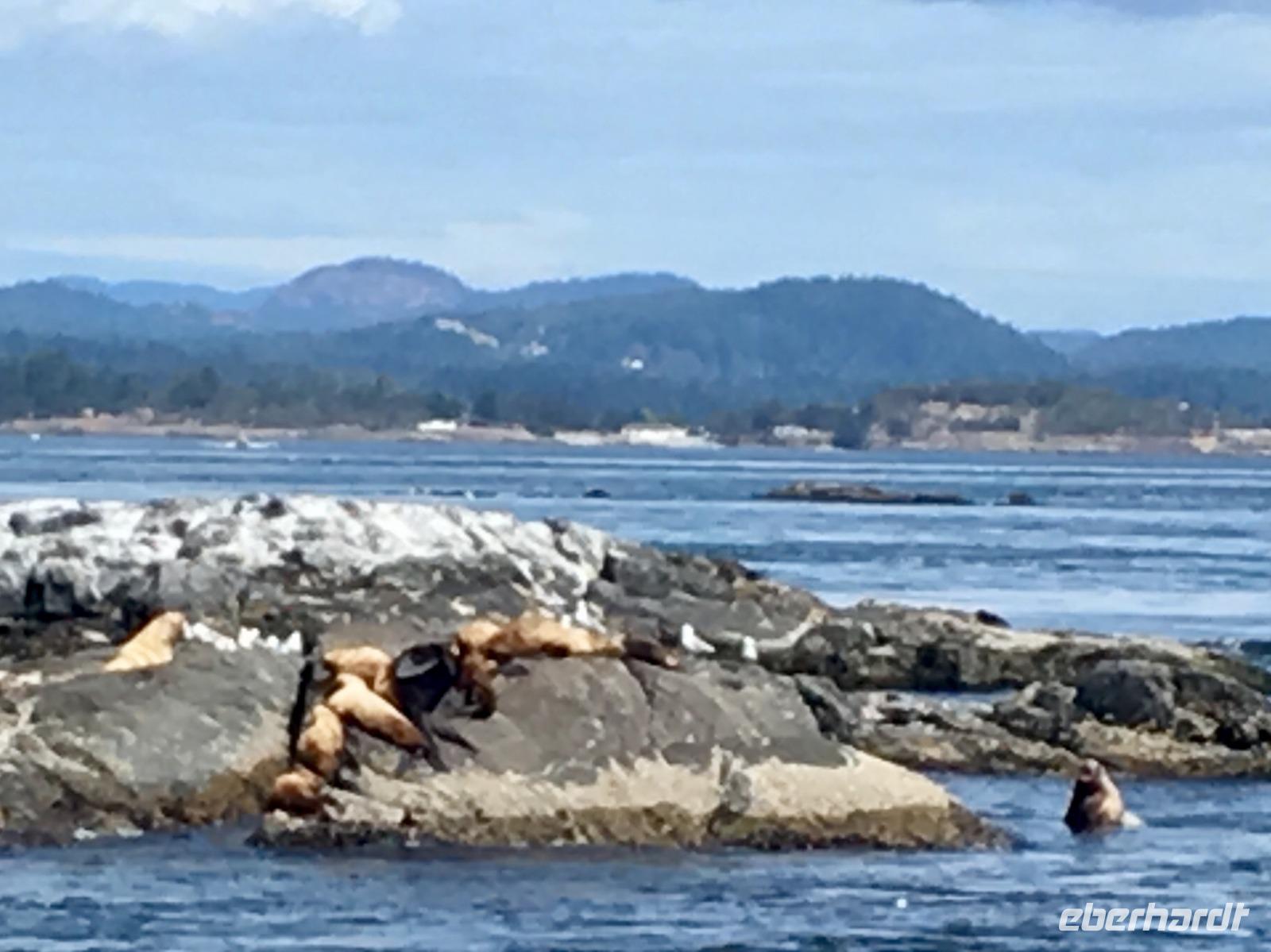 Das Fruehstueck wird heute in der damaligen Lobby dieses Hotels serviert. Wir werden so verwoehnt, wie wird das wohl daheim, wenn wir wieder unser eigenes Fruehstueck herrichten muessen ? Wer macht die Eggs Benedict ? Nun gehts aber weiter zum naechsten Erlebniss, wir werden von einem Minibus beim Hotel abgeholt und zur Walbeobachtungs Station gefahren. Mit einem groesseren Schiff welches ca 100 Personen fasst, fahren wir nun aufs Meer hinaus. Wir sind bloss ca 50 Leute und so koennen alle auf die Aussendeck des Schiffes um den schoenen Hafen in freier Luft zu erleben. Vorerst fahren wir langsam aus dem Hafen raus und rauschen danach mit voller Kraft voran. Andere Boote saussen in die gleiche Richtung, als waere es ein Rennen. Wir halten den Kurs Suedwesten und hoffen auf eine Orca Familie. Ihr Habitat erstreckt sich auf ca 100 Km2 und auch wenn es hier 5 verschieden residente Familien von je ca 30 Tiere gibt, weiss man nie genau wo sie sich gerade aufhalten. Es gibt viele Spotter (Leute die Ausschau halten) in Victoria und Umgebung, aber niemand hat sich heute morgen gemeldet. Die See wird etwas wilder und wir saussen ueber die Wellen. Ploetzlich passierts, wir sehen schwarze Rueckenflossen die zu 3 Orcas gehoeren. Es sind transiente Killerwale, was fuer ein Riesenglueck. Residente Orcas zu sehen ist sehr schoen aber eine transiente Familie zu sichten ist aussergewoehnlich und wunderbar. Wir haben auch schoen Zeit und fahren langsam im gegebenen Abstand mit ihnen mit. Das Meer ist auch wieder ruhiger und viele Fotos werden geknipst. Auf einigen wenigen Bilder sind die Orcas auch tatsaechlicht zu sehen, die meisten Fotos zeigen jedoch viel Wasser ! Das Muttertier mit einem halbwuechsigen Jungen und ihrem Baby, vergnuegt sich und laesst sich durch die Walbeobachtungsboote nicht stoeren. Sie fressen und ruhen abwechslungsweise. Nun geht unsere Schiffahrt wieder in Richtung Victoria. Vorne sehen wir viele Moeven auf dem Wasser und andere Boote und Schiffe verlangsamen sich schon. Langsam fahren auch wir zu Race Rocks. Es ist eine Insel mit einem unbewohnten Leuchtturm. Ausser den Studenten die hier Ozean-Forschung treiben wird diese Insel auch von zahlreichen Seehunden, Olli dem Seeotter, California- und Stellar- Seeloewen bewohnt. Die Seehunde liegen wie Wuerstchen am Ufer der Insel, zahlreiche Kormorante ueberschauen die Szene und Olli uebt sich im Rueckenschwumm. Die Seeloewen sonnen sich auf den Felsen, sie sind auf dem Weg von Kalifornien nach Alaska. Sie stinken und grunzen gemuetlich vor sich hin. Nun sind die 3 Stunden um und es wird Zeit den Hafen von Victoria aufzusuchen. Viele unter uns haben fuer heute auch einen Flug mit einem Wasserflugzeug gebucht. Fuer eine halbe Stunde fliegen sie ueber die Hauptstadt Britisch Columbiens und entlang der Kueste. Es ist ein Erlebnis, besonders natuerlich der An- und Abflug im Hafen von Victoria. Der Rest des Nachmittages gestaltet sich jeder selbst und wir treffen uns wieder zu unserem Abschiedsessen. Unser Abschiedsmal wird im Empress Hotel selbst serviert, zur Auswahl gibt es Steak, Lachs, Mistkratzerli (Junges Haehnchen) oder...oder...oder ein Tofugericht ? Es schmeckt alles sehr lecker, schaut sehr schoen aus und das Ambiente ist gediegen. Einige gehen danach noch tanzen ins Pub andere muessen noch packen da wir morgen in aller Herrgotts Frueh schon abfahren muessen um unserern Flieger nach Hause zu erwischen. Der Abend im Pub wird sehr lustig und das Tanzbein wird kraeftig geschwungen. Bald wird es Nacht, bald haben wir bloss noch 3 Stunden Zeit zum Schlafen. Gut, dass es morgen einen langen Flug geben wird.
