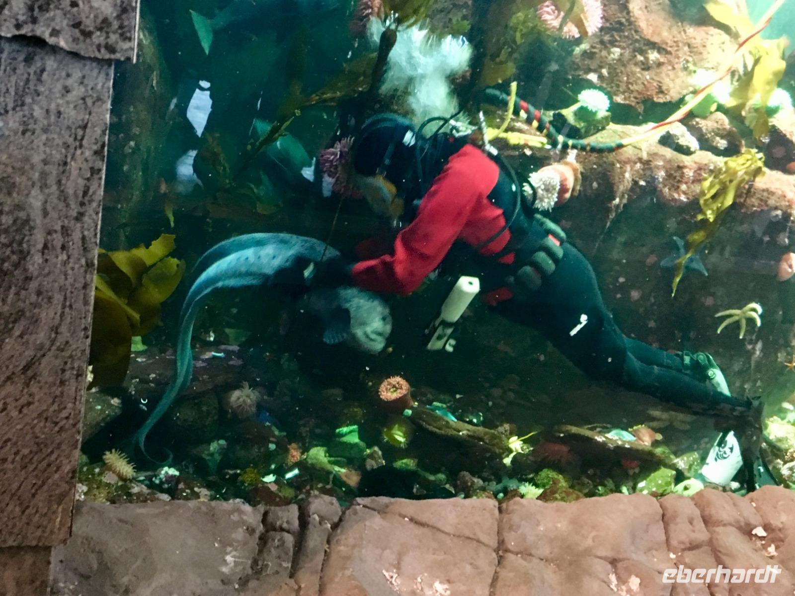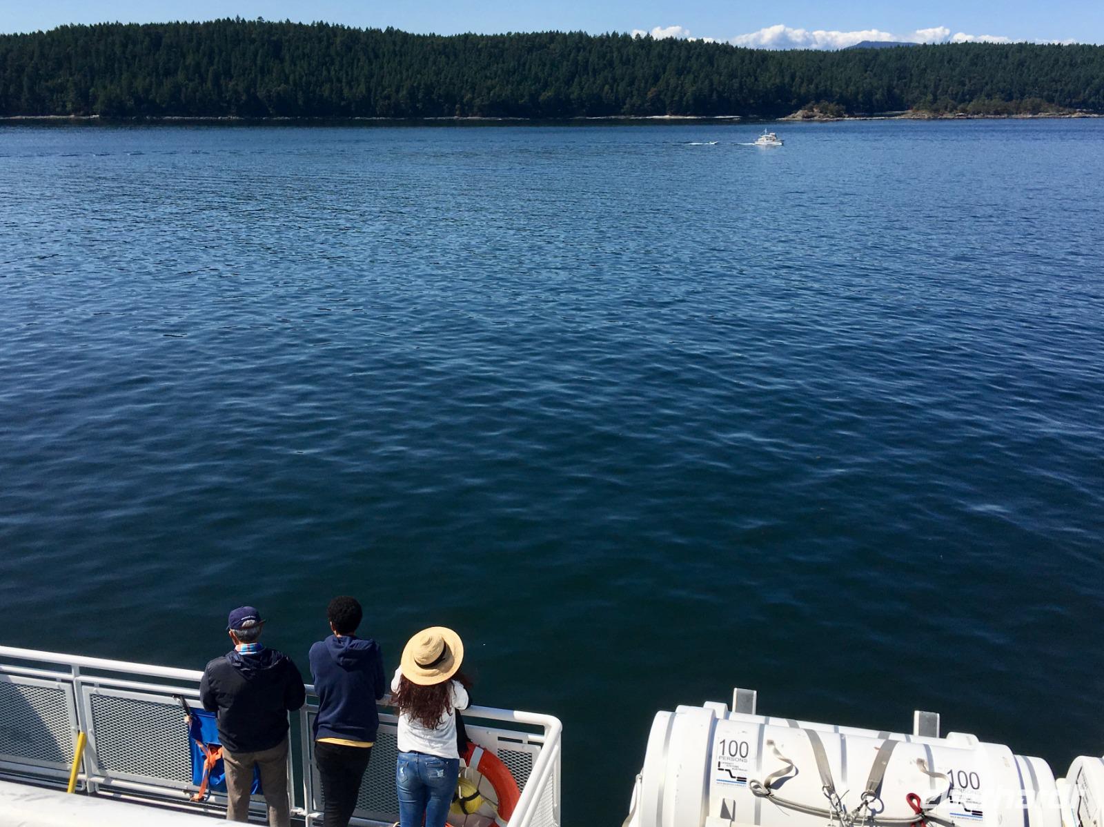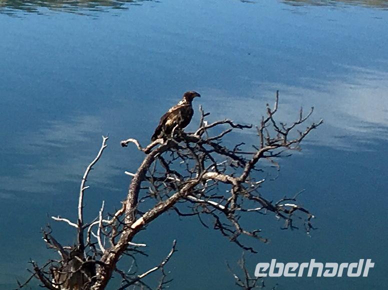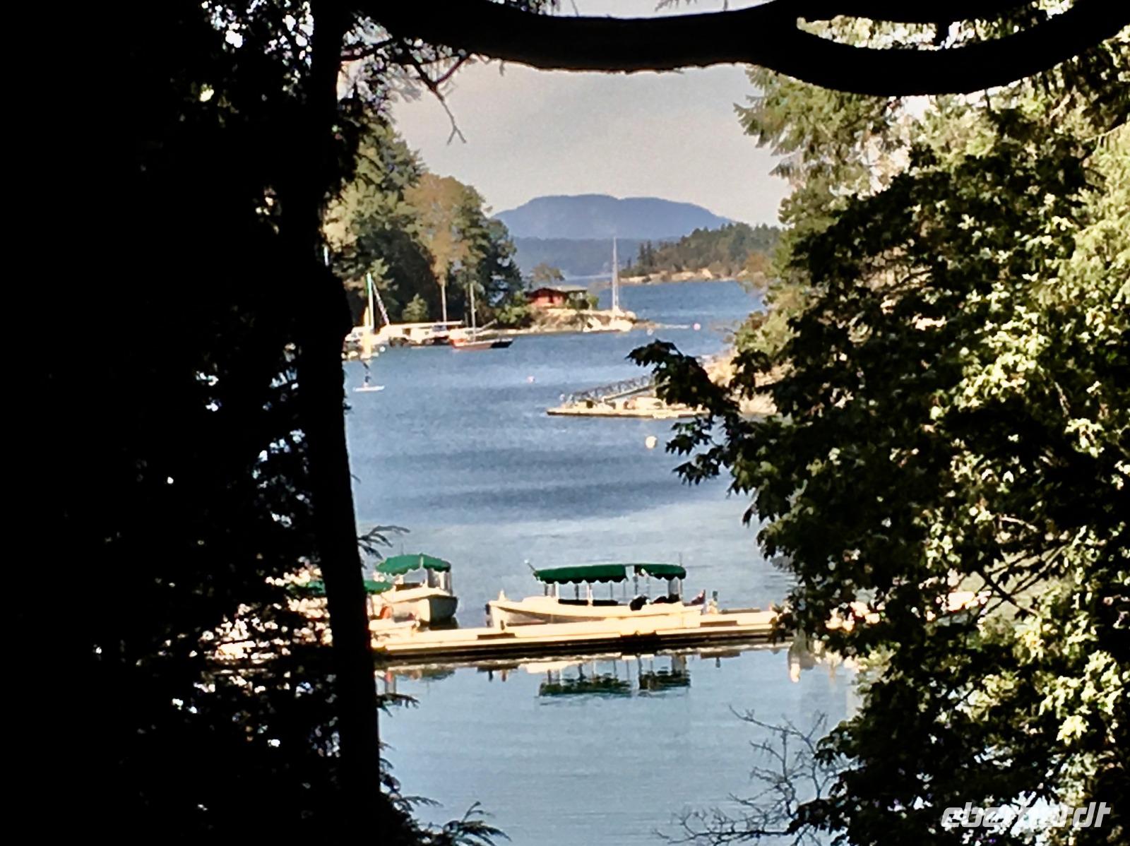 Das Fruehstueck wird heute in der damaligen Lobby dieses Hotels serviert. Wir werden so verwoehnt, wie wird das wohl daheim, wenn wir wieder unser eigenes Fruehstueck herrichten muessen ? Wer macht die Eggs Benedict ? Nun gehts aber weiter zum naechsten Erlebniss, wir werden von einem Minibus beim Hotel abgeholt und zur Walbeobachtungs Station gefahren. Mit einem groesseren Schiff welches ca 100 Personen fasst, fahren wir nun aufs Meer hinaus. Wir sind bloss ca 50 Leute und so koennen alle auf die Aussendeck des Schiffes um den schoenen Hafen in freier Luft zu erleben. Vorerst fahren wir langsam aus dem Hafen raus und rauschen danach mit voller Kraft voran. Andere Boote saussen in die gleiche Richtung, als waere es ein Rennen. Wir halten den Kurs Suedwesten und hoffen auf eine Orca Familie. Ihr Habitat erstreckt sich auf ca 100 Km2 und auch wenn es hier 5 verschieden residente Familien von je ca 30 Tiere gibt, weiss man nie genau wo sie sich gerade aufhalten. Es gibt viele Spotter (Leute die Ausschau halten) in Victoria und Umgebung, aber niemand hat sich heute morgen gemeldet. Die See wird etwas wilder und wir saussen ueber die Wellen. Ploetzlich passierts, wir sehen schwarze Rueckenflossen die zu 3 Orcas gehoeren. Es sind transiente Killerwale, was fuer ein Riesenglueck. Residente Orcas zu sehen ist sehr schoen aber eine transiente Familie zu sichten ist aussergewoehnlich und wunderbar. Wir haben auch schoen Zeit und fahren langsam im gegebenen Abstand mit ihnen mit. Das Meer ist auch wieder ruhiger und viele Fotos werden geknipst. Auf einigen wenigen Bilder sind die Orcas auch tatsaechlicht zu sehen, die meisten Fotos zeigen jedoch viel Wasser ! Das Muttertier mit einem halbwuechsigen Jungen und ihrem Baby, vergnuegt sich und laesst sich durch die Walbeobachtungsboote nicht stoeren. Sie fressen und ruhen abwechslungsweise. Nun geht unsere Schiffahrt wieder in Richtung Victoria. Vorne sehen wir viele Moeven auf dem Wasser und andere Boote und Schiffe verlangsamen sich schon. Langsam fahren auch wir zu Race Rocks. Es ist eine Insel mit einem unbewohnten Leuchtturm. Ausser den Studenten die hier Ozean-Forschung treiben wird diese Insel auch von zahlreichen Seehunden, Olli dem Seeotter, California- und Stellar- Seeloewen bewohnt. Die Seehunde liegen wie Wuerstchen am Ufer der Insel, zahlreiche Kormorante ueberschauen die Szene und Olli uebt sich im Rueckenschwumm. Die Seeloewen sonnen sich auf den Felsen, sie sind auf dem Weg von Kalifornien nach Alaska. Sie stinken und grunzen gemuetlich vor sich hin. Nun sind die 3 Stunden um und es wird Zeit den Hafen von Victoria aufzusuchen. Viele unter uns haben fuer heute auch einen Flug mit einem Wasserflugzeug gebucht. Fuer eine halbe Stunde fliegen sie ueber die Hauptstadt Britisch Columbiens und entlang der Kueste. Es ist ein Erlebnis, besonders natuerlich der An- und Abflug im Hafen von Victoria. Der Rest des Nachmittages gestaltet sich jeder selbst und wir treffen uns wieder zu unserem Abschiedsessen. Unser Abschiedsmal wird im Empress Hotel selbst serviert, zur Auswahl gibt es Steak, Lachs, Mistkratzerli (Junges Haehnchen) oder...oder...oder ein Tofugericht ? Es schmeckt alles sehr lecker, schaut sehr schoen aus und das Ambiente ist gediegen. Einige gehen danach noch tanzen ins Pub andere muessen noch packen da wir morgen in aller Herrgotts Frueh schon abfahren muessen um unserern Flieger nach Hause zu erwischen. Der Abend im Pub wird sehr lustig und das Tanzbein wird kraeftig geschwungen. Bald wird es Nacht, bald haben wir bloss noch 3 Stunden Zeit zum Schlafen. Gut, dass es morgen einen langen Flug geben wird.