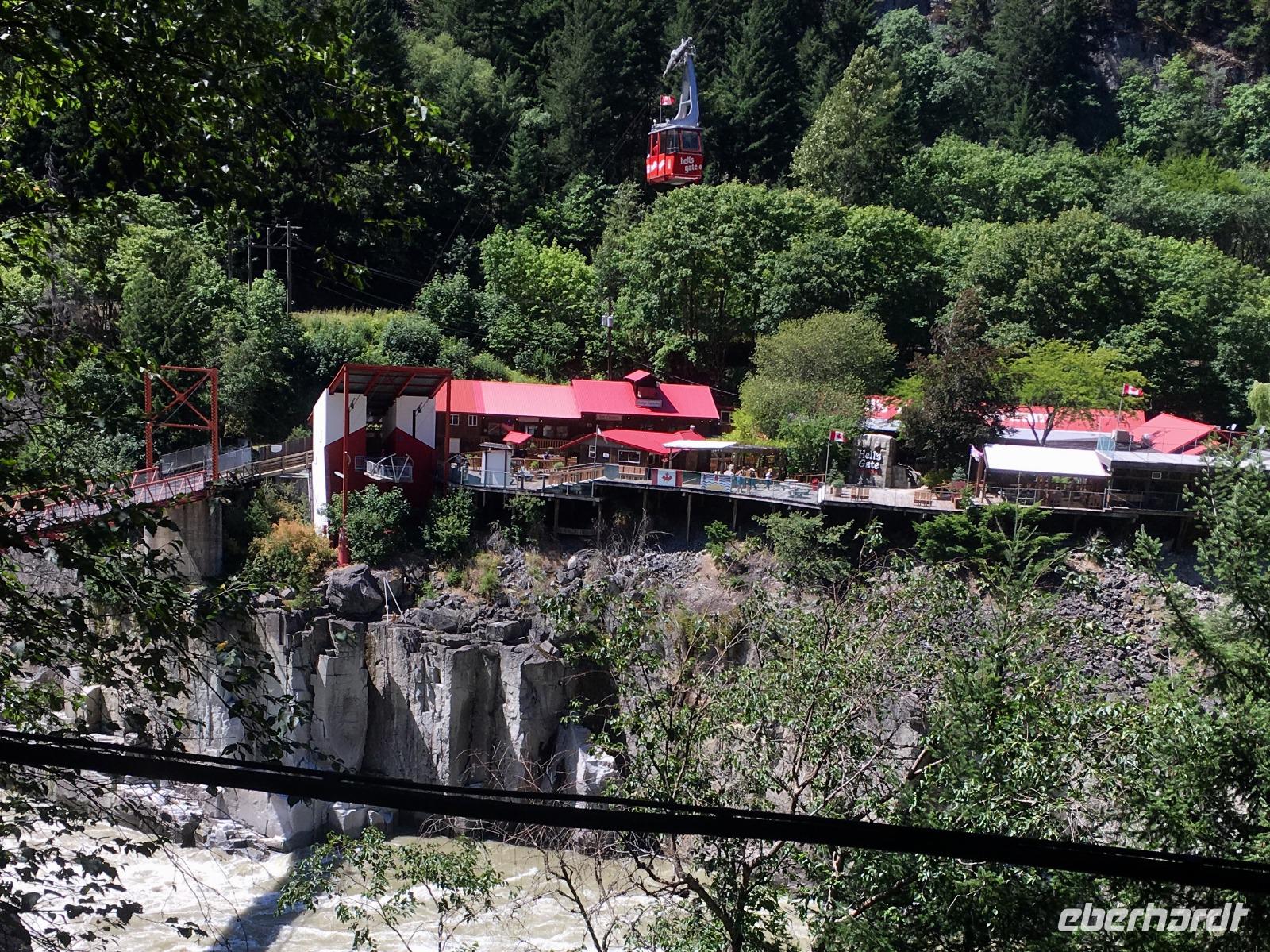 Wir wachen in Kamloops auf, unser Hotel scheint voll zu sein mit Reisegaesten die alle auf denselben Zug nach Vancouver reisen moechten. Um 6:00 schlafen alle noch und es herrscht totenstille in den Gaengen. Um 6:30 Uhr hallt, droehnt und rauscht es aus allen Zimmer. Eiligst bereiten sich die 300 von den insgesamt 540 Reisegaesten auf die bevorstehende Zugreise vor. Duschen, Zaehne putzen, anziehen, Koffer zu klappen und abschliessen. Diesen nun im Zimmer alleine stehen lassen und geschwind zur Rezeption eilen um den Bus um 7:20 ja nicht zu verpassen. Nun wird es wieder gemuetlich, wir sind in besten Haenden des Rocky Mountaineer Personals, Bus transfer, einsteigen in den Zug, Platz im Domwagen einnehmen und schon faengt das verwoehnen wieder an. Warme Handtuecher werden ausgeteilt, ist das fuer jene gedacht, die keine Zeit fanden heute in der Frueh sich den Hals zu waschen ? Ein herrliches Fruehstueck wird uns wieder serviert waehrend dem wir durch die wuestenaehnliche Gegend fahren. Russiche Olivenbaeume, Bueschelgrass und wilder Salbei begleiten uns. Wir fahren erst durch ein Indianerreservat zum Kamploops See. Dieser ist sehr lang, fast 30 Km und wir geniessen herrliche Aussichten. Keine Boote sind darauf zu sehen er glitzert einsam fuer uns alleine. Der 22 Wagon lange Zug windet sich dem Ufer entlang und wir muessen nur ab und zu den Gueterzuegen Vorrang gewaehren, denn die Tunnels sind bloss einspurig. Daraufhin folgen wir dem Thompson Fluss bis er sich nicht in den maechtigen Fraser Fluss stuerzt. Die beiden Fluesse haben unterschiedliche Temperaturen und fuehren verschiedene Mineralien, deshalb bleiben sie auch ein zeitlang getrennt im selben Flussbett, was wir als zweifarbigen Fluss sehen. Wunderbare Fotos werden nun vom Fraser Canyon geknipst und lustigen Geschichten horchen wir zu. So hoeren wir Geschichten von legendaeren kanadischen Pionieren und staunen ueber diese wunderbare Welt die sich uns hier zeigt. Die Zeit vergeht sehr schnell und bald ist schon wieder Zeit fuer Apero und Mittagessen. Der Lachs ist wieder mmmmm so fein. Der Fraser Fluss wird ploetzlich ganz eng und die Tonnen Wasser muessen nun durch eine Schlucht. Das Wasser steht auf, es fluechtet und wuetet indem es sich durch den Canyon zwaengt. Schon Simon Fraser hatte damals diese Stelle «Hells Gate», das Hoellentor, genannt. Bald darauf erstreckt sich das Flussbett wieder weit und breit sodass Gemuetlichkeit wieder einkehren kann. Die Gegend veraendert sich auch sehr, was vor dem Mittagessen noch als braune und wuestenaehnliche Huegellandschaft auf uns schaute, ist jetzt dichter Wald in tiefem Gruen mit schrofen vulkangezeichneten Bergen. Aber bei Hope, es ist nun 14:00 Uhr, stockt ploetzlich unser Zug. So viel Verkehr ist auf der Schiene, dass wir warten muessen bis die verschiedenen Gueterzuege durchziehen. Ein Stuendchen spaeter befinden wir uns im Fraser Valley welches uns durch ein fruchtbares Anbaugebiet nach Vancouver begleitet. Unser Hotel, das Pan Pacific Hotel Vancouver, ist im Zentrum Vancouvers gelegen. Wunderbar, wir gehen auch gleich auf einen Spaziergang dem Nordufer Vancouvers entlang und danach in ein Pub um noch einen Happen zu essen. Was fuer einen wunderschoenen Tag haben wir heute erlebt, danke Eberhardt, danke Rocky Mountaineer, danke Portmonnaie und gute Nacht.