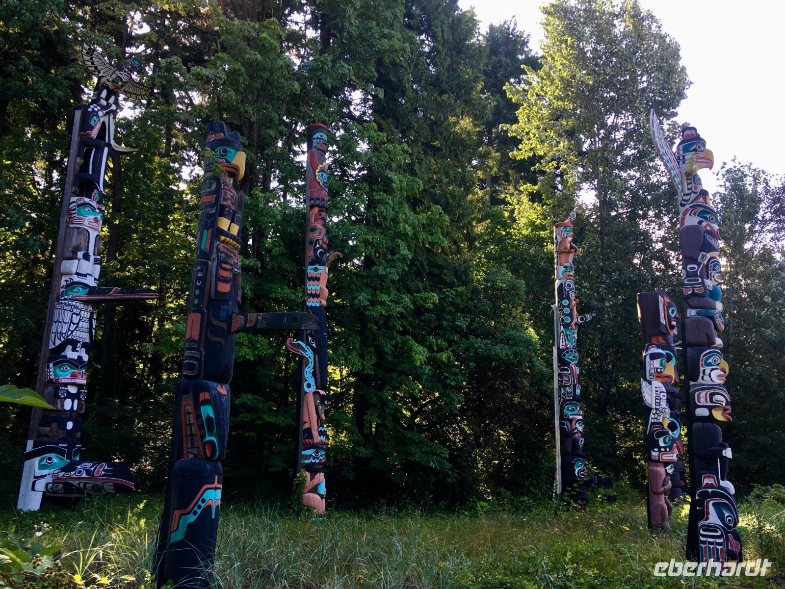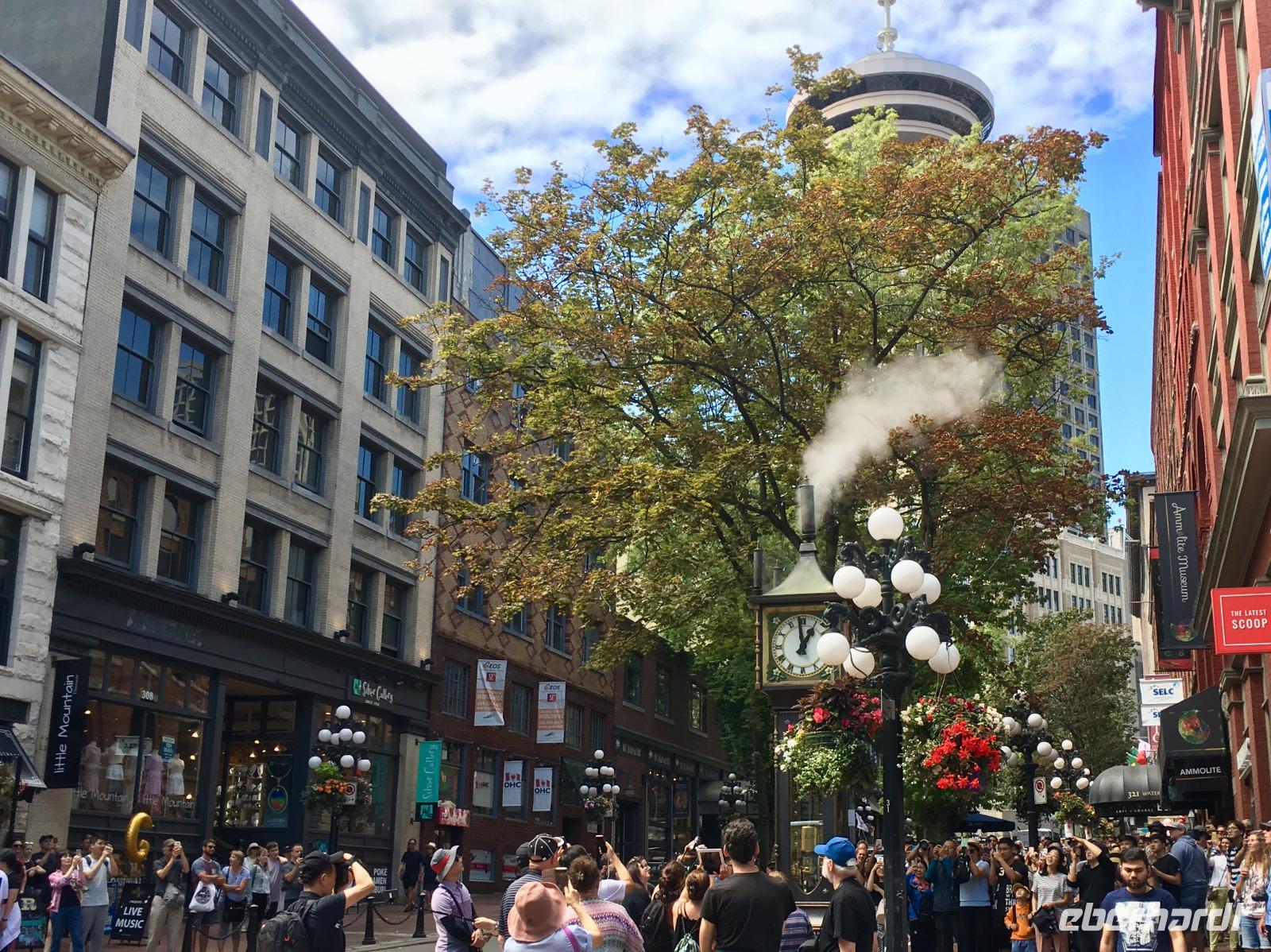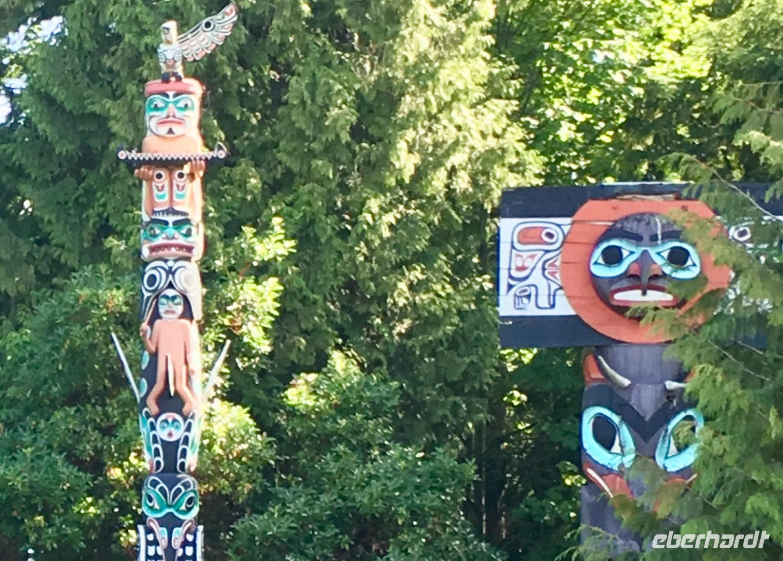 Aufwachen in der groessten Stadt Britisch Kolumbiens ist etwas lauter als in Lake Louise am See, aber eindruecklich ist es alleweil. Nach dem Fruehstuecksbuffet treffen wir uns fuer die angekuendigte Stadtrundfahrt. Ein schicker, schwarzer Bus steht puenktlichst bereit und unserer heutige Chauffeur ist der charmante Brandon. Vorerst fahren wir in den Stanley Park. Bei den Totompfaehle halten wir an und horchen den vielen Indianergeschichten zu und staunen ueber die schoenen Geschichtserzaehlende Pfaehle der verschiedenen Indianerstaemme der Westkueste Kanadas. Die Aussicht auf die Stadt Vancouvers ist auch sehr eindruecklich. Bei so einem schoenen Wetter gelingen die Fotos perfekt. Nun fahren wir gemuetlich um die ganze Halbinsel, geniessen, halten, schauen und erreichen so Granville Island. Hier legen wir einen Halt ein und spazieren an Theater, Bars und Kunsthandwerker vorbei bis zur grossen Markthalle. So viel Obst, Gemuese, frische Teigwaren, Brote, Wurst und Fleischwaren werden hier feilgeboten. Es ist eine Pracht. Beim Fischhaendler erfahren wir auch den Unterschied von den verschiedenen geraeucherten Lachsen und welche fuer welchen Zweck verwendbar sind. Da muessen wir nochmals hin, denn im Moment wartet Brandon schon auf uns mit seinem schicken schwarzen Limousinen-Bus. Jetzt gehts zum Queen Elizabeth Park mit seinem schoenen Mini-Butcharts Garden und noch einer herrlichen Aussicht auf die Stadt hinunter. Auf gehts, weiter auf unserer Citytour nach Chinatown. Es ist das 3. groesste Chinatown ausserhalb Chinas. Wir spazieren durch den chinesischen Garten und danach auch durch die Hauptstrasse von Chinatown. Getrocknete und gesalzene Garnelen, schrumpfige Seegurken und andere Meeresfruechte und Nuesse jeder Art, sowie sonst uns unbekannte Speisen werden hier feilgeboten. Bloss Asiaten kaufen hier anscheinend ein, denn alles ist auf chinesisch beschrieben und wir verstehen bloss Bahnhof. Die Geschichte der Chinesen in Kanada wird hier so richtig lebendig. Danach fahren wir an der japanischen Markthalle vorbei, ehe wir in Gastown landen. Da steigen wir auch wieder aus um die Dampfuhr schlagen zu hoeren und sehen. Ein weiteres Erlebniss. Schliesslich haben wir morgen frei, und so wissen wir dann auch schon, ob wir hierher zurueck wollen oder nicht. Die vielen Souveniergeschaefte locken schon mit den lustigen Pijamas, Hockeyshirts, Nummernschilder, Anhaengsel und Mitbringsel. Die Fahrt geht weiter bis zum Canada Place wo auch unser Hotel ist. Den Nachmittag haben wir frei und wir treffen uns erst spaeter wieder zum Spaziergang zur Alberni Street, zum Keg Restaurant. Dies Restaurant mit den Staeks, Hummer und Riesengarnelen wird uns immer in Erinnerung bleiben.