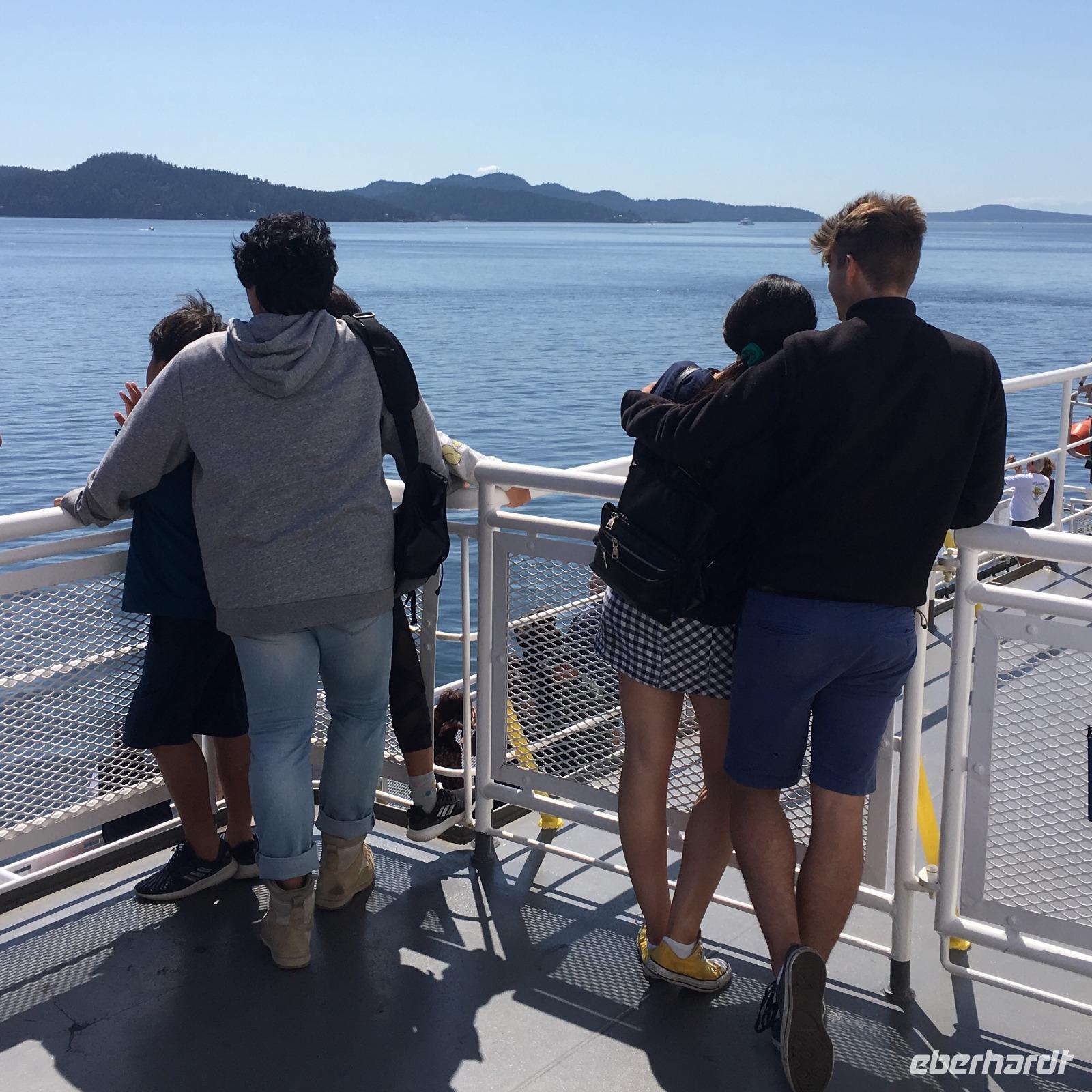 Es ist erst 5:45 Uhr in der Frueh und es klingelt bereits ! Autsch, der Kopf ist so schwer ! Aufstehen, duschen, Zaehne putzen, Koffer schliessen und bereitstellen. Noch im Halbschlaf steigen wir ¾ Stunde spaeter in einen Riesenbus der uns auf die Faehre und danach aufs Festland und zum Flughafen von Vancouver faehrt. Wir checken mit anderen 600 Gaesten ein, es wimmelt nur so von Flugpassagiere und Koffer, doch wir finden bald eine Schlange die bloss 20 Personen hat ?. Wir verabschieden uns vorerst von dem Paeaerchen, welches nach Toronto weiterfliegt und gehen weiter zur Kontrolle. Bald heisst es auch fuer uns alle Abschied nehmen da wir ueberall auf dem Flieger verteilt sind und es nach Ankunft manchmal schnell gehen muss, um den Zug, Anschlussflieger, Verwandtschaft und Freunde zu erwischt. Wir sind tatsaechlich ½ Stunde verspaetet gelandet !