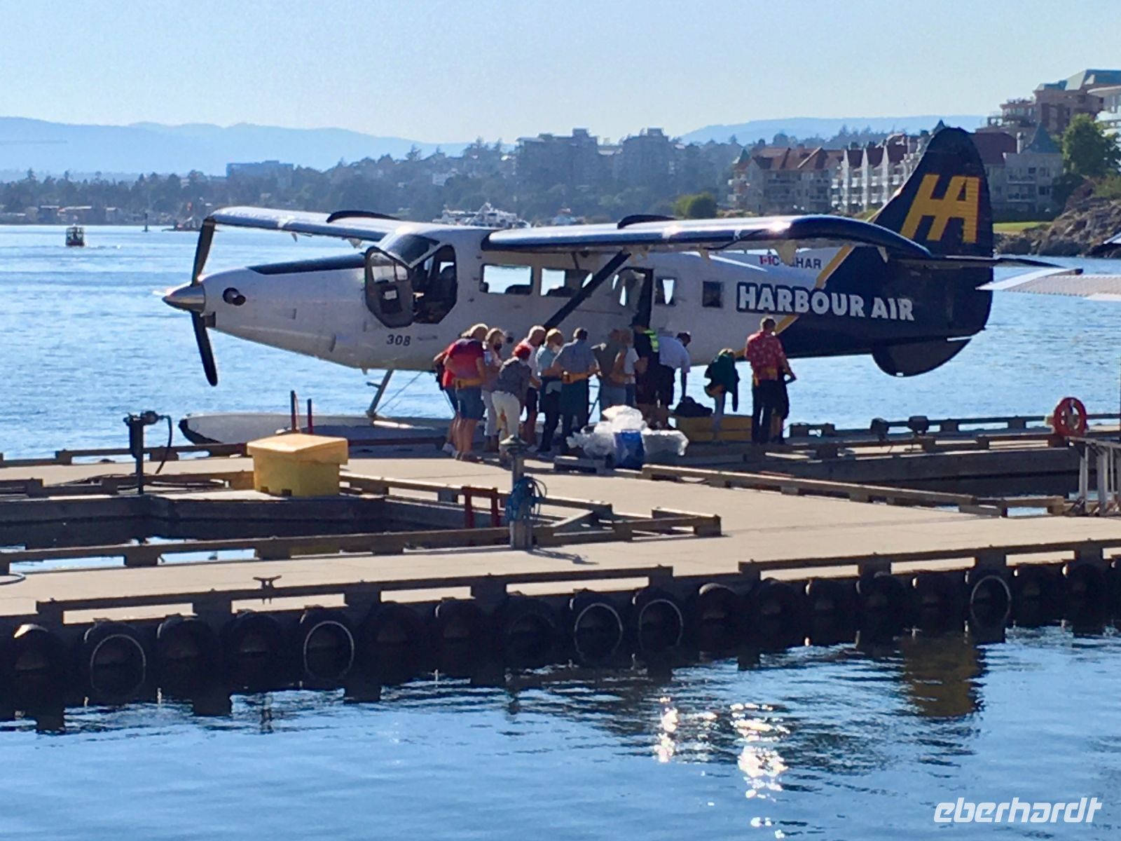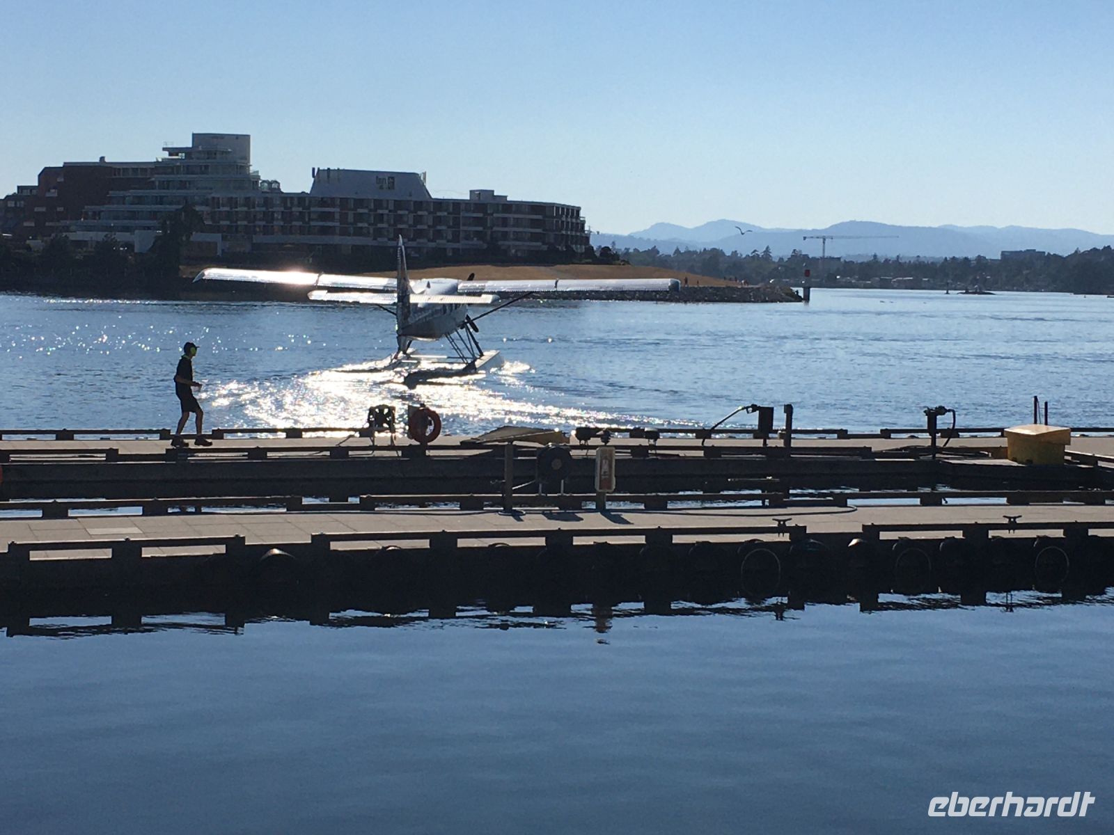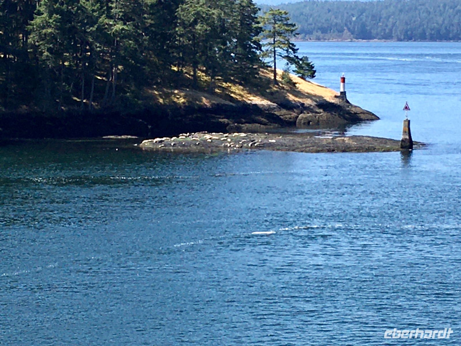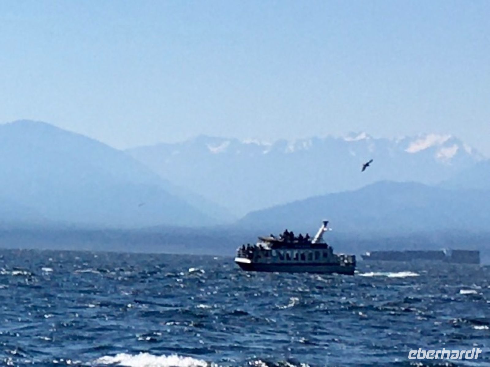 Das Fruehstueck wird heute in der damaligen Lobby dieses Hotels serviert. Wir werden so verwoehnt, wie wird das wohl daheim, wenn wir wieder unser eigenes Fruehstueck herrichten muessen ? Wer macht die Eggs Benedict ? Nun gehts aber weiter zum naechsten Erlebniss, wir spazieren regelrecht ueber die Strasse knipsen noch ein paar lustige Fotos mit/auf/um das “Canada” Zeichen und sind alsobald bereit fuer die Walbeobachtung. Mit einem groesseren Schiff welches ca 100 Personen fasst, fahren wir nun aufs Meer hinaus. Wir sind bloss ca 60 Leute und so koennen alle auf die Aussendecks des Schiffes um den schoenen Hafen in freier Luft zu erleben. Vorerst fahren wir langsam aus dem Hafen raus und rauschen danach mit voller Kraft voran. Andere Boote saussen in die gleiche Richtung, als waere es ein Rennen. Wir halten den Kurs Suedwesten und hoffen auf eine paar Buckelwale zu stossen. Es gibt viele Spotter (Leute die Ausschau halten) in Victoria und Umgebung und jemand hatte sich heute morgen gemeldet. Die See wird etwas wilder und wir saussen ueber die Wellen. Ploetzlich passierts, wir sehen eine Wasserfontaine, danach auch gleich etwas dunkles welches auch bald darauf im tiefen blau des Wassers verschwindet. Wir haben schoen Zeit und fahren langsam im gegebenen Abstand mit ihm mit. Immer wieder sieht man die Fontaine und danach was dunkles aber irgendwie will dieser Wal nicht abtauchen und so sehen wir die pitoreske Schwanzflosse nicht. Ach schau, es sind doch gleich 2 Buckelwale die da herumziehen, aber abtauchen ist auch nach 15 Minuten nicht ihr Spiel. Viele Fotos werden geknipst aber viele zeigen bloss viel Wasser und Himmel ! Also entschliesst unser Kapitaen weiter zu segeln. Da vorne, wieder eine Fontaine, oh gleich zwei, und einen gebogenen Ruecken und gleich auch die lang ersehnte Schwanzflosse. Jetzt, gleich nocheinmal und nocheinmal. Wir koennen unserem Glueck kaum glauben als sich das Muttertier seitlich legt und uns mit der Seitenfinne zuwinkt, es ist wie im Film, wir sind uebergluecklich. Aber das Beste kommt am Ende der Vorstellung, als sich der Buckelwal dreht und mit dem Schwanz kraftvoll aufs Wasser klatscht. WOW. Nun geht unsere Schiffahrt wieder in Richtung Victoria. Vorne sehen wir viele Moeven auf dem Wasser und andere Boote und Schiffe verlangsamen sich schon. Langsam fahren auch wir zu Race Rocks. Es ist eine Insel mit einem unbewohnten Leuchtturm. Ausser den Studenten die hier Ozean-Forschung treiben wird diese Insel auch von zahlreichen Seehunden sowie California- und Stellar-Seeloewen bewohnt. Die Seehunde liegen wie Wuerstchen am Ufer der Insel, wobei die Seeloewen lauthals grunzen und sich um den besten Platz bemuehen. Zahlreiche Kormorante und Moewen ueberschauen die Szene. Die Seeloewen sonnen sich auf den Felsen, sie sind auf dem Weg von Kalifornien nach Alaska. Sie stinken und grunzen genuesslich vor sich hin. Nun sind die 3 Stunden um und es wird Zeit den Hafen von Victoria aufzusuchen. Viele unter uns haben fuer heute Nachmittag auch einen Flug mit einem Wasserflugzeug gebucht. Fuer eine halbe Stunde fliegen sie ueber die Hauptstadt British Columbias und entlang der Kueste. Es ist ein Erlebnis, besonders natuerlich der An- und Abflug im inneren Hafen von Victoria. Unser Abschiedsmal wird im Empress Hotel selbst serviert, zur Auswahl gibt es auch heute wieder so viele Speisen, dass es uns kein Leichtes ist, das geeignetste Mahl auszusuchen. ? Es schmeckt alles sehr lecker, schaut sehr schoen aus und das Ambiente ist gediegen. Fast alle gehen danach noch ins Pub andere muessen jedoch noch packen da wir morgen doch abfahren muessen um unserern Flieger nach Hause zu erwischen. Heute verabschieden wir uns auch von einem Paar, welches noch laenger hier auf Vancouver Island bleiben wird. Der Abend im Pub wird sehr lustig, das Tanzbein wird zwar nicht geschwungen, aber zugeschaut und gelacht haben wir viel. Bald wird es Nacht, bald haben wir bloss noch einige Stunden Zeit zum Schlafen. Gut, dass es morgen einen langen Flug geben wird.