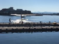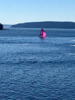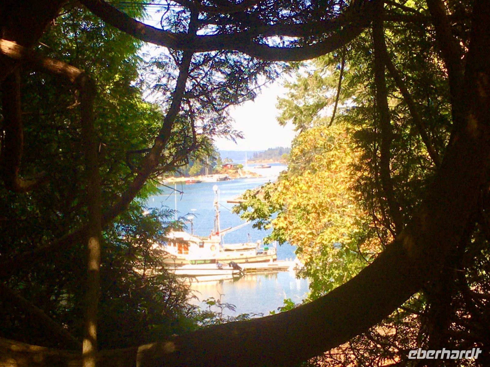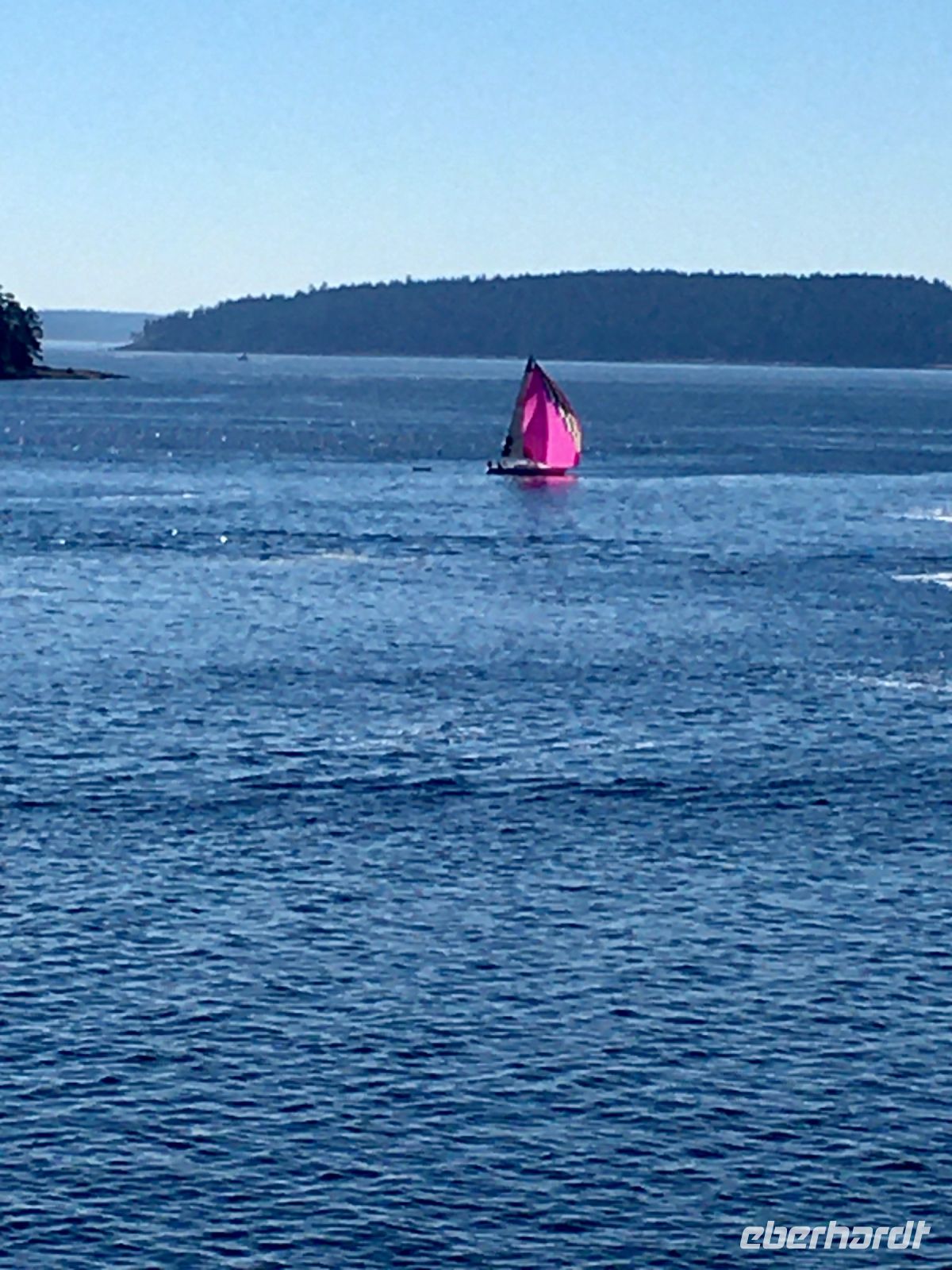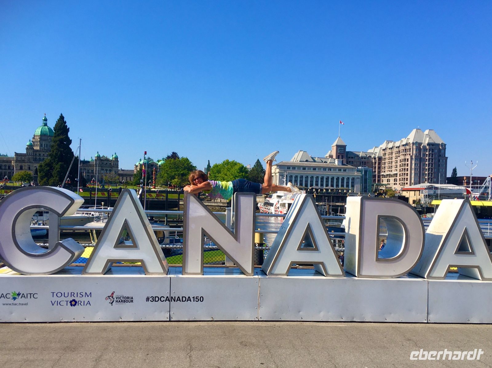 Das Fruehstueck wird heute in der damaligen Lobby dieses Hotels serviert. Wir werden so verwoehnt, wie wird das wohl daheim, wenn wir wieder unser eigenes Fruehstueck herrichten muessen ? Wer macht die Eggs Benedict ? Nun gehts aber weiter zum naechsten Erlebniss, wir spazieren regelrecht ueber die Strasse knipsen noch ein paar lustige Fotos mit/auf/um das “Canada” Zeichen und sind alsobald bereit fuer die Walbeobachtung. Mit einem groesseren Schiff welches ca 100 Personen fasst, fahren wir nun aufs Meer hinaus. Wir sind bloss ca 60 Leute und so koennen alle auf die Aussendecks des Schiffes um den schoenen Hafen in freier Luft zu erleben. Vorerst fahren wir langsam aus dem Hafen raus und rauschen danach mit voller Kraft voran. Andere Boote saussen in die gleiche Richtung, als waere es ein Rennen. Wir halten den Kurs Suedwesten und hoffen auf eine paar Buckelwale zu stossen. Es gibt viele Spotter (Leute die Ausschau halten) in Victoria und Umgebung und jemand hatte sich heute morgen gemeldet. Die See wird etwas wilder und wir saussen ueber die Wellen. Ploetzlich passierts, wir sehen eine Wasserfontaine, danach auch gleich etwas dunkles welches auch bald darauf im tiefen blau des Wassers verschwindet. Wir haben schoen Zeit und fahren langsam im gegebenen Abstand mit ihm mit. Immer wieder sieht man die Fontaine und danach was dunkles aber irgendwie will dieser Wal nicht abtauchen und so sehen wir die pitoreske Schwanzflosse nicht. Ach schau, es sind doch gleich 2 Buckelwale die da herumziehen, aber abtauchen ist auch nach 15 Minuten nicht ihr Spiel. Viele Fotos werden geknipst aber viele zeigen bloss viel Wasser und Himmel ! Also entschliesst unser Kapitaen weiter zu segeln. Da vorne, wieder eine Fontaine, oh gleich zwei, und einen gebogenen Ruecken und gleich auch die lang ersehnte Schwanzflosse. Jetzt, gleich nocheinmal und nocheinmal. Wir koennen unserem Glueck kaum glauben als sich das Muttertier seitlich legt und uns mit der Seitenfinne zuwinkt, es ist wie im Film, wir sind uebergluecklich. Aber das Beste kommt am Ende der Vorstellung, als sich der Buckelwal dreht und mit dem Schwanz kraftvoll aufs Wasser klatscht. WOW. Nun geht unsere Schiffahrt wieder in Richtung Victoria. Vorne sehen wir viele Moeven auf dem Wasser und andere Boote und Schiffe verlangsamen sich schon. Langsam fahren auch wir zu Race Rocks. Es ist eine Insel mit einem unbewohnten Leuchtturm. Ausser den Studenten die hier Ozean-Forschung treiben wird diese Insel auch von zahlreichen Seehunden sowie California- und Stellar-Seeloewen bewohnt. Die Seehunde liegen wie Wuerstchen am Ufer der Insel, wobei die Seeloewen lauthals grunzen und sich um den besten Platz bemuehen. Zahlreiche Kormorante und Moewen ueberschauen die Szene. Die Seeloewen sonnen sich auf den Felsen, sie sind auf dem Weg von Kalifornien nach Alaska. Sie stinken und grunzen genuesslich vor sich hin. Nun sind die 3 Stunden um und es wird Zeit den Hafen von Victoria aufzusuchen. Viele unter uns haben fuer heute Nachmittag auch einen Flug mit einem Wasserflugzeug gebucht. Fuer eine halbe Stunde fliegen sie ueber die Hauptstadt British Columbias und entlang der Kueste. Es ist ein Erlebnis, besonders natuerlich der An- und Abflug im inneren Hafen von Victoria. Unser Abschiedsmal wird im Empress Hotel selbst serviert, zur Auswahl gibt es auch heute wieder so viele Speisen, dass es uns kein Leichtes ist, das geeignetste Mahl auszusuchen. ? Es schmeckt alles sehr lecker, schaut sehr schoen aus und das Ambiente ist gediegen. Fast alle gehen danach noch ins Pub andere muessen jedoch noch packen da wir morgen doch abfahren muessen um unserern Flieger nach Hause zu erwischen. Heute verabschieden wir uns auch von einem Paar, welches noch laenger hier auf Vancouver Island bleiben wird. Der Abend im Pub wird sehr lustig, das Tanzbein wird zwar nicht geschwungen, aber zugeschaut und gelacht haben wir viel. Bald wird es Nacht, bald haben wir bloss noch einige Stunden Zeit zum Schlafen. Gut, dass es morgen einen langen Flug geben wird.