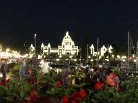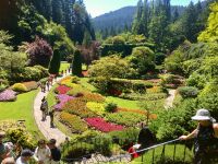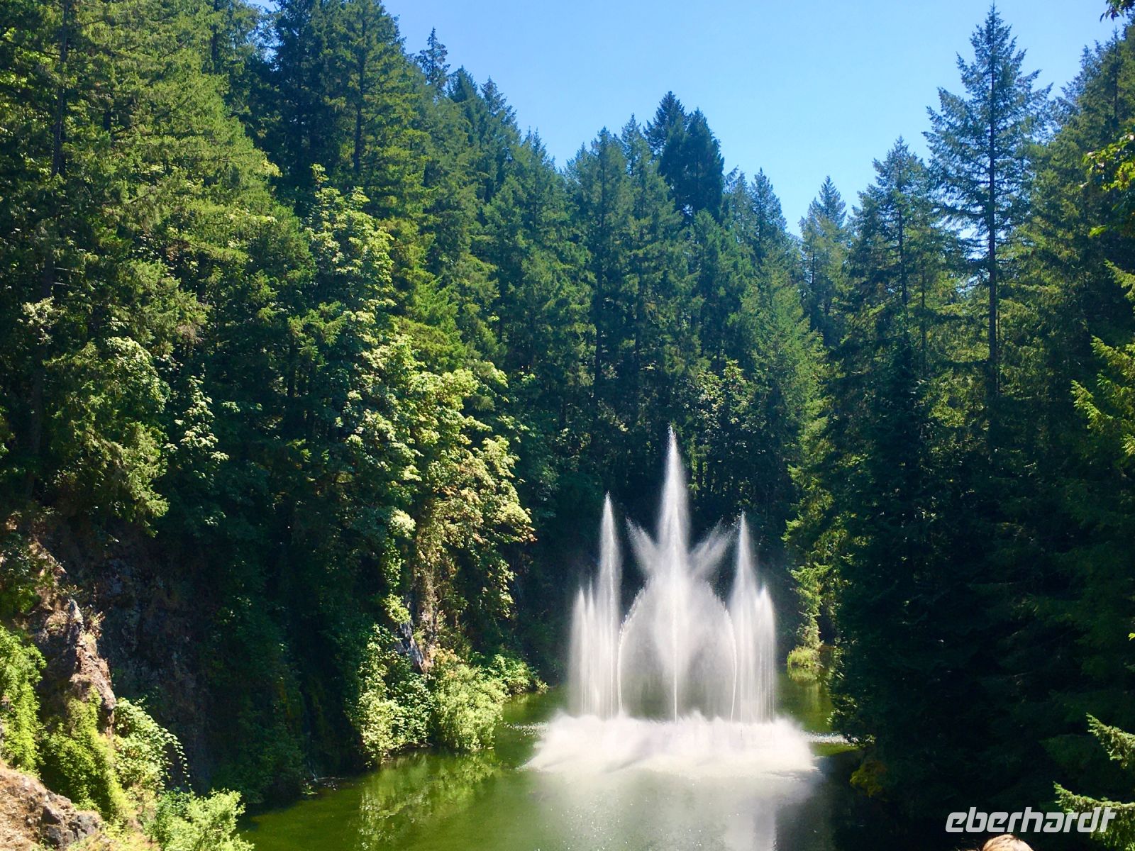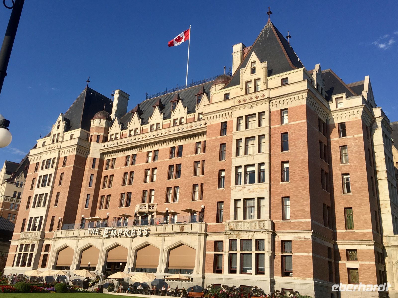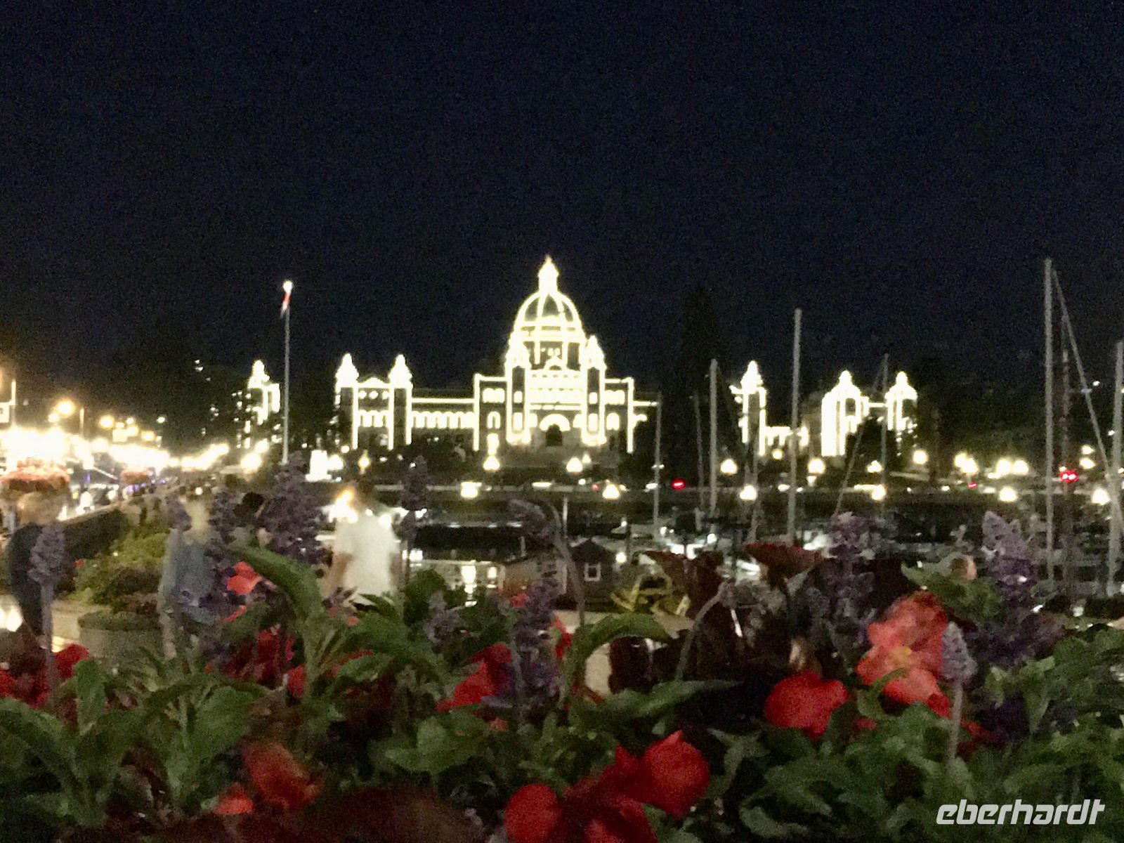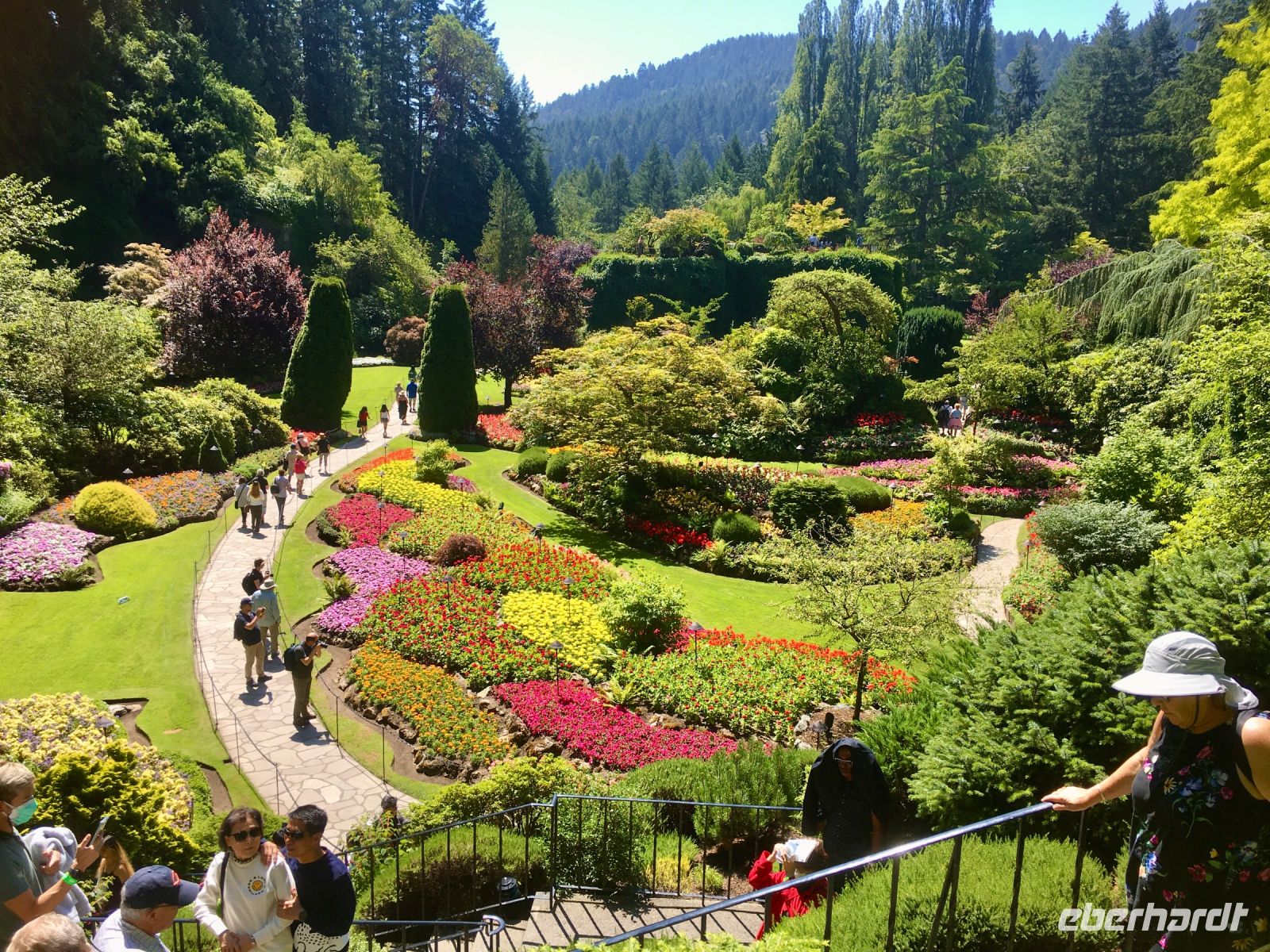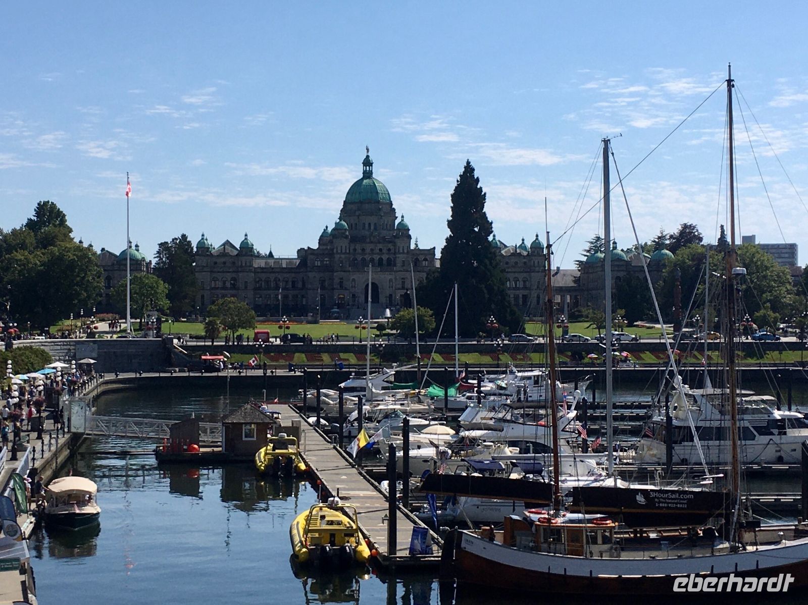 Heute fahren wir bereits um 8:30 Uhr ab, denn heute geht es auf die Insel von Vancouver. Unser Fahrer ist Gurpreet Lidhran. Auf der Fahrt zur Faehre erfahren wir nun vieles ueber das Leben in Kanada. Viele Fragen ueber das Gesundheitswesen, die Schulen, die Steuern usw werden beantwortet . Nun steht uns aber die schoene Faehreueberfahrt vor. Die Ueberfahrt auf die Insel dauert 1 Stunde und 35 Minuten. Auf der Insel angekommen fahren wir gleich zu den Butchart Gaerten. Schoen haben wir uns die Gaerten vorgestellt aber auf diese Pracht waren wir nicht vorbereitet. Nun verstehen wir aber, weshalb 1 Million Menschen diesen Ort jaehrlich aufsuchen. Die verschiedenen Gaerten sind echt toll. Der haengende Garten mit seinen riesen Begonien, der versunkene Garten mit der Ausgewogenheit und seinem Teich und Wasserspiel, der Farngarten, der Rosengarten mit seinen 250 Arten von Rosen und 2500 Pflanzen, der Japanische Garten der unser Leben bereichert, der franzoesische Garten mit seinem herrlichen Ausblick und der bezaubernde italiensiche Garten mit seinem perfekten Chaos, alle Gaerten sind so verschieden und so schoen angelegt man moechte einfach hier bleiben. Wir haben jedoch noch was vor, also essen wir noch eine Kleinigkeit hier im Garten ehe wir wieder in unseren Bus einsteigen. Wir fahren in die Hauptstadt British Columbias nach Victoria. Dort steigen wir in Chinatown aus und machen einen Stadtrundgang zu Fuss. Gurpreet freut sich sehr ueber das ueppige Trinkgeld und bringt unterdessen unsere Koffer und Taschen gewissenhaft und professionel ins Hotel. Chinatown ist sehr interessant und die Gassen hier sind sehr eng. Auch hier gibt es wieder nette Geschichten und Anekdoten ueber das Leben hier in Victoria unter dem Joch des Haengerichters Sir Mathiew Bailly Begbie. Die bunten Haeuser von Victoria lassen uns staunen; wo man wohl solche Farben kaufen kann ? Unser Stadtrundgang geht weiter und fuehrt uns beim Gerichtshof vorbei auf die Government Street die uns runter ans Meer zum Hafen bringt. Das Parlament und das Empress Hotel dominieren den Hafen. Die Boote, Schiffe, Jachten, Faehren und Flugzeuge bereichern die Szene. Nun horchen wir noch der lustigen und tragischen Agatha Christy Geschichte von Romeo und Juliette zu, welche zur Jahrhundertwende in Victoria gespielt hat. Es ist das Leben und Sterben des grossen Architekten Francis Rattenburry auch liebevoll Ratzibutzi genannt. Jetzt ist es aber Zeit, dass wir in unser Hotel gehen. Die Koffer haben ihren Weg in die Lobby bereits gefunden und die Schluessel zu unseren Zimmern bekommen wir auch bald. Victoria ist abends wunderschoen, wenn auch eigenartig beleuchtet und Gaukler, Kuenstler und Artisten beleben die Stadt, aus den Pubs und Restaurants ertoent Musik man weiss gar nicht, wo man einkehren soll nach dem Abendessen im schoenen Eisenbahnhotel.