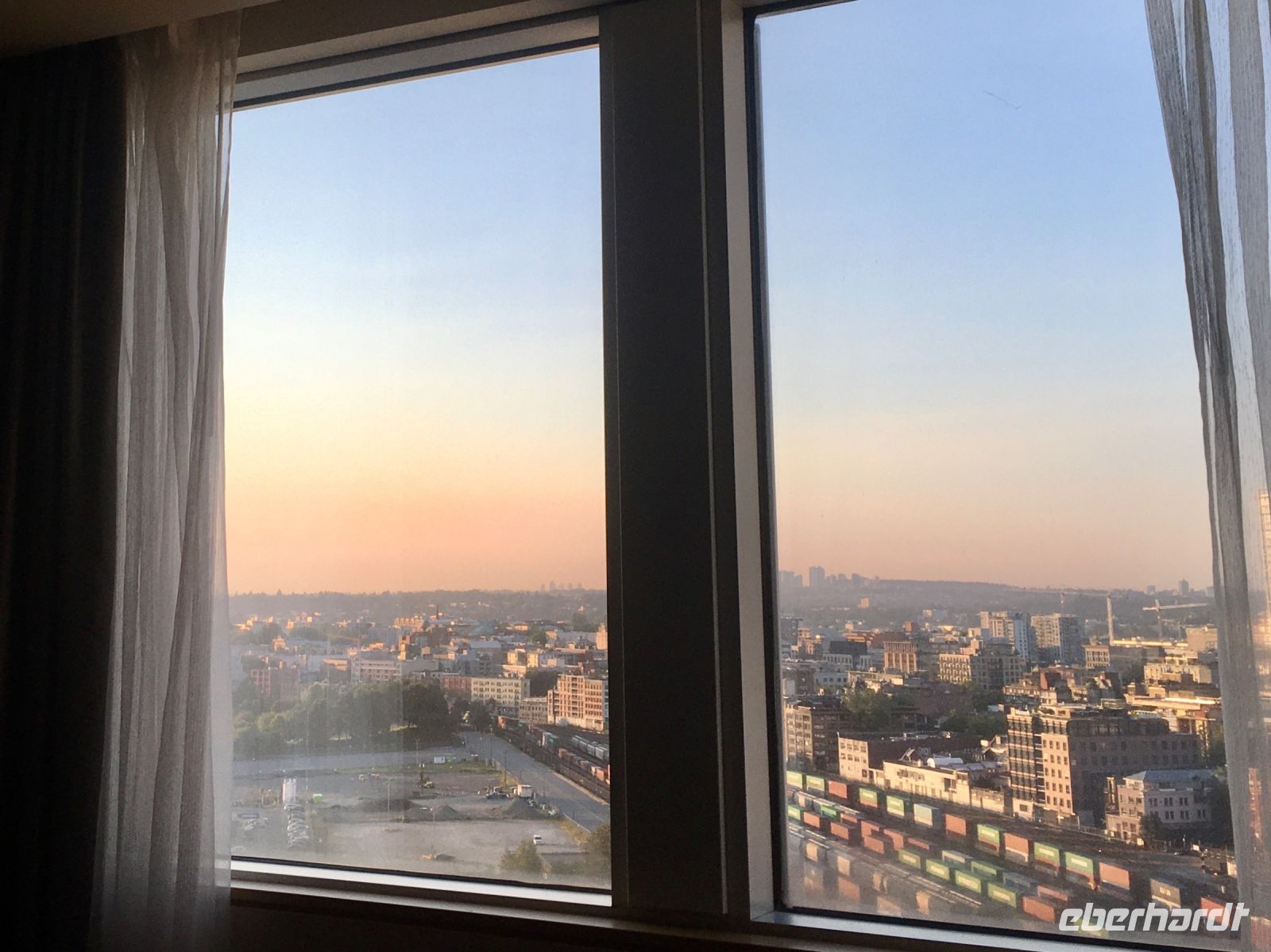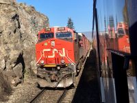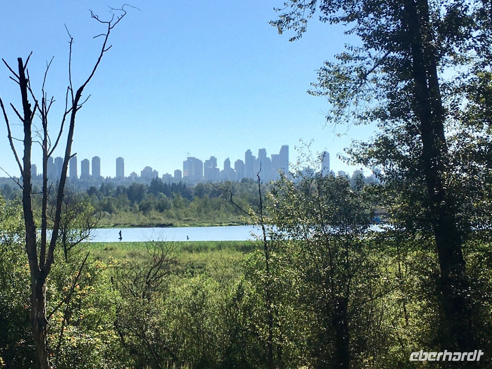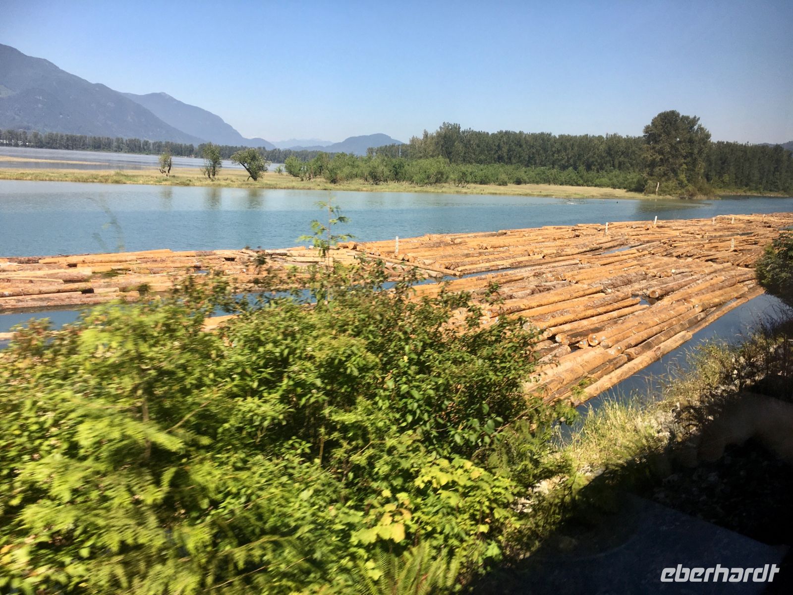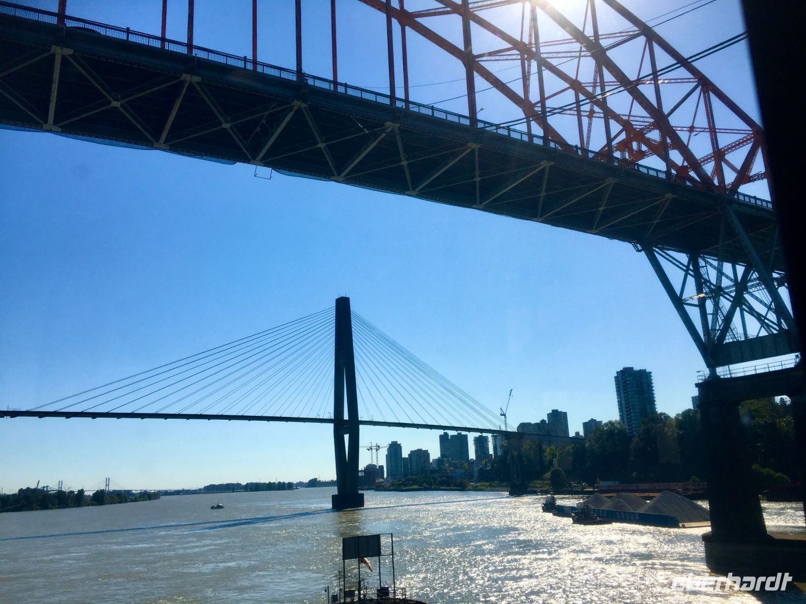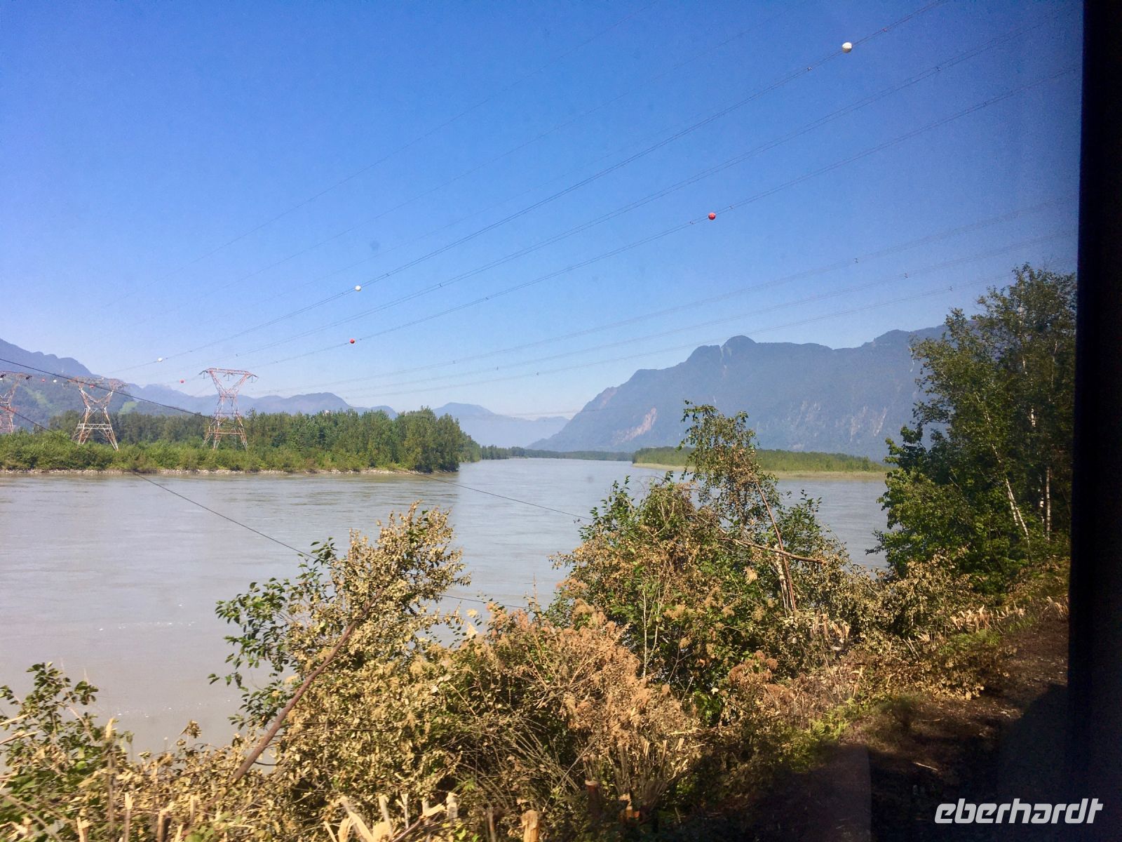 Wir wachen in Kamloops auf, unser Hotel scheint voll zu sein mit Reisegaesten die alle auf denselben Zug nach Vancouver reisen moechten. Um 6:00 schlafen alle noch und es herrscht totenstille in den Gaengen. Um 6:40 Uhr hallt, droehnt und rauscht es aus allen Zimmer. Eiligst bereiten sich die 150 von den insgesamt 250 Reisegaesten auf die bevorstehende Zugreise vor. Duschen, Zaehne putzen, anziehen, Koffer zu klappen und abschliessen. Diesen nun im Aufzug runterbringen, einen Kaffee schnappen und geschwind zur Rezeption eilen um den Bus um 7:05 ja nicht zu verpassen. Nun wird es wieder gemuetlich, wir sind in besten Haenden des Rocky Mountaineer Personals, Bus transfer, einsteigen in den Zug, Platz im Domwagen einnehmen und schon faengt das Verwoehnen wieder an. Warme Handtuecher werden ausgeteilt, ist das fuer jene gedacht, die keine Zeit fanden heute in der Frueh sich den Hals zu waschen ? Ein herrliches Fruehstueck wird uns wieder serviert waehrend dem wir durch die wuestenaehnliche Gegend fahren. Russiche Olivenbaeume, Bueschelgrass und wilder Salbei begleiten uns. Wir fahren erst durch ein Indianerreservat zum Kamploops See. Dieser ist sehr lang, fast 30 Km und wir geniessen herrliche Aussichten. Keine Boote sind darauf zu sehen er glitzert einsam fuer uns alleine. Der 8 Wagon lange Zug windet sich dem Ufer entlang und zwaengt sich durch die engen Tunnels. Daraufhin folgen wir dem Thompson Fluss bis er sich nicht in den maechtigen Fraser Fluss stuerzt. Die beiden Fluesse haben unterschiedliche Temperaturen und fuehren verschiedene Mineralien, deshalb bleiben sie auch ein zeitlang getrennt im selben Flussbett, was wir als zweifarbigen Fluss sehen. Wunderbare Fotos werden nun vom Fraser Canyon geknipst und lustigen Geschichten horchen wir zu. So hoeren wir Geschichten von legendaeren kanadischen Pionieren und staunen ueber diese wunderbare Welt die sich uns hier zeigt. Die Zeit vergeht sehr schnell und bald ist schon wieder Zeit fuer Apero und Mittagessen. Der Lachs, Steak ist wieder mmmmm so fein. Der Fraser Fluss wird ploetzlich ganz eng und die Tonnen Wasser muessen nun durch eine Schlucht. Das Wasser steht auf, es fluechtet und wuetet indem es sich durch den Canyon zwaengt. Schon Simon Fraser hatte damals diese Stelle «Hells Gate», das Hoellentor, genannt. Bald darauf erstreckt sich das Flussbett wieder weit und breit sodass Gemuetlichkeit wieder einkehren kann. Die Gegend veraendert sich auch sehr, was vor dem Mittagessen noch als braune und wuestenaehnliche Huegellandschaft auf uns schaute, ist jetzt dichter Wald in tiefem Gruen mit schrofen vulkangezeichneten Bergen. Zuegig fahren wir bei Hope vorbei in das fruchtbare Fraser Valley. Der Fraser Fluss ist nun echt ein Strom geworden und viele Hoelzer werden auf ihm gefloesst. Beim Rangierbahnhof stockt der Zug-Verkehr ein wenig aber Vancouver wartet bereits auf uns. Noch unter der Portman Bruecke durch und beim Hafen vorbei und schon heisst es von unserem lieben Zugpersonal abschied nehmen. Die Busse warten bereits auf ihre Passagiere um sie in die verschiedenen Hotels zu befoerdern. Unser Hotel, das Pan Pacific Hotel Vancouver, ist im Zentrum Vancouvers gelegen. Wunderbar, wir gehen auch gleich auf einen Spaziergang dem Nordufer der Innenstadt entlang. Danach spazieren wir die Robson Strasse hinauf und gehen auch auf ein Bierchen in der Naehe des Hotels auf der Uferpromenade. Was fuer einen wunderschoenen Tag haben wir heute erlebt, danke Eberhardt, danke Rocky Mountaineer, danke Portmonnaie und gute Nacht.