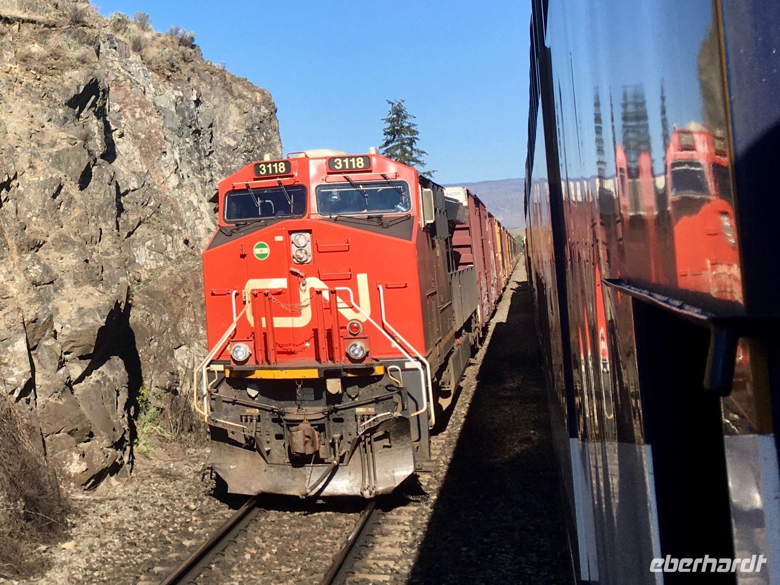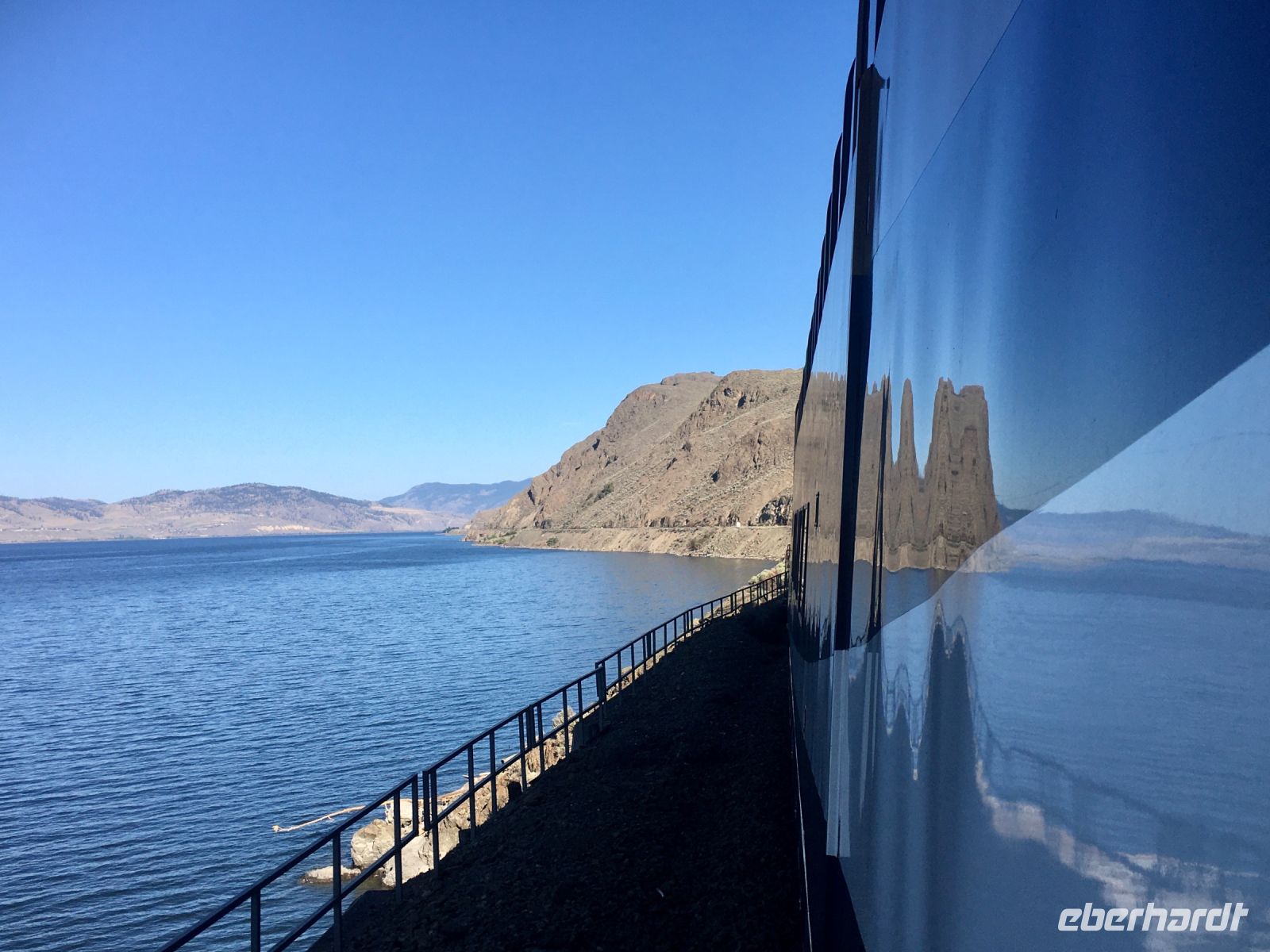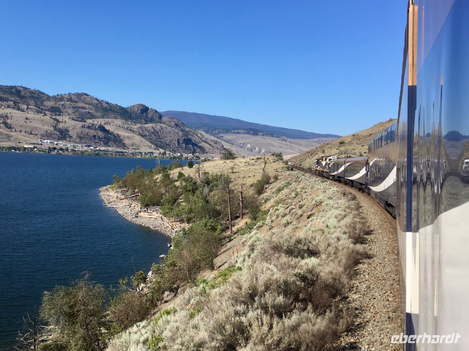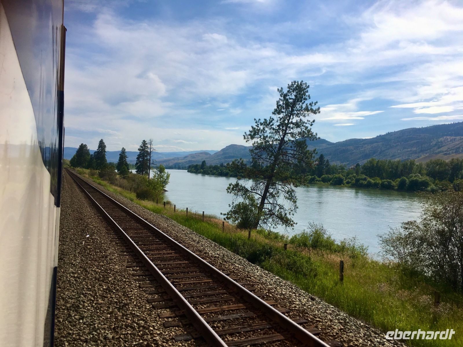 Die Sonne lacht, keine Wolke ist zu sehen, kein Ton zu hoeren. Halb verschlafen, stellen wir zu aller hergotts Frueh die Koffer vor die “Cabin” und richten uns so langsam her fuer den ersten der zwei Bahnfahrts-tage. Wir treffen uns wie abgemacht in der Lobby und aus unerfindlichen Gruenden, muessen wir lange warten bis der Bus der uns zum Bahnhof faehrt…..nicht kommt. Elisabeth organisiert einen Hoteltransport und so steigen wir 10 Minuten spaeter in den beruehmten Rocky Mountaineer Zug ein. Heute beginnt ein ganz besonderer Teil unserer Reise. Denn fuer die naechsten 2 Tage fahren wir mit dem Luxuszug von Jasper nach Vancouver. Diese Bahnfahrt fuehrt uns heute aus den Rocky Mountains hinaus. Erst fahren wir, in einem Domwagen mit bequemen Sitzen, umhegt und vorzueglich betreut, ueber die Wasserscheide des amerikanischen Kontinents auf die westseite Kanadas. Vorbei an Bieberbauten verlassen wir nun Alberta und gelangen sang und klanglos nach British Columbia. Alles geht sehr gemuetlich die einzige Aufregung ist das umstellen der Uhren. Der heutige Tag hat naemlich 25 Stunden, wir sind gerade wieder juenger geworden und haben eine Stunde mehr Spielzeit. Gelangen wir wieder in den Kindergarten wenn wir nun jahrelang gen Westen fahren ? Buegeln sich da alle Falten wieder glatt ? Item, der hoechste Berg British Columbias mit seinen 3954 Meter Hoehe ist Mount Robson und heute zur Gaenze zu sehen. Dies ist sehr selten, da er ein Tal abschliesst und die warme Luft die da nun steigen muss ihm immer eine dicke weisse Kappe auflegt. Von nun an werden die Berge immer niedriger, die Landschaft gruener und ueppiger. Der Fraser Fluss entspringt hier und biegt aber auch bald einmal gen Westen ab, wobei wir suedlich fahren. Hier begegnen wir dem North Thompson Fluss der uns durch die Columbia Bergkette bis nach Kamloops begleitet. An Bord des Zuges werden wir verwoehnt wie Gott in Frankreich. Auf bequemen Sesseln sitzen wir in einem Panoramawagen. Draussen zieht die maechtige Natur vorbei wobei die chramanten, jungen Fahrtbegleiterinnen aus dieser Zugreise ein Erlebnis gestalten. Kulinarisch hochstehende Speisen schauen wie Bilder aus und werden begleitet von besten BC Weinen, Gaumenfreude und Augenweide. Wir erfahren auch allerhand ueber Land und Leute dieses nun 150 Jahre alten Landes und warten immer mal wieder bis ein Gleis fuer die Weiterfahrt frei wird. Alle Gueterzuege der Canadien Pacific Railway haben Vorrang und sie fahren nicht nach einem Zeitplan. Wir sind bloss Gaeste auf diesen Schienen und so weiss man auch nie wann man genau ankommt. Zeit wird auf einmal unwichtig wir koennen so richtig loslassen und das Erlebnis dieser Zugreise einfach geniessen. In Kamloops beziehen wir unsere Zimmer in einem Hotel wo unsere Koffer bereits in den Zimmern stehen und einige gehen auch gleich zum Thompson Fluss hinunter. Schwimmen im Thompson River ist wegen Hochwasser nicht moeglich. Jedoch gibt es ein Konzert im Park und flanieren auf der Seepromenade von Kamloops tut auch sehr gut. Ein Bierchen spaeter, fahren wir wieder zurueck zu unserem Hotel wo unsere Koffer bereits geduldig in unseren Zimmer auf uns warten.