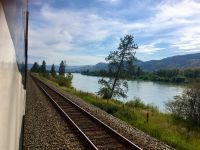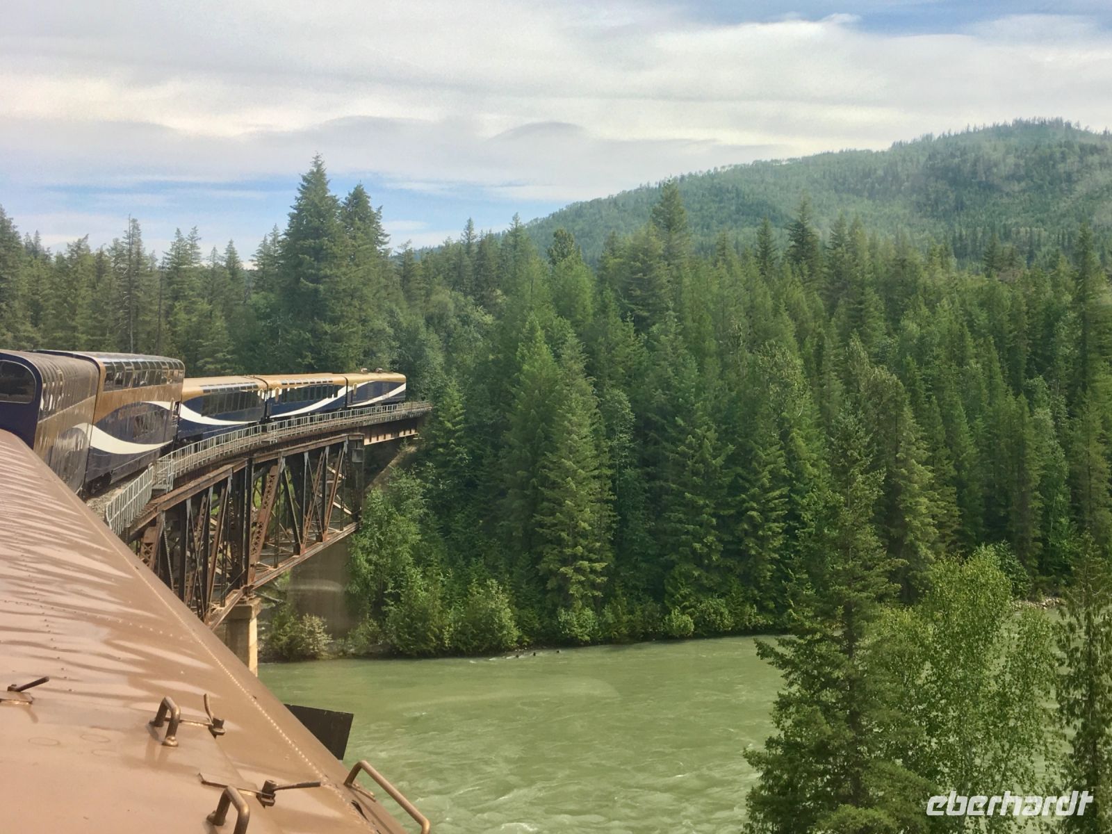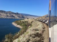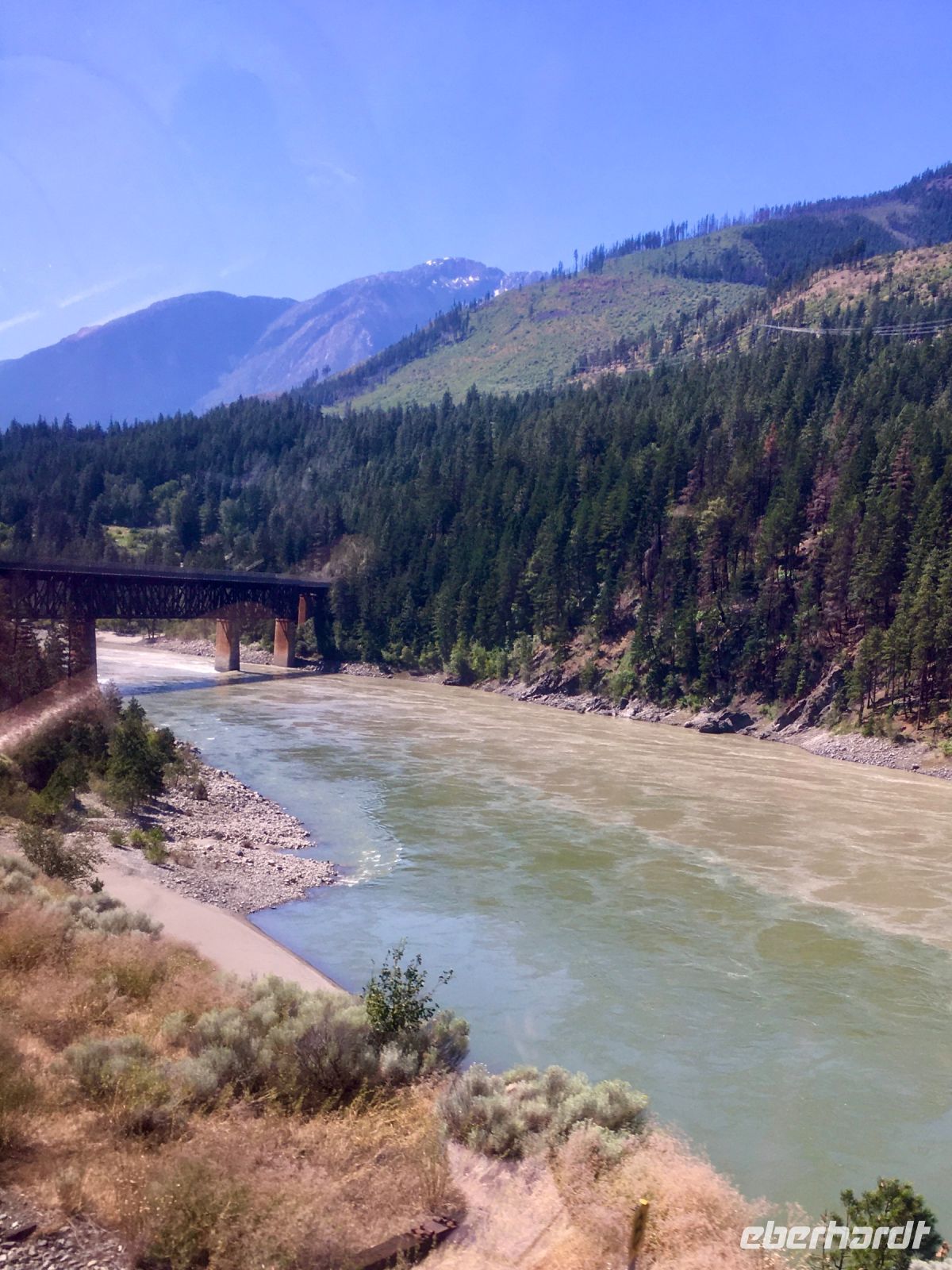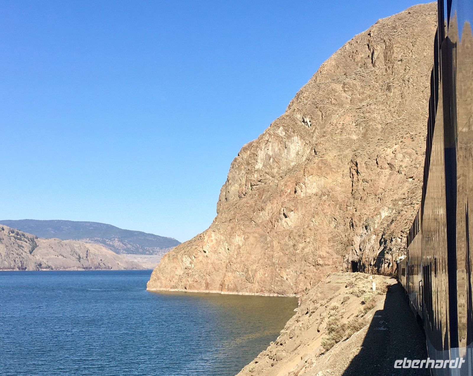 Die Sonne lacht, keine Wolke ist zu sehen, kein Ton zu hoeren. Halb verschlafen, stellen wir zu aller hergotts Frueh die Koffer vor die “Cabin” und richten uns so langsam her fuer den ersten der zwei Bahnfahrts-tage. Wir treffen uns wie abgemacht in der Lobby und aus unerfindlichen Gruenden, muessen wir lange warten bis der Bus der uns zum Bahnhof faehrt…..nicht kommt. Elisabeth organisiert einen Hoteltransport und so steigen wir 10 Minuten spaeter in den beruehmten Rocky Mountaineer Zug ein. Heute beginnt ein ganz besonderer Teil unserer Reise. Denn fuer die naechsten 2 Tage fahren wir mit dem Luxuszug von Jasper nach Vancouver. Diese Bahnfahrt fuehrt uns heute aus den Rocky Mountains hinaus. Erst fahren wir, in einem Domwagen mit bequemen Sitzen, umhegt und vorzueglich betreut, ueber die Wasserscheide des amerikanischen Kontinents auf die westseite Kanadas. Vorbei an Bieberbauten verlassen wir nun Alberta und gelangen sang und klanglos nach British Columbia. Alles geht sehr gemuetlich die einzige Aufregung ist das umstellen der Uhren. Der heutige Tag hat naemlich 25 Stunden, wir sind gerade wieder juenger geworden und haben eine Stunde mehr Spielzeit. Gelangen wir wieder in den Kindergarten wenn wir nun jahrelang gen Westen fahren ? Buegeln sich da alle Falten wieder glatt ? Item, der hoechste Berg British Columbias mit seinen 3954 Meter Hoehe ist Mount Robson und heute zur Gaenze zu sehen. Dies ist sehr selten, da er ein Tal abschliesst und die warme Luft die da nun steigen muss ihm immer eine dicke weisse Kappe auflegt. Von nun an werden die Berge immer niedriger, die Landschaft gruener und ueppiger. Der Fraser Fluss entspringt hier und biegt aber auch bald einmal gen Westen ab, wobei wir suedlich fahren. Hier begegnen wir dem North Thompson Fluss der uns durch die Columbia Bergkette bis nach Kamloops begleitet. An Bord des Zuges werden wir verwoehnt wie Gott in Frankreich. Auf bequemen Sesseln sitzen wir in einem Panoramawagen. Draussen zieht die maechtige Natur vorbei wobei die chramanten, jungen Fahrtbegleiterinnen aus dieser Zugreise ein Erlebnis gestalten. Kulinarisch hochstehende Speisen schauen wie Bilder aus und werden begleitet von besten BC Weinen, Gaumenfreude und Augenweide. Wir erfahren auch allerhand ueber Land und Leute dieses nun 150 Jahre alten Landes und warten immer mal wieder bis ein Gleis fuer die Weiterfahrt frei wird. Alle Gueterzuege der Canadien Pacific Railway haben Vorrang und sie fahren nicht nach einem Zeitplan. Wir sind bloss Gaeste auf diesen Schienen und so weiss man auch nie wann man genau ankommt. Zeit wird auf einmal unwichtig wir koennen so richtig loslassen und das Erlebnis dieser Zugreise einfach geniessen. In Kamloops beziehen wir unsere Zimmer in einem Hotel wo unsere Koffer bereits in den Zimmern stehen und einige gehen auch gleich zum Thompson Fluss hinunter. Schwimmen im Thompson River ist wegen Hochwasser nicht moeglich. Jedoch gibt es ein Konzert im Park und flanieren auf der Seepromenade von Kamloops tut auch sehr gut. Ein Bierchen spaeter, fahren wir wieder zurueck zu unserem Hotel wo unsere Koffer bereits geduldig in unseren Zimmer auf uns warten.
