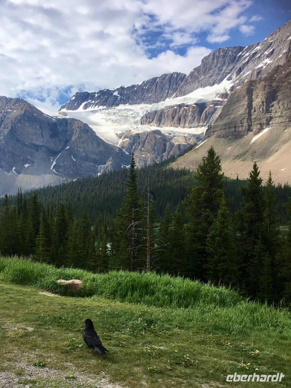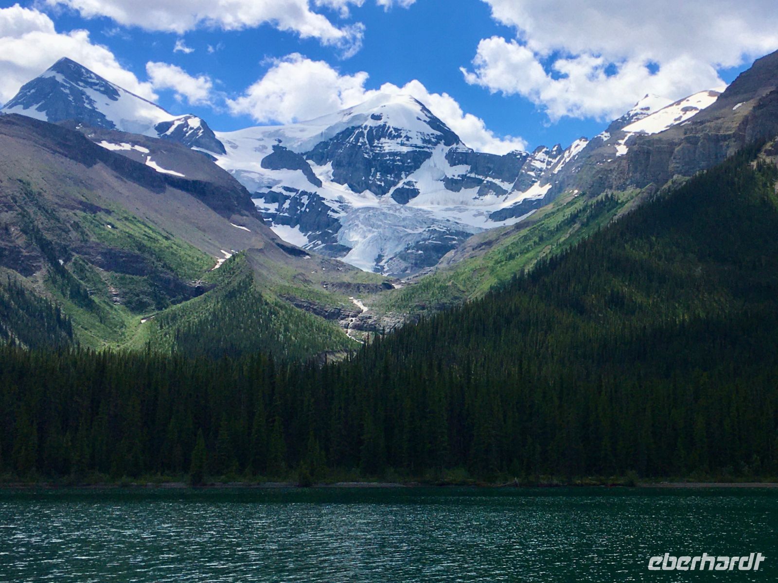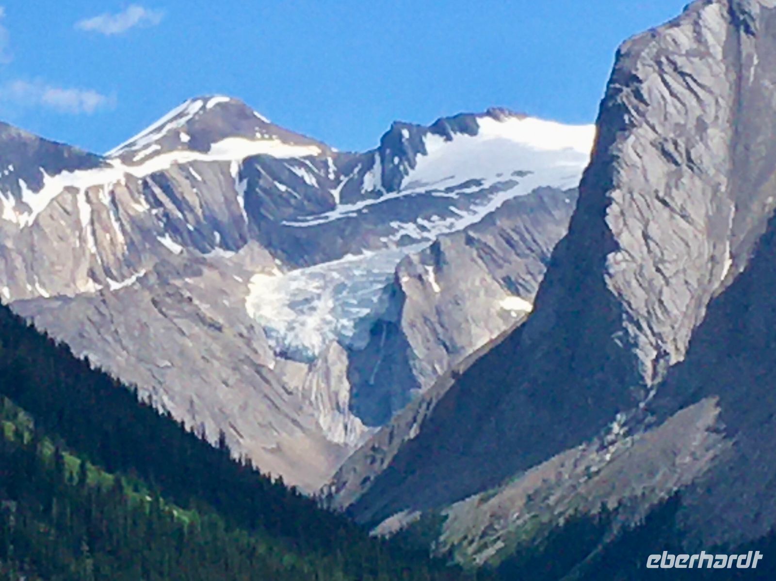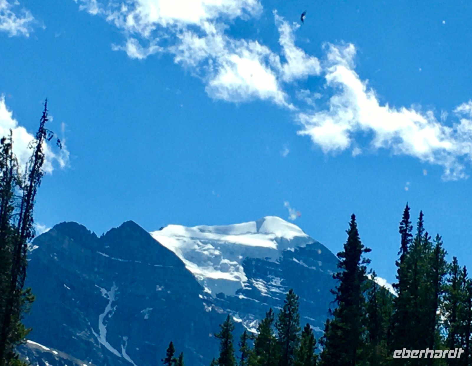 Nichts Schoeneres als aufwachen, in die Berge schauen und blauen Himmel sehen. Die meisten sind bereits um 6 Uhr in der Frueh unterwegs, um Fotos von dem rosafarbenen Victoria Gletscher zu erhaschen. Der See liegt ganz ruhig und die Spiegelung ist perfekt. Das Fruehstuecksbuffet ist wieder wunderbar, indemselben Restaurant Lago wie gestern abend das Abendessen. Heute fahren wir bei praechtigstem Sonnnschein auf die beruehmte Icefield Parkway. Diese Strasse gehoert zu den schoensten Strassen der Welt und wir geniessen die maechtigen Berge die sich hier aneinander reihen. Tuerkisblaue Seen liegen still im Walde und glitzernde Gletscher schauen auf uns herunter. Heute hoeren wir einiges ueber die Kultur der Ersten Nationen, ueber Gletscher und Schneefelder und ueber Baeren. Ploetzlich haelt Amy den Bus an, wir stehen schon vor unserem ersten Gletscher. Der Kraehenfuss-Gletscher zeigt sich sehr fotogen besonders mit der Kraehe im Vordergrund die anscheinend hier immer auf Fototermine wartet. Gleich danach wollen wir zum Bow Lake runterfahren. Uups, der Parkplatz ist vollgestopft mit Autos und wir sitzen da fest. Gekonnt faehrt Amy rueckwaerts wieder zur Strasse hoch und laesst uns oben aussteigen. Kein Leichtes mit diesem Riesenbus. Danke Amy. Die Photos von diesem See mit seinem Bow Gletscher dahinter und der schoenen Spiegelung sind gut gelungen. Geht auf die Bildergalerie, ihr werdet staunen. Bald muessen wir jedoch wieder weiter, denn der Weg zum Columbia Icefeld ist noch eine atemberaubende Stunde entfernt. Vorerst gibts jedoch noch einen Halt, denn der Peto Lake will mit seiner Farbe alle anderen Seen uebertrumpfen. Ja, es gelingt ihm heute ganz deutlich. Wir koennen unser Glueck kaum fassen, denn das Wetter spielt so herrlich mit, dass wir einfach begeistert sind von den tollen Ansichten. Der Hoehepunkt des heutigen Tages kommt nahe. Uns erwartet eine Fahrt mit dem Icecoach auf dem Athabasca Gletscher des Columbia Eisfeldes. Es ist ein wunderbares Erlebnis hier oben auf dem ewigen Eis zu stehen. Die Flaeschen werden nun mit dem Ewig-jung-Wasser gefuellt ehe es wieder Zeit wird mit dem Cruiser zum Parkplatz zu fahren wo Amy bereits auf uns wartet. Sie faehrt uns nun zum Skywalk. Auf einer glaesernen Terrasse, welche hoch ueber einem Tal gelegen ist, wird unser Mut getestet. Bestanden, nun aber zurueck zum Ausgangspunkt und weiter geht es bis zu einem schmucken Wasserfall. Die Athabasca Faelle sind sehr imposant und den kurzen Besuch wert. Bald danach gelangen wir in unsere Jasper Park Lodge. Ein wahrlich schmuckes 5 Sterne-Hotel, aus vielen Bungalows bestehend, mit seinem eigenen Bergsee und einer wunderbaren Sicht auf die Bergwelt der Rockies. Dieses Hotel ist bereits ueber 100 Jahre alt und die “Cabins” auch Bungalow genannt sind teilweise ein wenig veraltert aber das macht vielleicht auch den Charm dieses bezauberndes Ortes aus. Das Abendessen schmeckt heute auch ganz vorzueglich und wir bleiben gerne 10 Tage .........ah, so sorry, 2 Naechte hier.