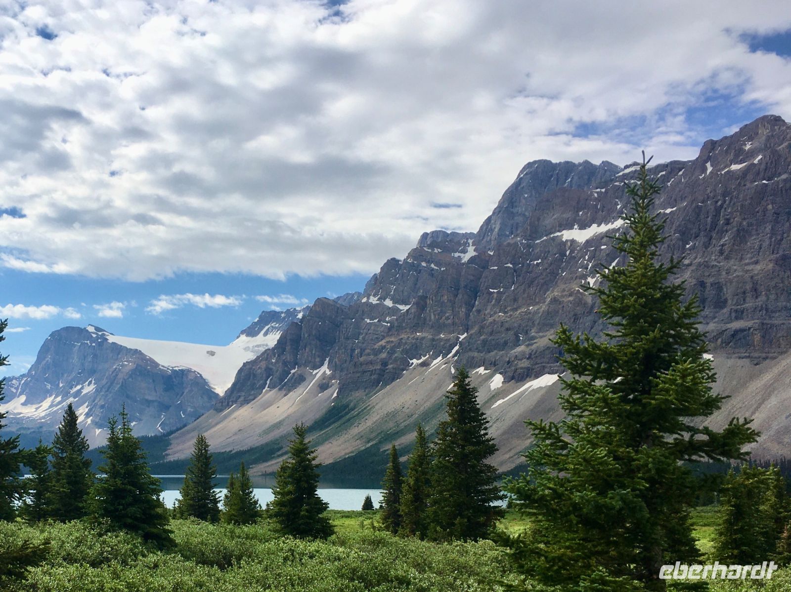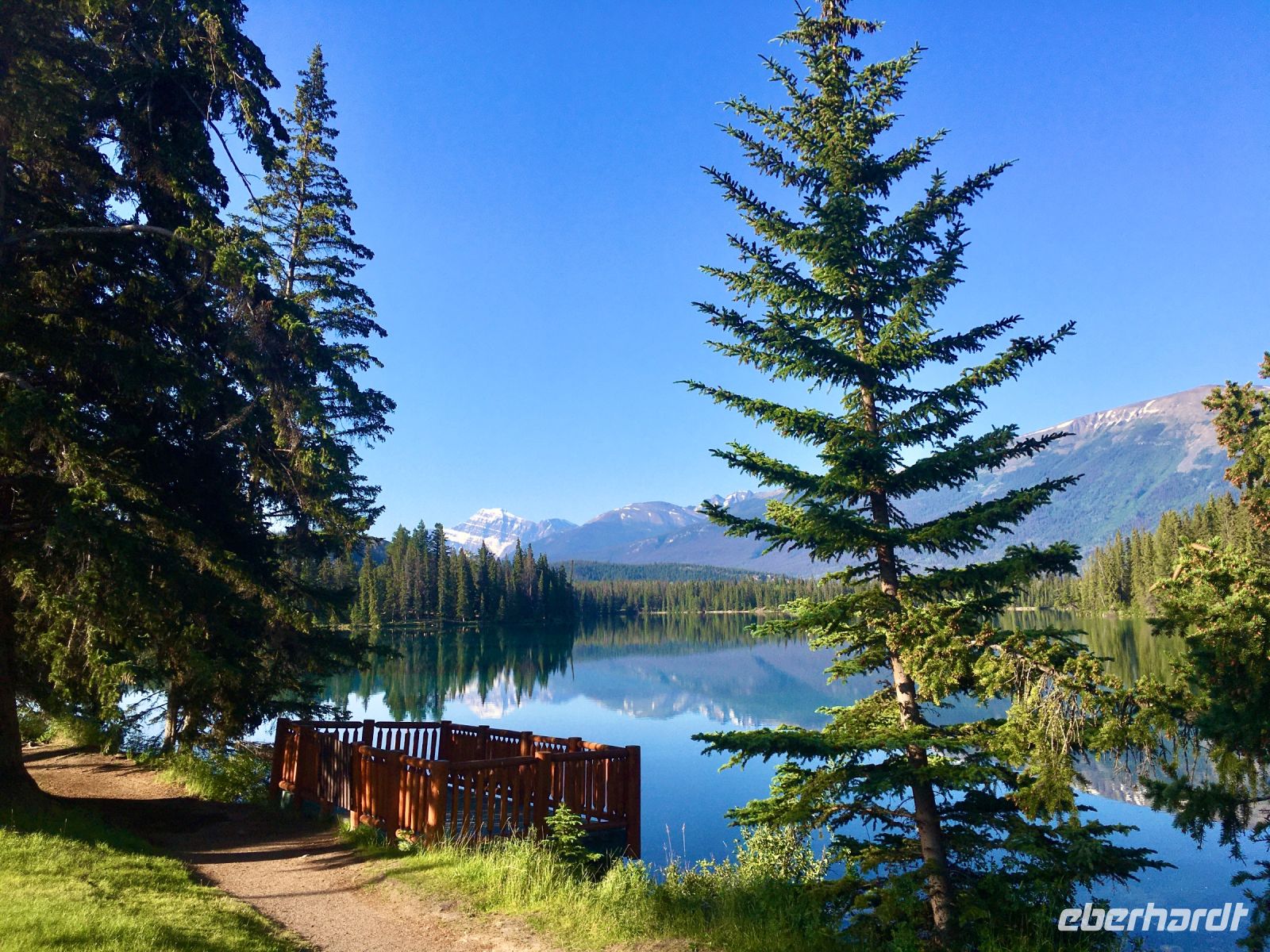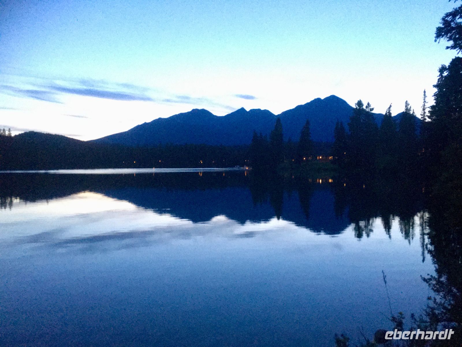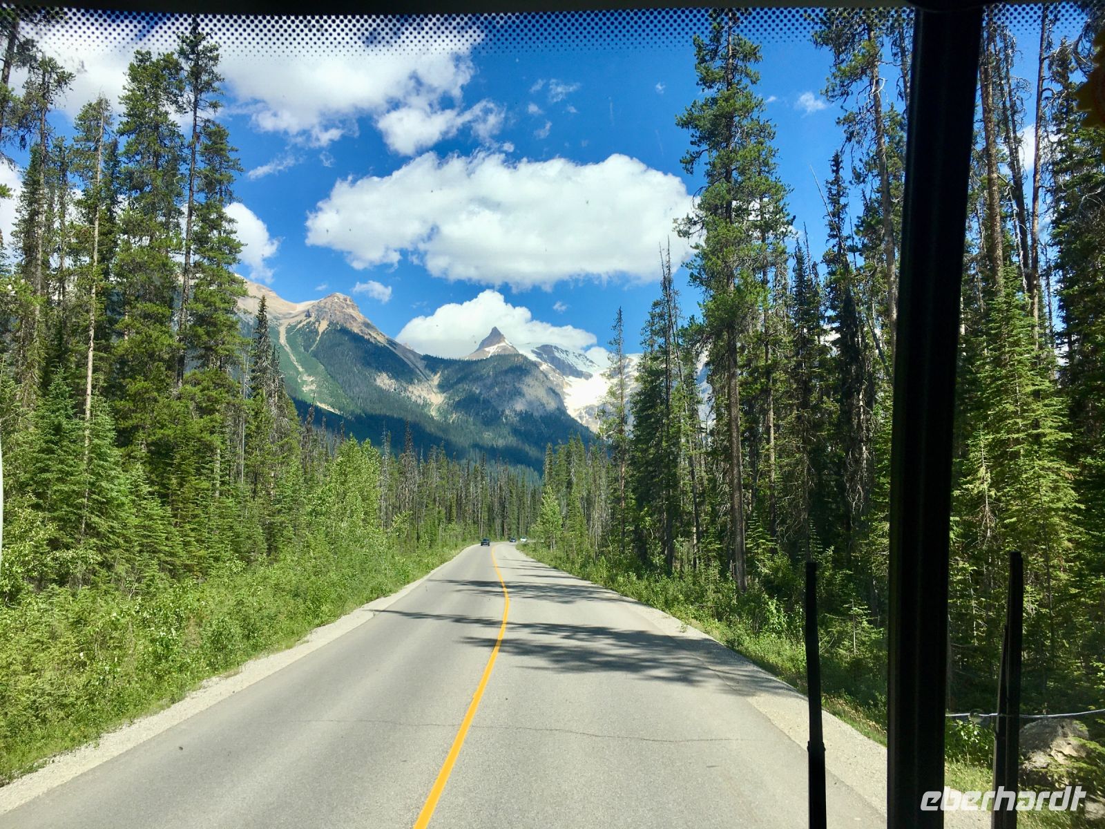 Nichts Schoeneres als aufwachen, in die Berge schauen und blauen Himmel sehen. Die meisten sind bereits um 6 Uhr in der Frueh unterwegs, um Fotos von dem rosafarbenen Victoria Gletscher zu erhaschen. Der See liegt ganz ruhig und die Spiegelung ist perfekt. Das Fruehstuecksbuffet ist wieder wunderbar, indemselben Restaurant Lago wie gestern abend das Abendessen. Heute fahren wir bei praechtigstem Sonnnschein auf die beruehmte Icefield Parkway. Diese Strasse gehoert zu den schoensten Strassen der Welt und wir geniessen die maechtigen Berge die sich hier aneinander reihen. Tuerkisblaue Seen liegen still im Walde und glitzernde Gletscher schauen auf uns herunter. Heute hoeren wir einiges ueber die Kultur der Ersten Nationen, ueber Gletscher und Schneefelder und ueber Baeren. Ploetzlich haelt Amy den Bus an, wir stehen schon vor unserem ersten Gletscher. Der Kraehenfuss-Gletscher zeigt sich sehr fotogen besonders mit der Kraehe im Vordergrund die anscheinend hier immer auf Fototermine wartet. Gleich danach wollen wir zum Bow Lake runterfahren. Uups, der Parkplatz ist vollgestopft mit Autos und wir sitzen da fest. Gekonnt faehrt Amy rueckwaerts wieder zur Strasse hoch und laesst uns oben aussteigen. Kein Leichtes mit diesem Riesenbus. Danke Amy. Die Photos von diesem See mit seinem Bow Gletscher dahinter und der schoenen Spiegelung sind gut gelungen. Geht auf die Bildergalerie, ihr werdet staunen. Bald muessen wir jedoch wieder weiter, denn der Weg zum Columbia Icefeld ist noch eine atemberaubende Stunde entfernt. Vorerst gibts jedoch noch einen Halt, denn der Peto Lake will mit seiner Farbe alle anderen Seen uebertrumpfen. Ja, es gelingt ihm heute ganz deutlich. Wir koennen unser Glueck kaum fassen, denn das Wetter spielt so herrlich mit, dass wir einfach begeistert sind von den tollen Ansichten. Der Hoehepunkt des heutigen Tages kommt nahe. Uns erwartet eine Fahrt mit dem Icecoach auf dem Athabasca Gletscher des Columbia Eisfeldes. Es ist ein wunderbares Erlebnis hier oben auf dem ewigen Eis zu stehen. Die Flaeschen werden nun mit dem Ewig-jung-Wasser gefuellt ehe es wieder Zeit wird mit dem Cruiser zum Parkplatz zu fahren wo Amy bereits auf uns wartet. Sie faehrt uns nun zum Skywalk. Auf einer glaesernen Terrasse, welche hoch ueber einem Tal gelegen ist, wird unser Mut getestet. Bestanden, nun aber zurueck zum Ausgangspunkt und weiter geht es bis zu einem schmucken Wasserfall. Die Athabasca Faelle sind sehr imposant und den kurzen Besuch wert. Bald danach gelangen wir in unsere Jasper Park Lodge. Ein wahrlich schmuckes 5 Sterne-Hotel, aus vielen Bungalows bestehend, mit seinem eigenen Bergsee und einer wunderbaren Sicht auf die Bergwelt der Rockies. Dieses Hotel ist bereits ueber 100 Jahre alt und die “Cabins” auch Bungalow genannt sind teilweise ein wenig veraltert aber das macht vielleicht auch den Charm dieses bezauberndes Ortes aus. Das Abendessen schmeckt heute auch ganz vorzueglich und wir bleiben gerne 10 Tage .........ah, so sorry, 2 Naechte hier.