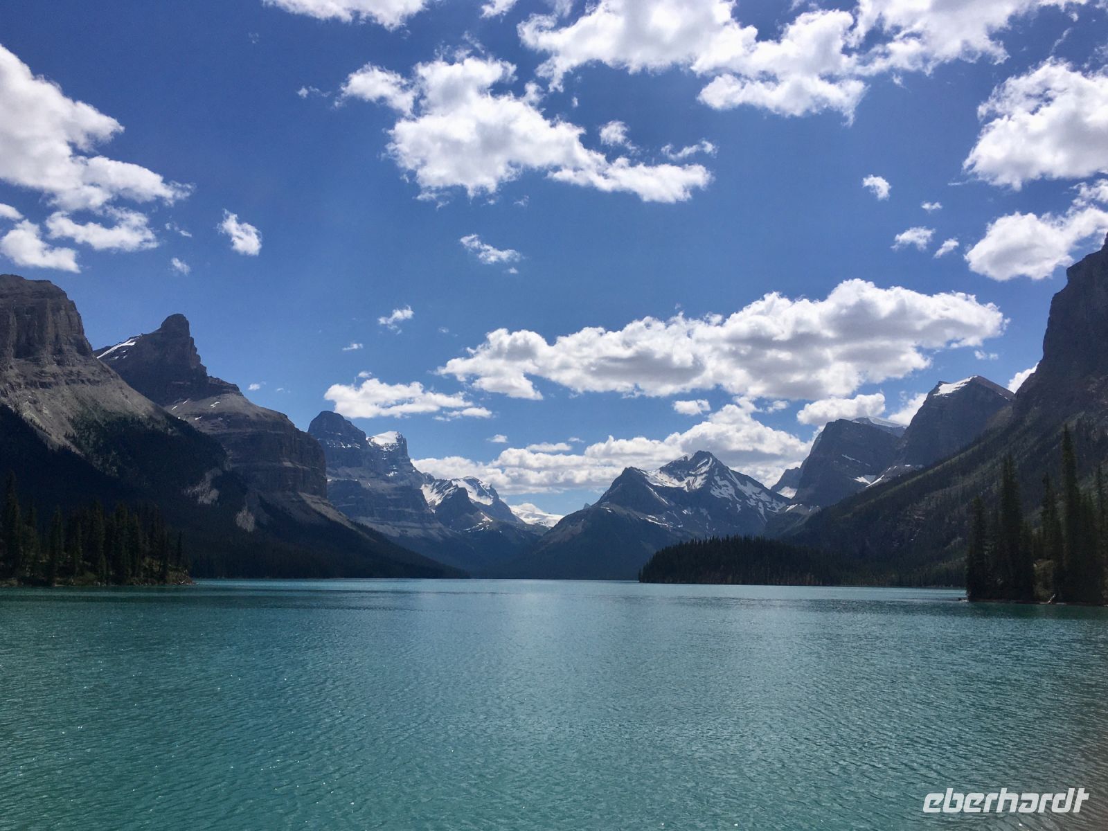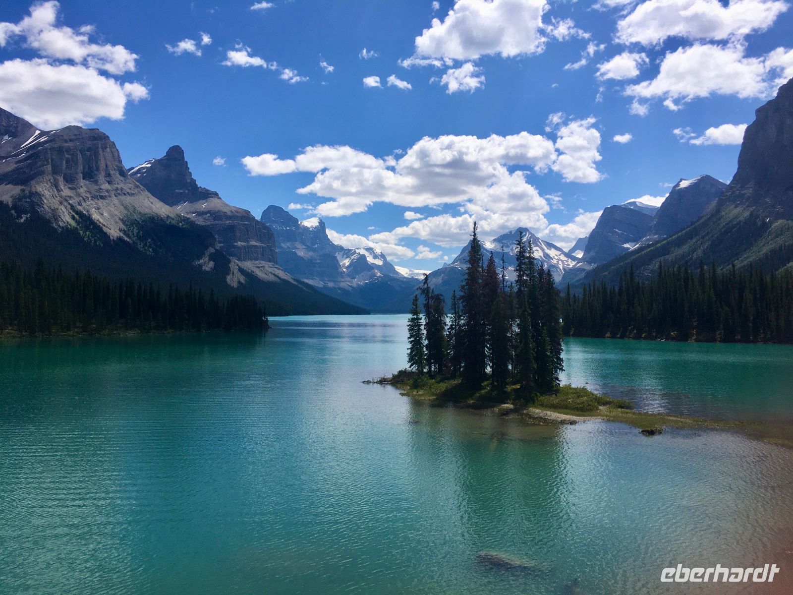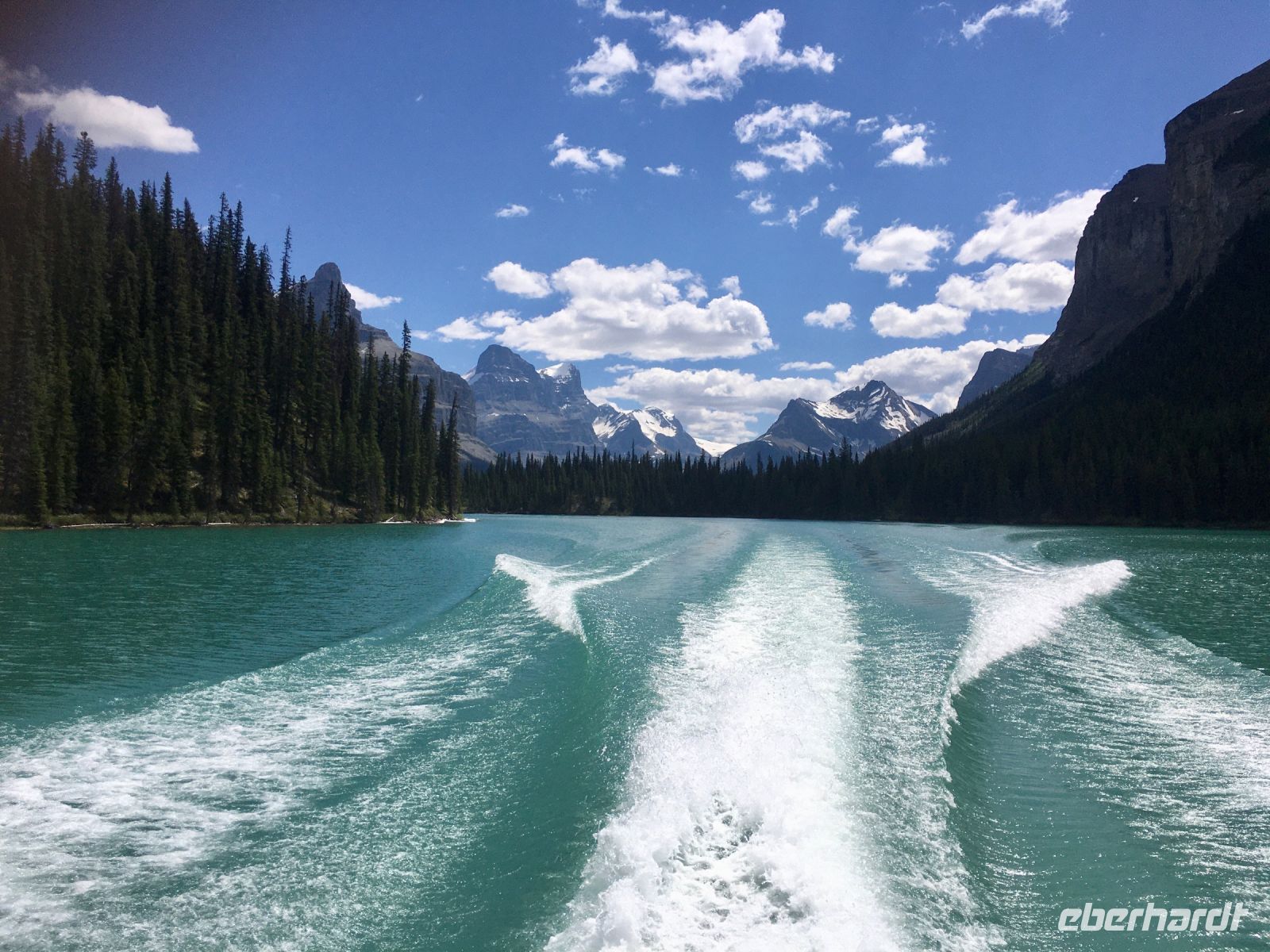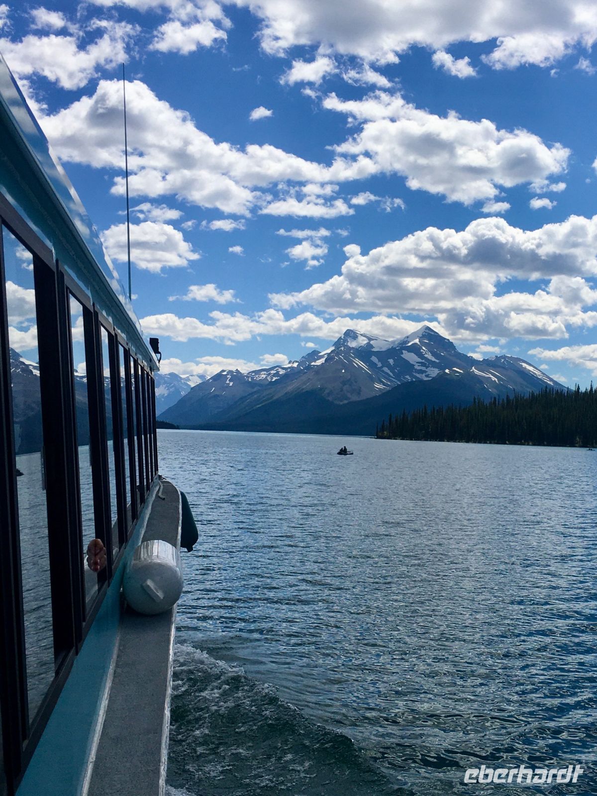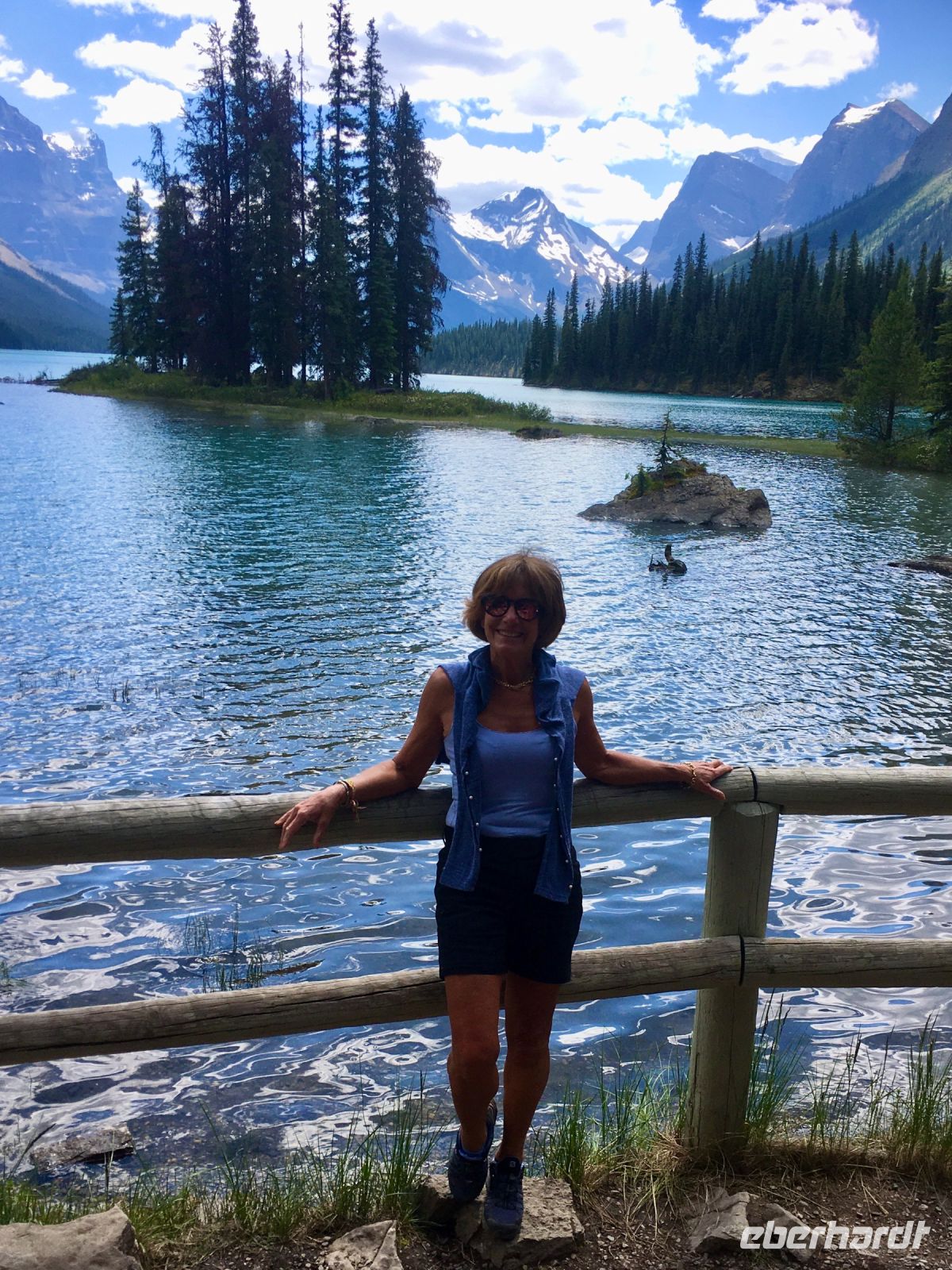 n diesem Hotel aufwachen zu duerfen ist ein Erlebniss fuer sich. Die Ruhe, der stille See, die Loonies auf dem Wasser und Voegel die um die Wette zwitschern, schaut so das Paradies aus ? Die Woelkchen die den weiten Himmel bedecken, schauen bezaubernd aus und die fruehe Sonne laesst den See glitzern. Nach dem wunderbaren Fruehstueck im Nook Restaurant, werden wir vom ruhigen Roland, dem heutigen Fahrer, zum Maligne See gefahren. Schon nach 20 Minuten Fahrt halten wir, da wir eine kleine Wanderung unternehmen wollen. Es ist warm und wir spazieren entlang des Maligne Flusses, bestaunen seine Schlucht und die 3 tollen Wasserfaelle. Gemeinsam gehts nun mit Roland weiter bis zum Medicine See, schau schau, dort oben auf dem nacktem Baumstamm ist der Adlerhorst und der letzte junge Adler macht gerade seine ersten Fluguebungen. Wir bleiben stehen und schauen ihm zu. Er huepft und breitet seine grossen Fluegel aus. Es ist ein Weisskopfadler aber in dem jungen Alter, ist er noch in seiner Tarnfarbe braun, erst in 4 Jahren wird auch dieser Weisskopfadler seinen weissen Kopf und weisse Schwanzfedern erhalten die sich so schon von seinem schwarzen Koerper abheben. Nun gehts weiter zum Maligne See, wir sind 3/4 Stunde frueh und haben Zeit etwas essen zu koennen. Die Waffeln sind der Spitzenreiter. Die ganze Terasse riecht danach. Bald steht auch schon unser Schiff bereit. Der Hoehepunkt dieser Schiffahrt ist Spirit Island. Die Insel der Einsicht ist eigentlich eine Halbinsel so wunderschoen und eindruecklich, dass es das meist fotografierteste Motiv der Rockies ist. Man muss es einfach erlebt haben um die Schoenheit richtig zu erkennen. Kein Bild, in Sonne oder Regen kann die Emotion festhalten. Geladen mit vielen neuen Eindruecken fahren wir nun gleich zurueck in die wunderschoene Jasper Park Lodge. Das Wetter ist so herrlich, dass viele unter uns, einen Spaziergang entlang des Beaupret-Sees gleich bei der Lodge unternehmen. Andere nuetzen das Schwimmbad mit Sicht auf See- und Bergwelt und einige wurden gesehen, wie sie in Badebekleidung in den kalten See gehuepft sind. Am Abend wartet ein koestliches Buffet auf uns, wir sitzen noch lange und freuen uns ueber unser Glueck, hier zu sein. Ohhh die weichen Betten rufen, jetzt aber schnell Koefferchen packen, Eticketten an die Koffer anbringen und ins Bettchen huepfen. Morgen geht es zeitiger los, also beeilen wir uns mit dem Schlaf.