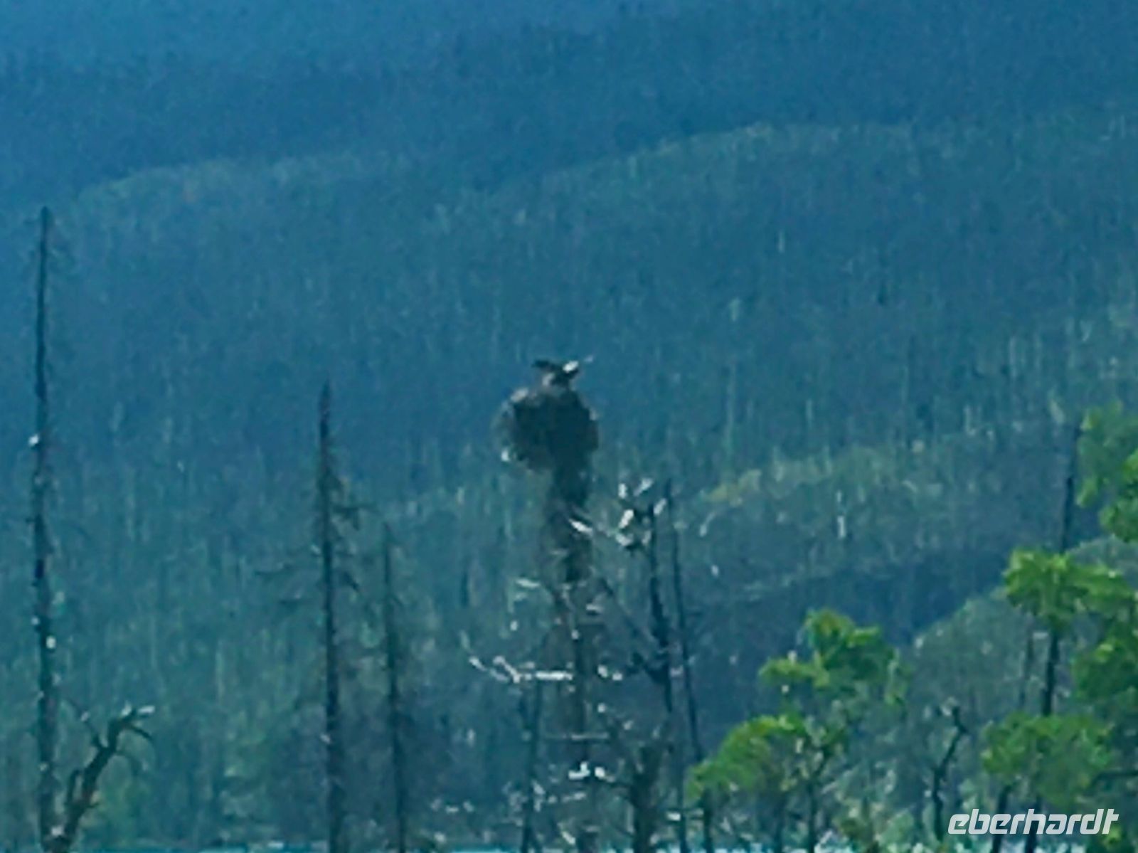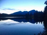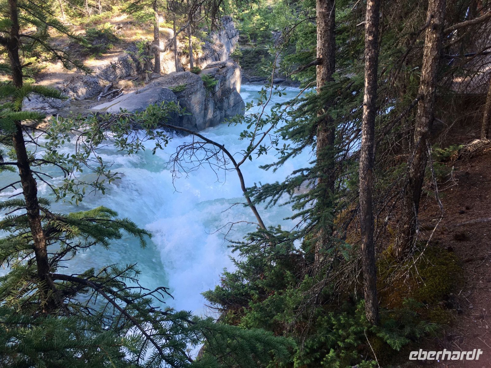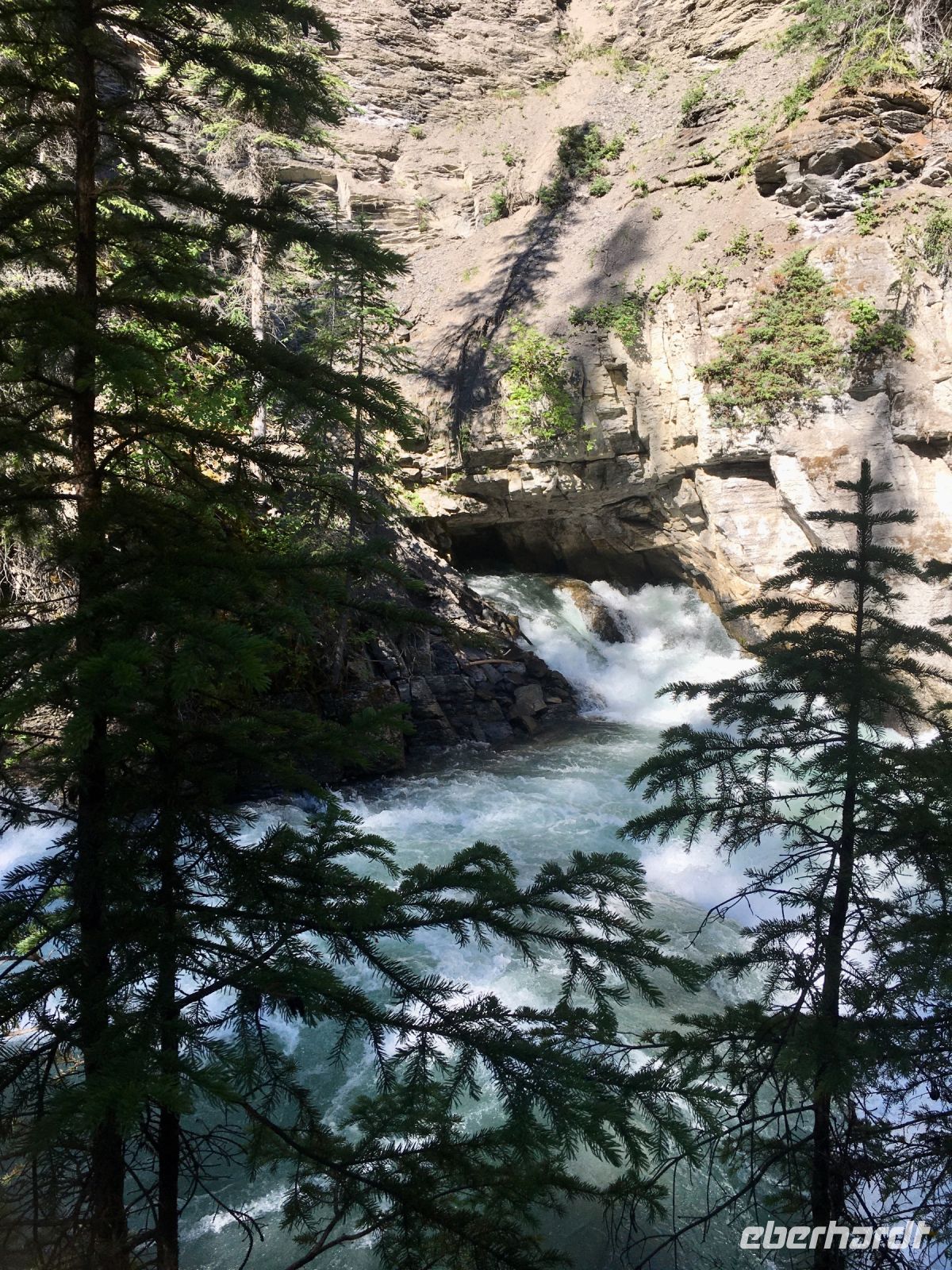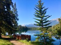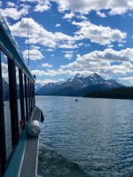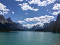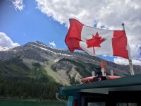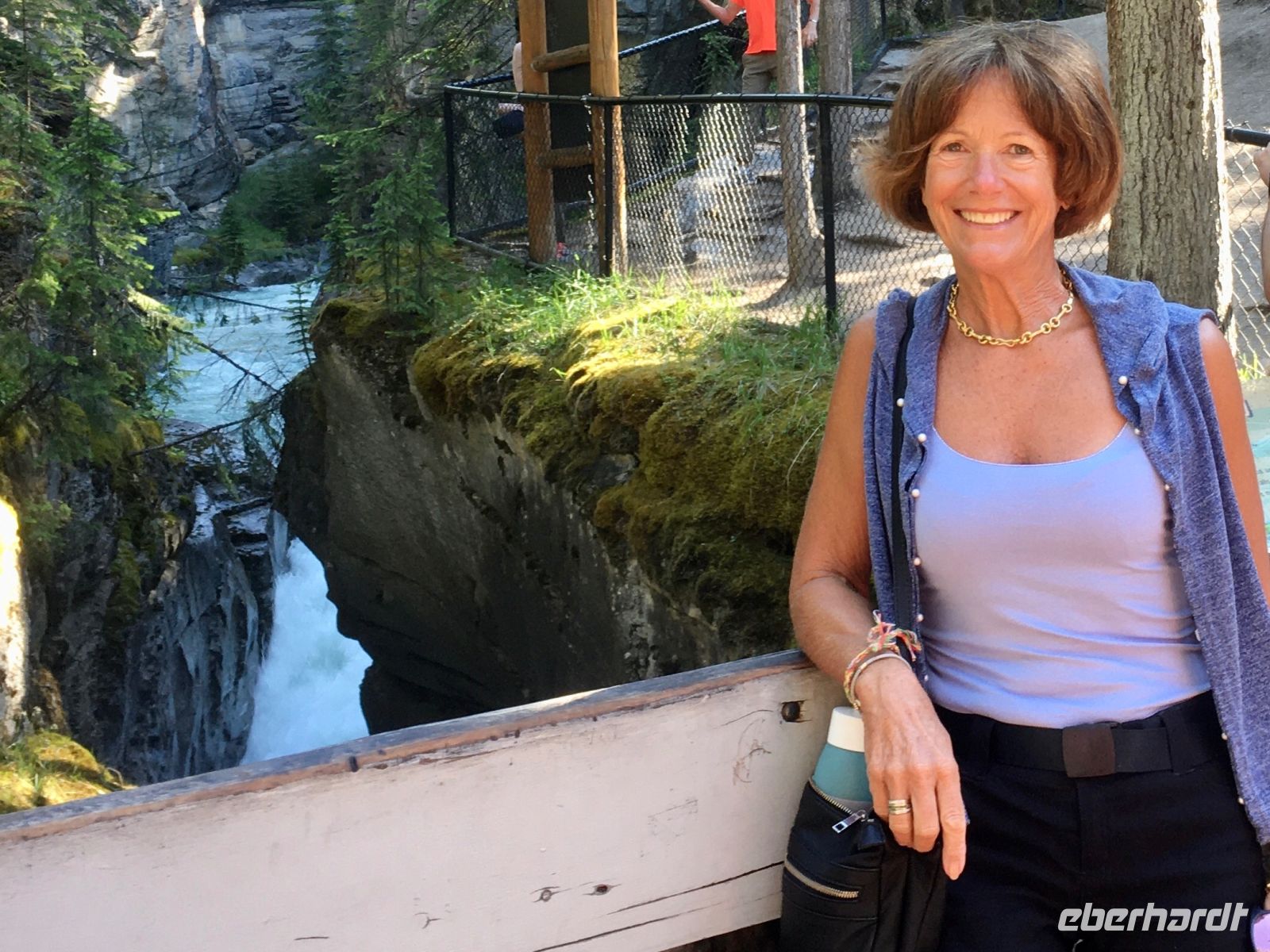 n diesem Hotel aufwachen zu duerfen ist ein Erlebniss fuer sich. Die Ruhe, der stille See, die Loonies auf dem Wasser und Voegel die um die Wette zwitschern, schaut so das Paradies aus ? Die Woelkchen die den weiten Himmel bedecken, schauen bezaubernd aus und die fruehe Sonne laesst den See glitzern. Nach dem wunderbaren Fruehstueck im Nook Restaurant, werden wir vom ruhigen Roland, dem heutigen Fahrer, zum Maligne See gefahren. Schon nach 20 Minuten Fahrt halten wir, da wir eine kleine Wanderung unternehmen wollen. Es ist warm und wir spazieren entlang des Maligne Flusses, bestaunen seine Schlucht und die 3 tollen Wasserfaelle. Gemeinsam gehts nun mit Roland weiter bis zum Medicine See, schau schau, dort oben auf dem nacktem Baumstamm ist der Adlerhorst und der letzte junge Adler macht gerade seine ersten Fluguebungen. Wir bleiben stehen und schauen ihm zu. Er huepft und breitet seine grossen Fluegel aus. Es ist ein Weisskopfadler aber in dem jungen Alter, ist er noch in seiner Tarnfarbe braun, erst in 4 Jahren wird auch dieser Weisskopfadler seinen weissen Kopf und weisse Schwanzfedern erhalten die sich so schon von seinem schwarzen Koerper abheben. Nun gehts weiter zum Maligne See, wir sind 3/4 Stunde frueh und haben Zeit etwas essen zu koennen. Die Waffeln sind der Spitzenreiter. Die ganze Terasse riecht danach. Bald steht auch schon unser Schiff bereit. Der Hoehepunkt dieser Schiffahrt ist Spirit Island. Die Insel der Einsicht ist eigentlich eine Halbinsel so wunderschoen und eindruecklich, dass es das meist fotografierteste Motiv der Rockies ist. Man muss es einfach erlebt haben um die Schoenheit richtig zu erkennen. Kein Bild, in Sonne oder Regen kann die Emotion festhalten. Geladen mit vielen neuen Eindruecken fahren wir nun gleich zurueck in die wunderschoene Jasper Park Lodge. Das Wetter ist so herrlich, dass viele unter uns, einen Spaziergang entlang des Beaupret-Sees gleich bei der Lodge unternehmen. Andere nuetzen das Schwimmbad mit Sicht auf See- und Bergwelt und einige wurden gesehen, wie sie in Badebekleidung in den kalten See gehuepft sind. Am Abend wartet ein koestliches Buffet auf uns, wir sitzen noch lange und freuen uns ueber unser Glueck, hier zu sein. Ohhh die weichen Betten rufen, jetzt aber schnell Koefferchen packen, Eticketten an die Koffer anbringen und ins Bettchen huepfen. Morgen geht es zeitiger los, also beeilen wir uns mit dem Schlaf.