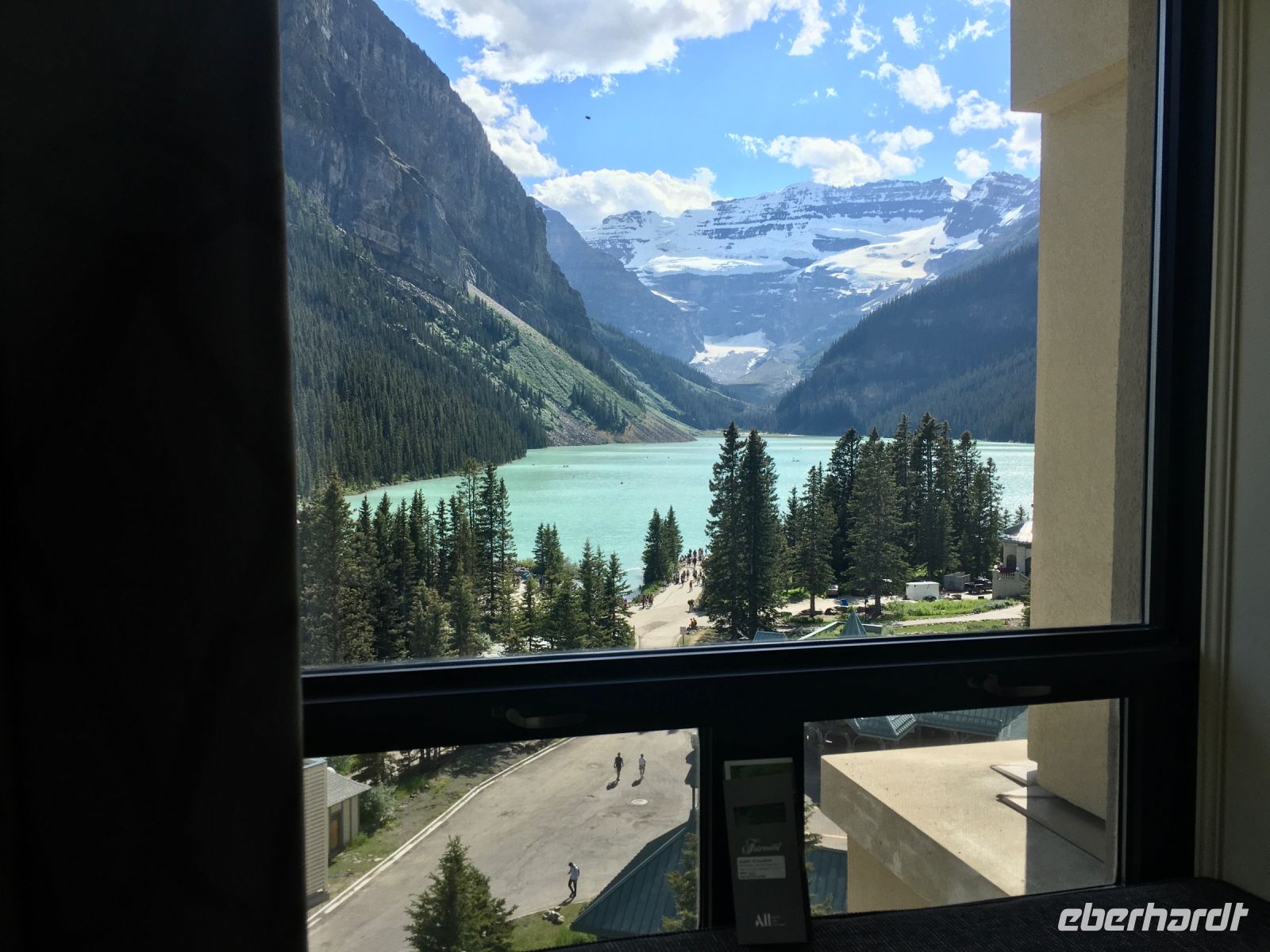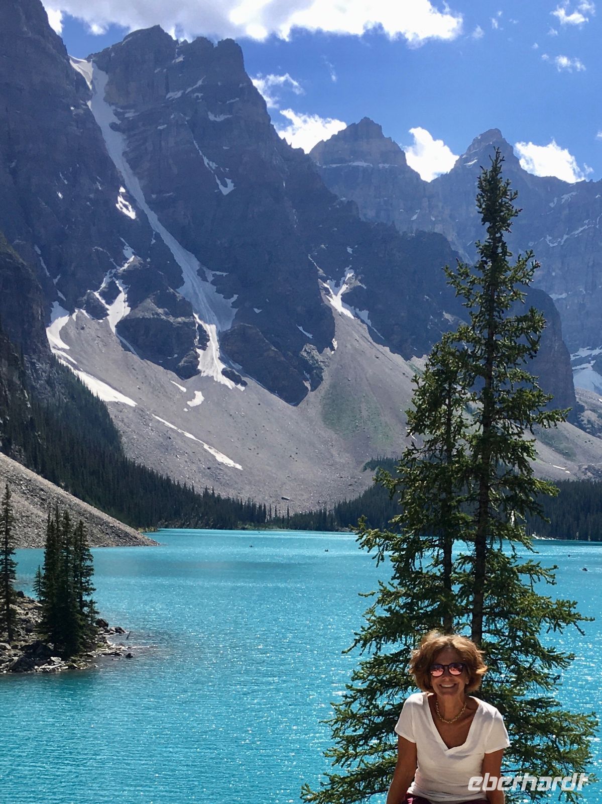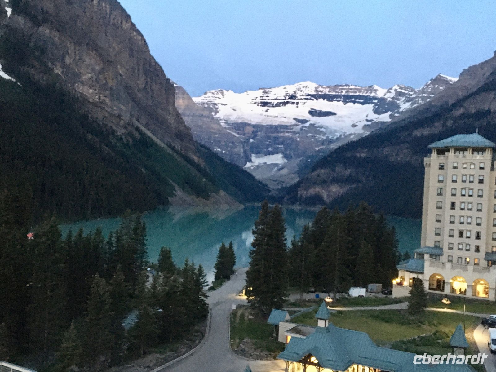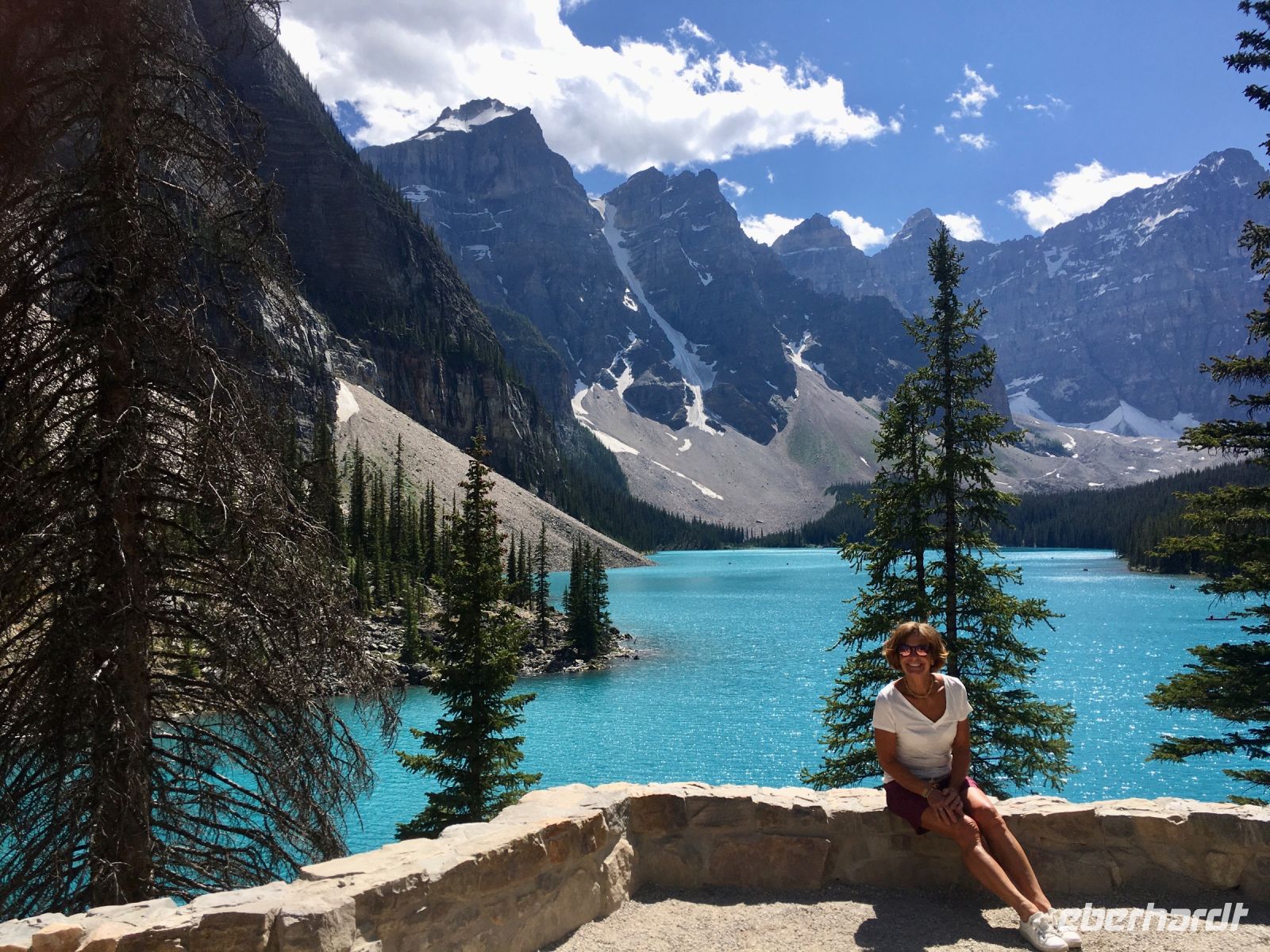Och wie toll, Mount Rundel schaut in mein Zimmer und die Sonne geht soeben ueber Cascade Mountain auf. In dem riesen Zimmer mit den grossen Fenstern ist gut schlafen. Schnell ein Telefonat an die Reception, ob der zurueckgebliebene Koffer nun angekommen sei……ja ! Die Freude ist riesig und der Koffer wird auch bald mit seiner Besitzerin zusammengefuehrt. Heute darf jeder zum Fruehstueck gehen wann er moechte, da wir erst um 10 Uhr abfahren werden. Einige gehen vorerst noch spazieren, andere im hauseigenen Schwimmbad baden und andere schlafen einfach eine Runde weiter. Das ist Urlaub ! Bei strahlendem Sonnenschein verlassen wir nun Banff und fahren auf der Highway no 1 in Richtung Lake Louise. Bald aber halten wir fuer ein Photostopp des maechtigen Castles Mountain. Alsobald verlassen wir auch die Nord Route und fahren links ab ueber die kontinentale Wasserscheide in Richtung British Columbia. Beim Kicking Horse River im Yoho National Park halten wir bei den Spiral Tunnels an. Wir sehen leider gerade keinen Zug in dem Tunnelsystem, wir sind ja auch in Ka-na-da, aber wir schauen uns das Schauspiel dieser Tunnelschleifen auf einem Modell an. Was fuer eine wunderbare Fahrt nach Emerald Lake. Bald sind wir da, er glitzert smaragdgruen wie auf den Postkarten. Nun wollen wir auch gleich spazieren gehen bis ans Ende des Sees. Rote Kanus zieren den See und passen wunderbar ins Bild. Mt President mit seinem Kollegen, Mt Vice President, regieren hier die Szene. Nun ist aber Zeit fuer unser tolles Picknick. Wie ein Buffet wird alles hergerichtet und jeder kann sich sein eigenes Broetchen belegen. Dazu gibt es 2 von den 3 mitgebrachten Weine zu verkosten. Viel Gelaechter spaeter, fahren wir wieder weiter. Nun besuchen wir noch die Natuerliche Bruecke ehe wir den pitoresken Morraine Lake besuchen. Unsere Kameras laufen heute auf Hochtouren. Auch diese steinerne Naturbruecke die sich ueber den Kicking Horse River spannt und von den umliegenden Bergen umrahmt ist, bietet ein schoenes Motif. Aber der pitoresken Morraine Lake der wird uns immer in Erinnerung bleiben. Genauso wie auf der alten 20 Dollar Note presentiert er sich heute. Das Wasser ist ein herrliches, sattes tuerkis blau wie in der Karibik und die 10 steile Berge umranden Lake Morraine. Jetzt wird es Nachmittag und Zeit nach Lake Louise zu fahren um dort in der “Mona Lisa der Rocky Mountains” einzuchecken. Ja, wir sind die gluecklichen, die hier ueber Nacht einziehen werden. Das Hotel ist wunderschoen am Lake Louise platziert und unsere Zimmer haben alle eine tolle Aussicht auf den See und den dahintergelegenen Victoria Gletscher. Das Abendessen schmeckt sehr lecker und der Abendspaziergang entlang des Sees auf der Promenade leer von Besucher ist einmalig. Romantik pur und so sehr erholsam. Auch hier sind die Zimmer schoen gross und die Betten himmlisch. Den Vorhang wollte ich nicht zuziehen, damit der See und sein Gletscher mich in der Frueh wieder wecken koennen.