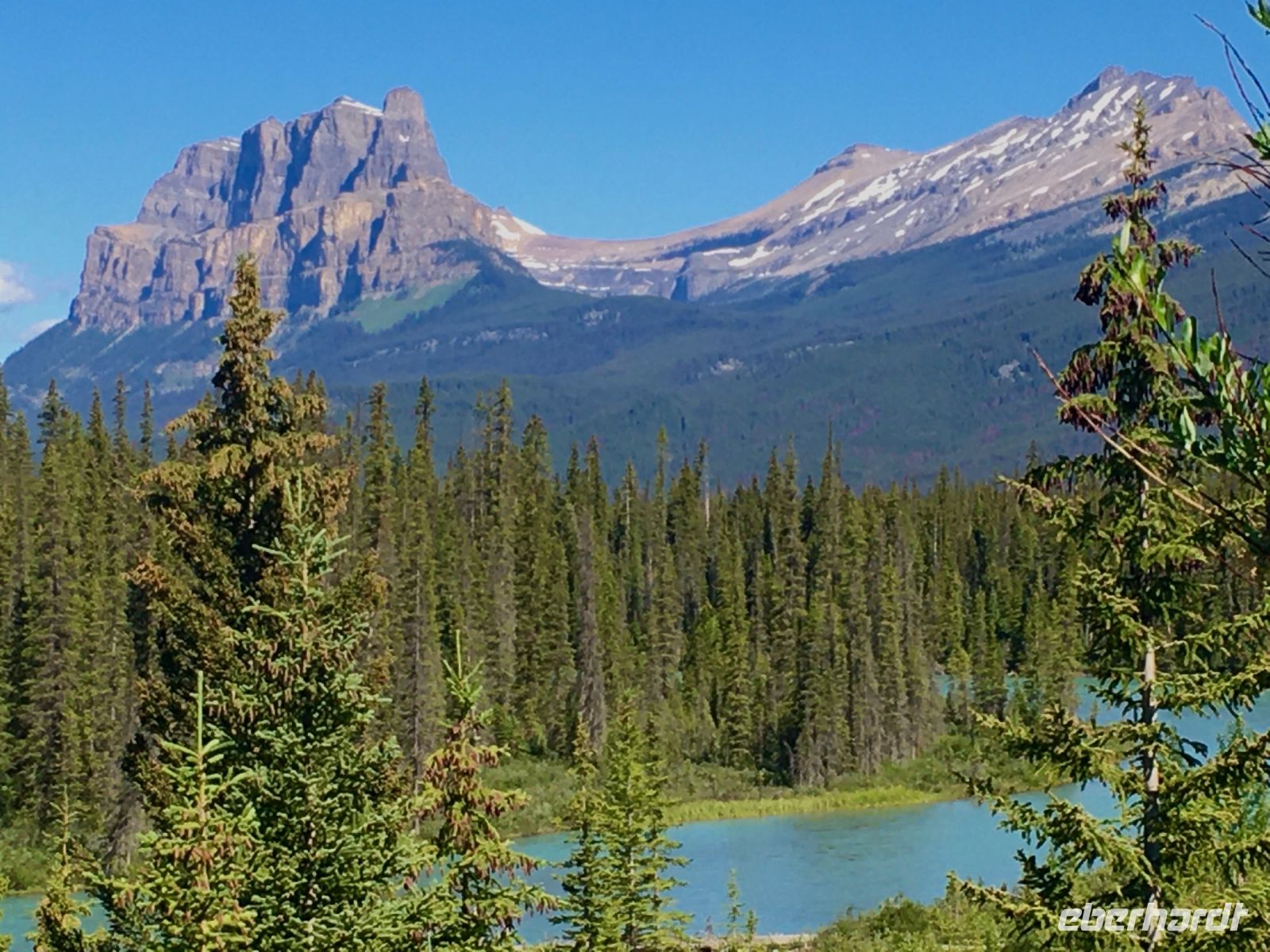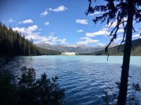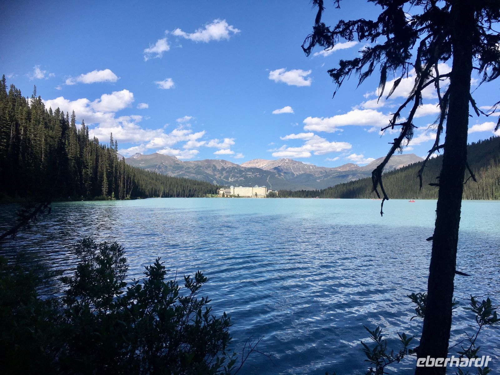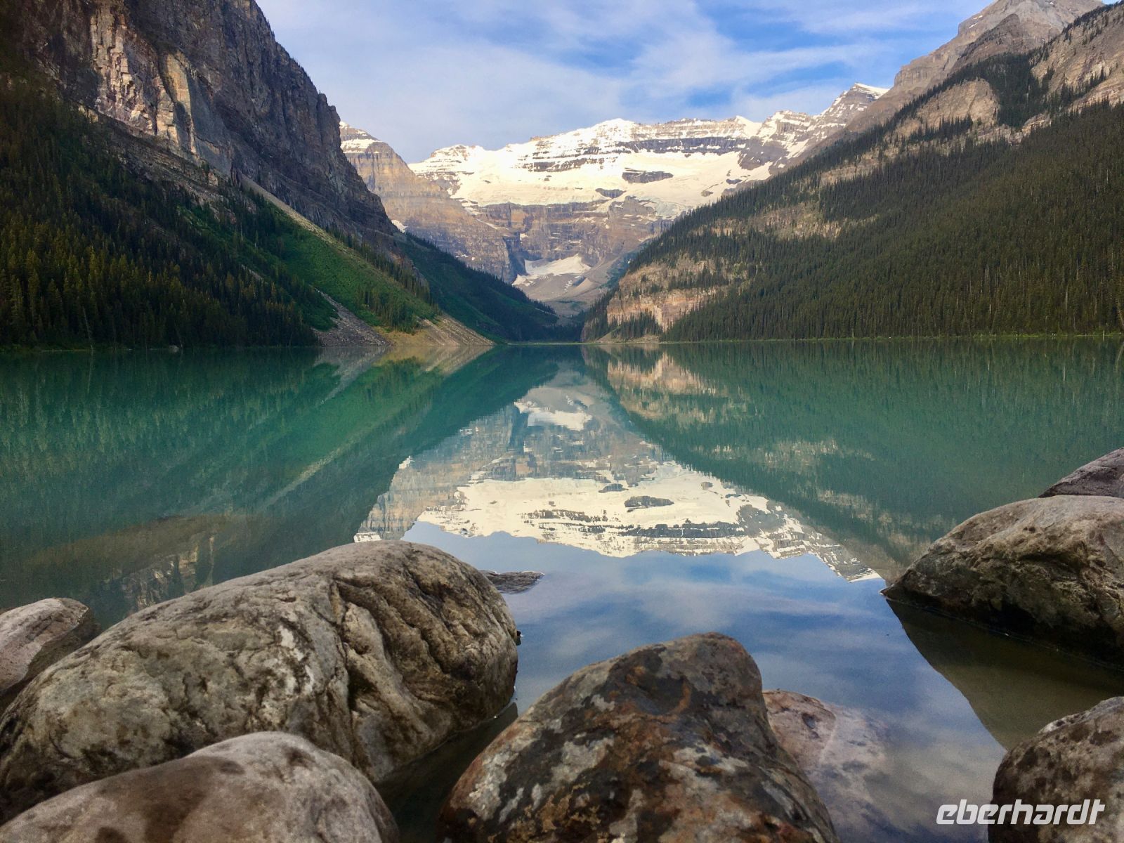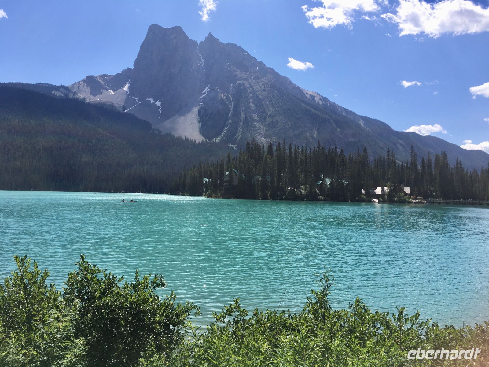 Och wie toll, Mount Rundel schaut in mein Zimmer und die Sonne geht soeben ueber Cascade Mountain auf. In dem riesen Zimmer mit den grossen Fenstern ist gut schlafen. Schnell ein Telefonat an die Reception, ob der zurueckgebliebene Koffer nun angekommen sei……ja ! Die Freude ist riesig und der Koffer wird auch bald mit seiner Besitzerin zusammengefuehrt. Heute darf jeder zum Fruehstueck gehen wann er moechte, da wir erst um 10 Uhr abfahren werden. Einige gehen vorerst noch spazieren, andere im hauseigenen Schwimmbad baden und andere schlafen einfach eine Runde weiter. Das ist Urlaub ! Bei strahlendem Sonnenschein verlassen wir nun Banff und fahren auf der Highway no 1 in Richtung Lake Louise. Bald aber halten wir fuer ein Photostopp des maechtigen Castles Mountain. Alsobald verlassen wir auch die Nord Route und fahren links ab ueber die kontinentale Wasserscheide in Richtung British Columbia. Beim Kicking Horse River im Yoho National Park halten wir bei den Spiral Tunnels an. Wir sehen leider gerade keinen Zug in dem Tunnelsystem, wir sind ja auch in Ka-na-da, aber wir schauen uns das Schauspiel dieser Tunnelschleifen auf einem Modell an. Was fuer eine wunderbare Fahrt nach Emerald Lake. Bald sind wir da, er glitzert smaragdgruen wie auf den Postkarten. Nun wollen wir auch gleich spazieren gehen bis ans Ende des Sees. Rote Kanus zieren den See und passen wunderbar ins Bild. Mt President mit seinem Kollegen, Mt Vice President, regieren hier die Szene. Nun ist aber Zeit fuer unser tolles Picknick. Wie ein Buffet wird alles hergerichtet und jeder kann sich sein eigenes Broetchen belegen. Dazu gibt es 2 von den 3 mitgebrachten Weine zu verkosten. Viel Gelaechter spaeter, fahren wir wieder weiter. Nun besuchen wir noch die Natuerliche Bruecke ehe wir den pitoresken Morraine Lake besuchen. Unsere Kameras laufen heute auf Hochtouren. Auch diese steinerne Naturbruecke die sich ueber den Kicking Horse River spannt und von den umliegenden Bergen umrahmt ist, bietet ein schoenes Motif. Aber der pitoresken Morraine Lake der wird uns immer in Erinnerung bleiben. Genauso wie auf der alten 20 Dollar Note presentiert er sich heute. Das Wasser ist ein herrliches, sattes tuerkis blau wie in der Karibik und die 10 steile Berge umranden Lake Morraine. Jetzt wird es Nachmittag und Zeit nach Lake Louise zu fahren um dort in der “Mona Lisa der Rocky Mountains” einzuchecken. Ja, wir sind die gluecklichen, die hier ueber Nacht einziehen werden. Das Hotel ist wunderschoen am Lake Louise platziert und unsere Zimmer haben alle eine tolle Aussicht auf den See und den dahintergelegenen Victoria Gletscher. Das Abendessen schmeckt sehr lecker und der Abendspaziergang entlang des Sees auf der Promenade leer von Besucher ist einmalig. Romantik pur und so sehr erholsam. Auch hier sind die Zimmer schoen gross und die Betten himmlisch. Den Vorhang wollte ich nicht zuziehen, damit der See und sein Gletscher mich in der Frueh wieder wecken koennen.
