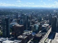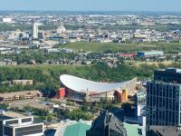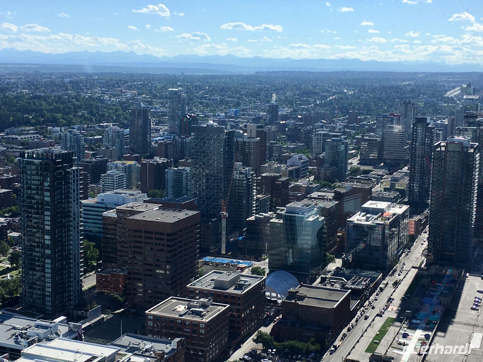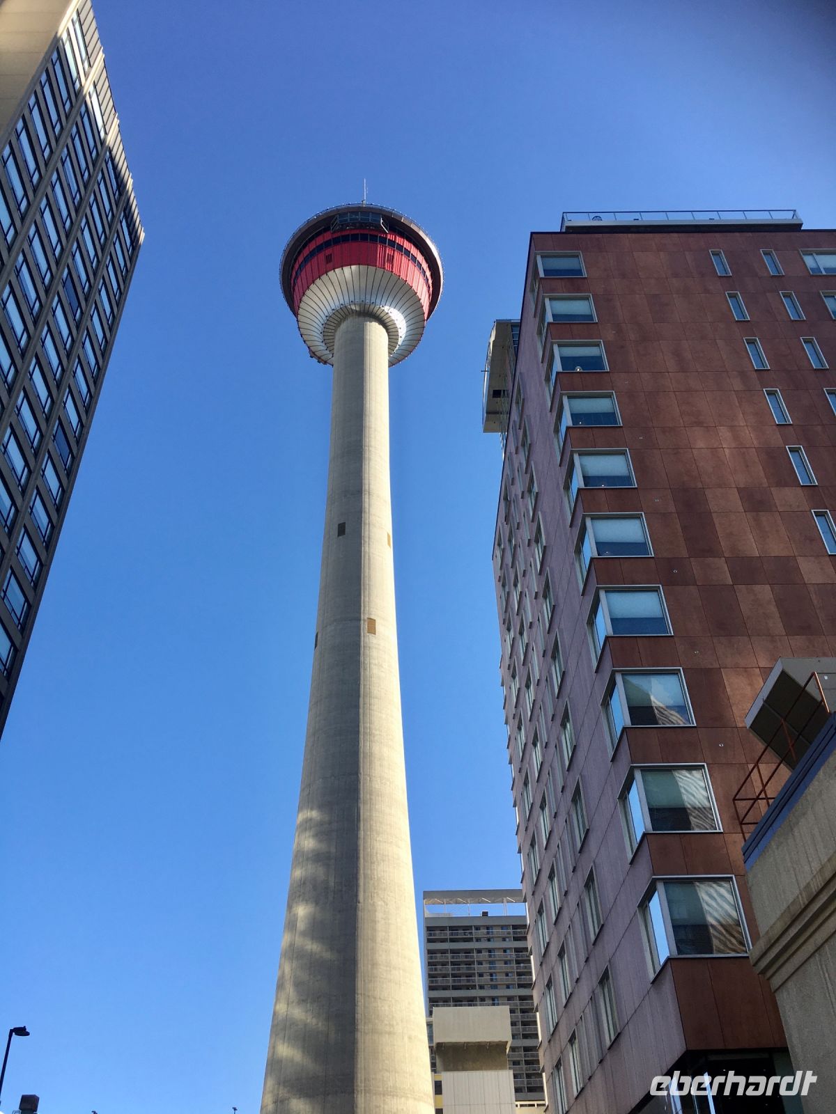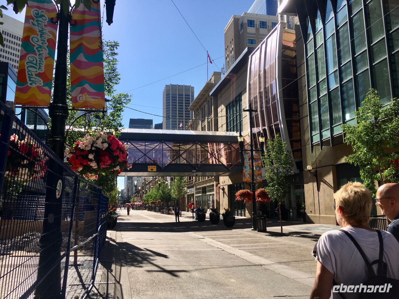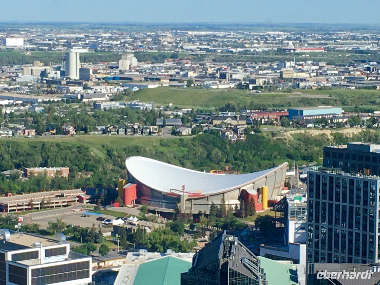 Die Zeitung ist abbestellt, die Nachbarn schauen aufs Kaetzchen und die Bluemchen, Bello ist in der Hundepension und das Koefferchen steht schon bei der Tuer bereit. Es ist gluecklich, dass es wieder weit weg fliegen kann. Alle Koffer, Taschen, Rucksaecke, Fotoapparate und ihre stolzen Besitzer treffen sich, wie geplant, im Frankfurter Flughafen am Gate nach Calgary und checken am Mittag in die Air Canada ein. Der Dreamliner 787 bringt uns und die anderen 290 Passagiere sicher und angenehem nach Calgary. Wir sitzen zwar gut, aber an die 60 bzw. 70 cm Sitzflaeche, die nun jeder als seine eigene Spielwiese beanspruchen darf, gewoehnt man sich nur schwer und gluecklich sind wir, wenn wir nach fast 10 Stunden im fernen Kanada landen. Oh nein, ein Koffer wollte nun doch nicht mit, oder vielleicht wollte er aber er wusste wohl nicht wie, denn er ging kurzfristig auf eigene Wege und trifft seine stolze Besitzerin erst 2 Tage spaeter, in Banff wieder. Wir werden alsobald durch die Passkontrolle gewinkt und wandern aus dem niedlichen Flughafengebaeude. Unser Fahrer wird durch einen Stau aufgehalten also warten wir die weiteren 15 Minuten geduldig. Da ist er ja, in seinem weissen Minibus fahren wir bloss 15 Minuten ehe wir das grosse Fairmont Palliser Hotel vor uns sehen. Wir beziehen die schoenen Zimmer dieses 5 Sterne Hotels, staunen ueber die vielen Kissen die das Riesenbett schmuecken, ueberlegen uns schon mal, wie man des Bettes Zugang spaeter wohl finden wird und gehen vorerst gleich auf unseren Stadtrundgang dieser jungen Oel-gezeichneten Grossstadt. Wir spazieren auf der Stephens Avenue, schauen uns die schoenen alten Gebaeude an, die vor den wirklich tollen Glasspalaesten stehen und horchen den Geschichten zu, die diese Stadt zeichnet. Am Ende der Stadtfuehrung fahren wir nun auf den 193 Meter hohen Calgary Turm um die gewaltige Aussicht von da oben zu erleben. Wir sehen sogar bereits die Rockies. Morgen wird ein herrlicher Tag. Unsere Augenlider wollen nicht mehr so richtig mitmachen also goennen wir uns noch einen kleinen Happen und ein Bierchen in einem der vielen Schenken ehe wir nicht in den weichen Federbetten mit den vielen Kissen in einen Tiefschlaf verfallen.
