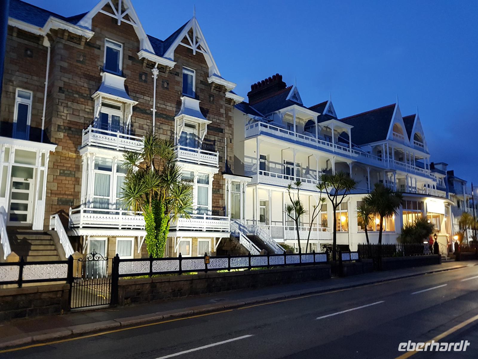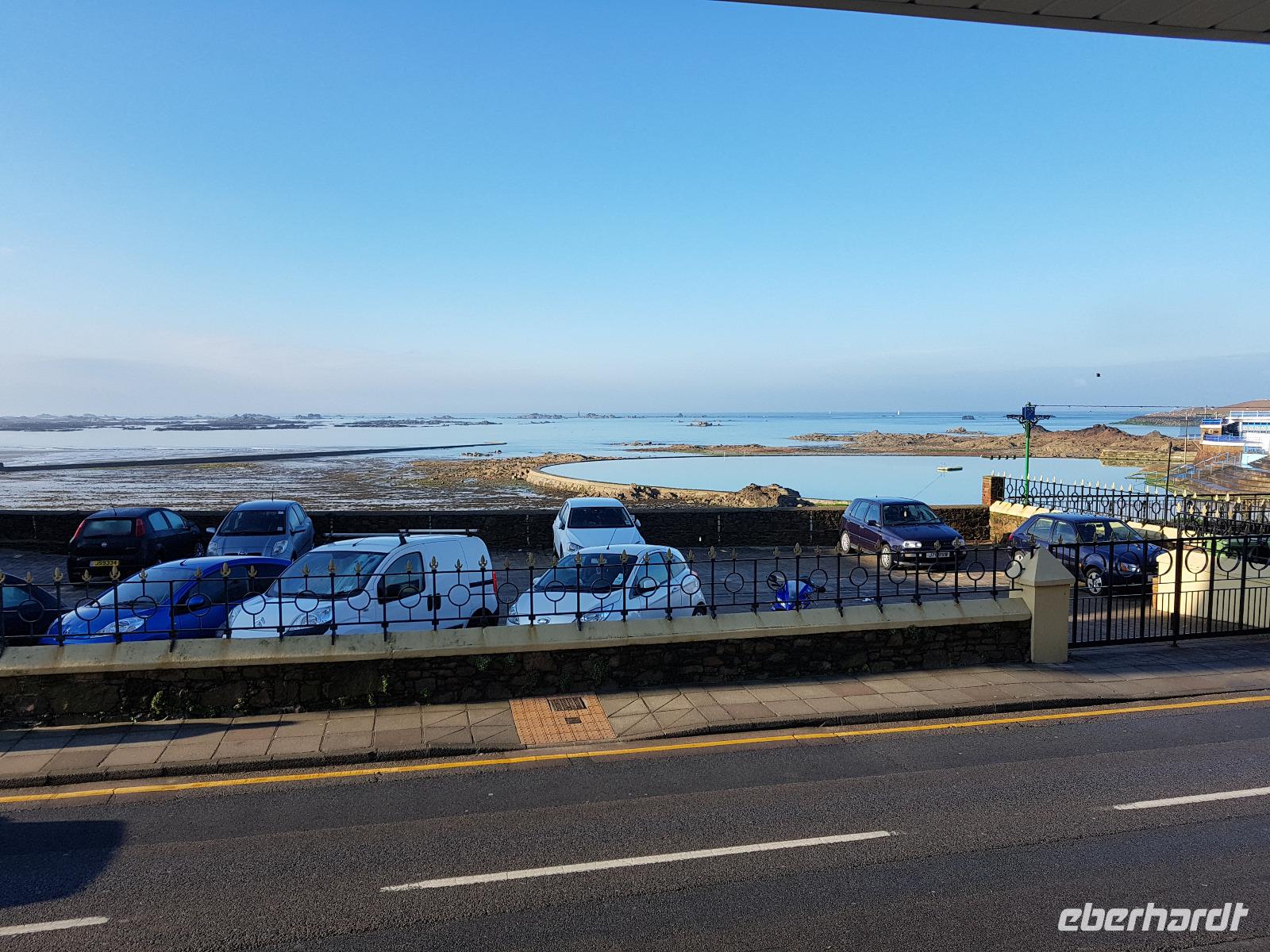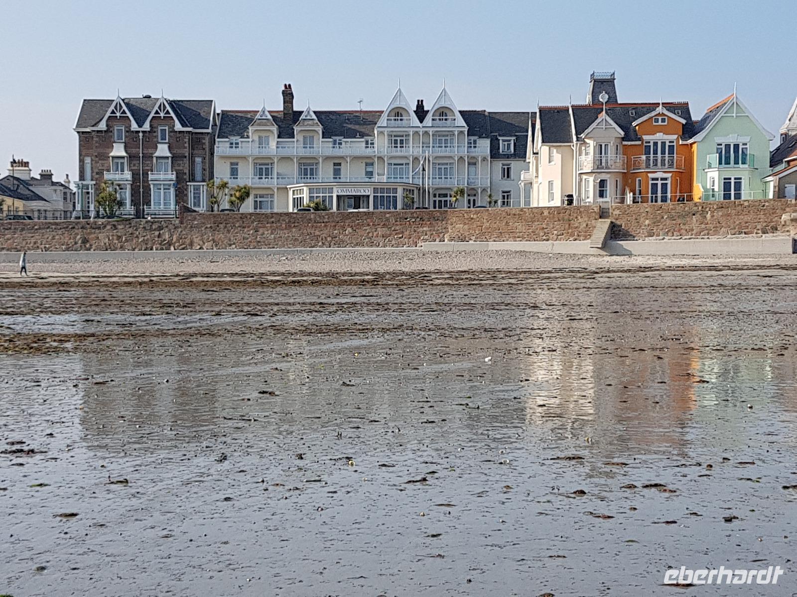 Fast alle Gäste nutzten den Haustürtransfer von Eberhardt Travel nach Berlin-Schönefeld. Gemeinsam flogen wir dann nach London, mußten dort unser Gerpäck aufnehmen und erneut am Automaten wieder einchecken, bevor wir dann nach einer knappen Flugstunde auf Jersey landeten. Ernst erwartete uns schon und brachte uns im Kleinbus ins Hotel Ommaroo direkt am Atlantik. Schnell wurden die Zimmer verteilt und danach machten wir uns zu Fuß auf den Weg, Jerseys Hauptstadt St. Helier kennenzulernen. Markthalle und Fischhalle, die gute Jersey Ice Cream auf der Fußgängerpromenade, der Busbahnhof und schließlich die Promenade gegenüber dem Elizabeth Castle konnten wir in knapp 2 Stunden zu Fuß erkunden. Vor dem Abendessen trafen wir uns in der Bar und wählten unser Abendmenue aus. Bei einem Glas Sekt mit frischen Erdbeeren stellte sich jeder vor und dann gingen wir ins Restaurant zum Abendessen. Manch einer glaubte, daß es am ersten Abend ein besonderes Essen zur Begrüßung gab. Aber das Essen war jeden Abend so einzigartig und schmackhaft !