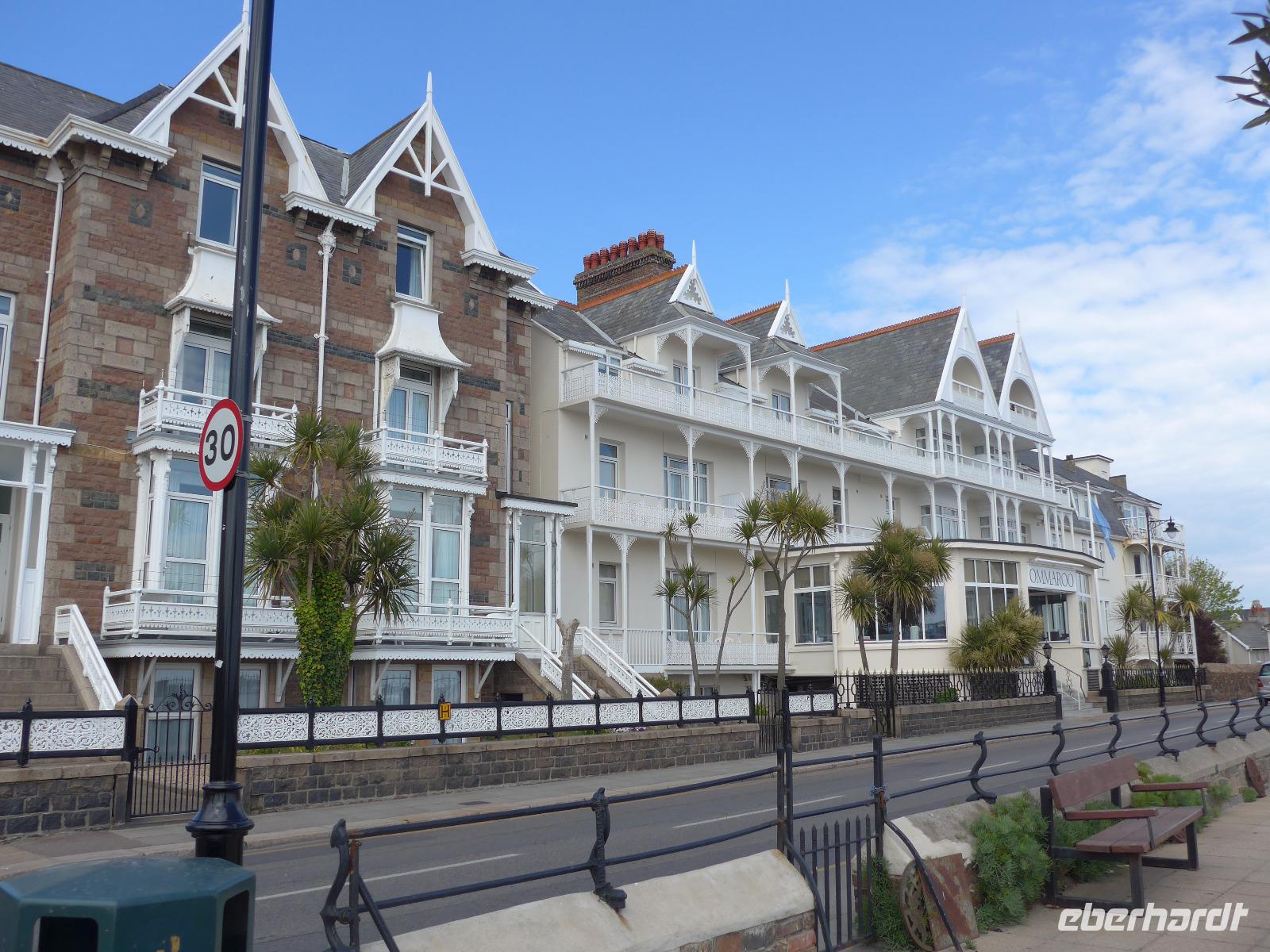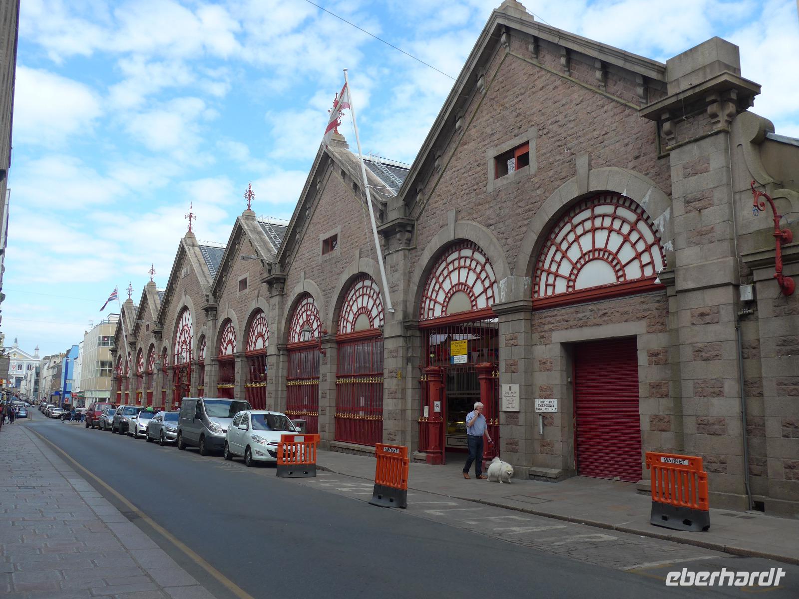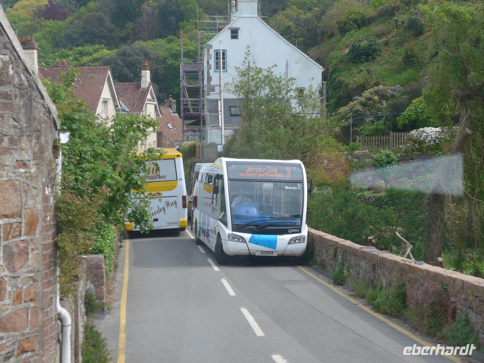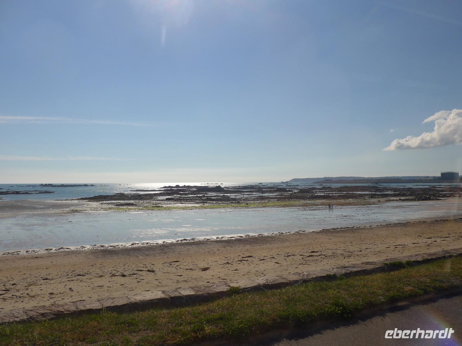 Fast alle Gäste nutzten den Haustürtransfer von Eberhardt Travel nach Berlin-Schönefeld. Gemeinsam flogen wir dann nach London, mußten dort unser Gerpäck aufnehmen und erneut am Automaten wieder einchecken, bevor wir dann nach einer knappen Flugstunde auf Jersey landeten. Ernst erwartete uns schon und brachte uns im Kleinbus ins Hotel Ommaroo direkt am Atlantik. Schnell wurden die Zimmer verteilt und danach machten wir uns zu Fuß auf den Weg, Jerseys Hauptstadt St. Helier kennenzulernen. Markthalle und Fischhalle, die gute Jersey Ice Cream auf der Fußgängerpromenade, der Busbahnhof und schließlich die Promenade gegenüber dem Elizabeth Castle konnten wir in knapp 2 Stunden zu Fuß erkunden. Vor dem Abendessen trafen wir uns in der Bar und wählten unser Abendmenue aus. Bei einem Glas Sekt mit frischen Erdbeeren stellte sich jeder vor und dann gingen wir ins Restaurant zum Abendessen. Manch einer glaubte, daß es am ersten Abend ein besonderes Essen zur Begrüßung gab. Aber das Essen war jeden Abend so einzigartig und schmackhaft !