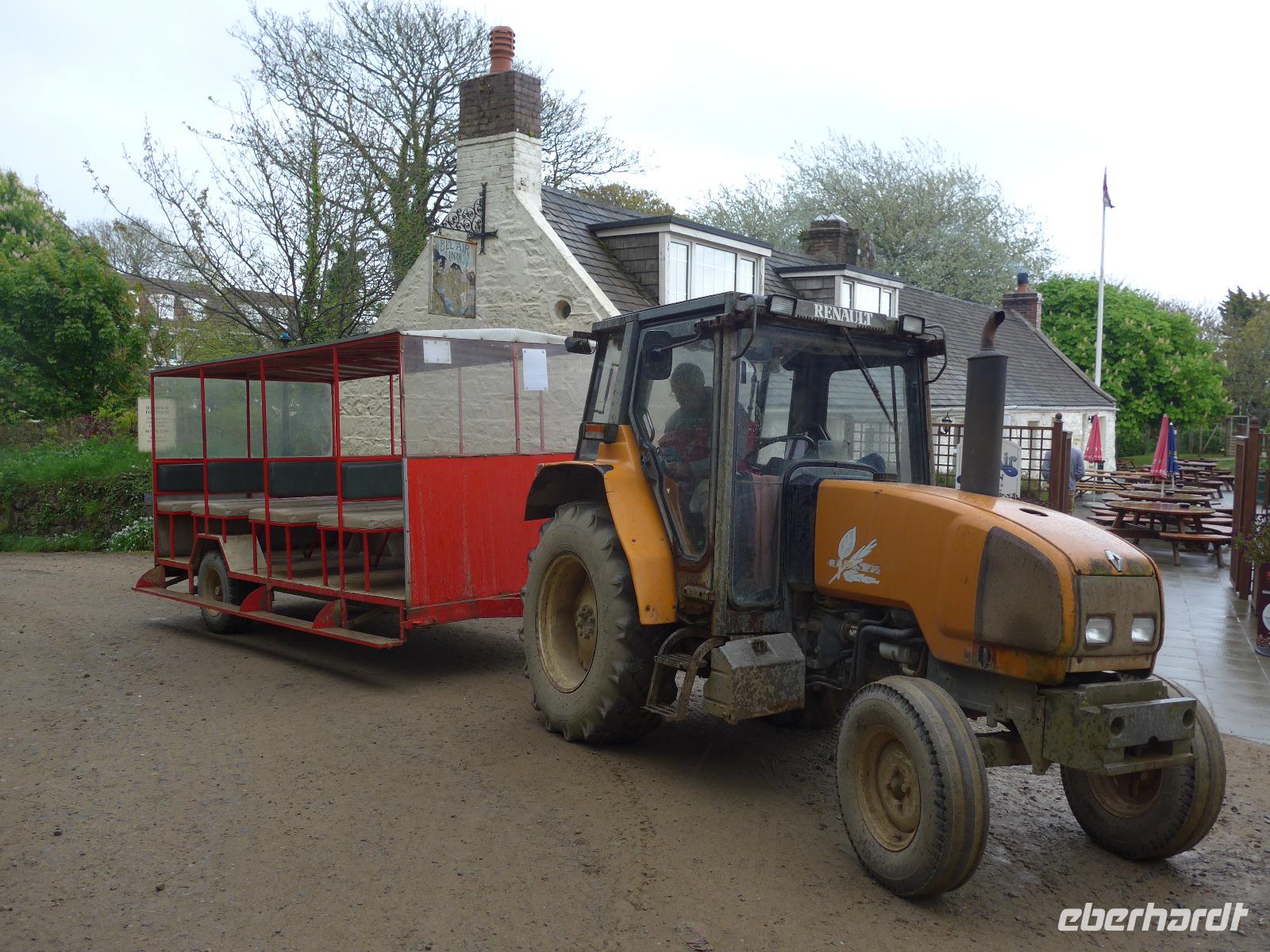 Wir kamen bei Flut an und mußten so vom Oberdeck aussteigen. Dann gings mit einem Traktor steil hinauf auf die Insel Sark. Wir besuchten zunächst die Kirche und liefen dann weiter vorbei am Haus des Arztes und am Gebäude des Parlaments zur Seigneurie. Der Seigneur regiert noch heute den kleinsten Feudalstaat Europas. Wir besichtigten das Taubenhaus und den Garten der Seigneurie. Unsere Mittagspause machten wir im kleinsten Lokal der Insel mit einem reichhaltigen Angebot an Kuchen und verschiedenen Speisen. Nun folgte unsere Wanderung durch die Insel und auf einem Küstenpfad zum La Coupee, einem Damm zwischen Sark und Little Sark. Von Little Sark reichte unser Blick über die anderen Kanalinseln. Wir hatten Glück, unsere Wanderung konnte ohne Regen stattfinden. Wieder zurück in Sark nahmen wir noch einen Kaffee und besuchten die hübschen kleinen Geschäfte.