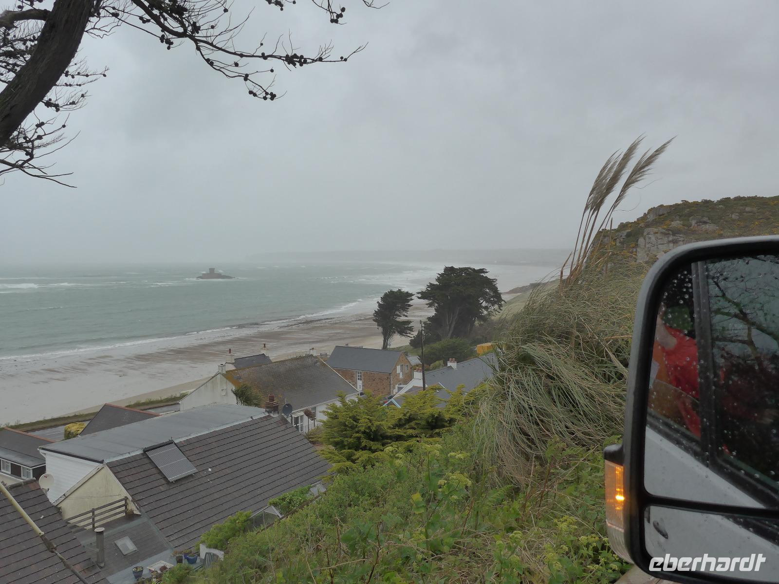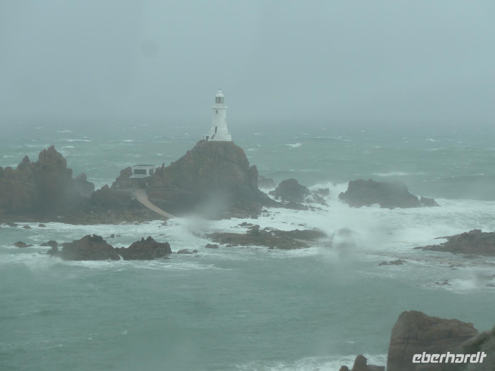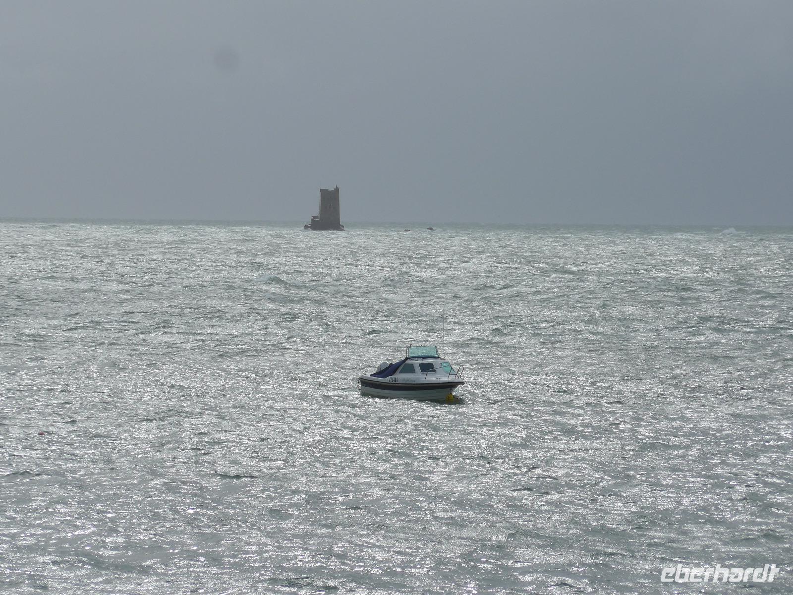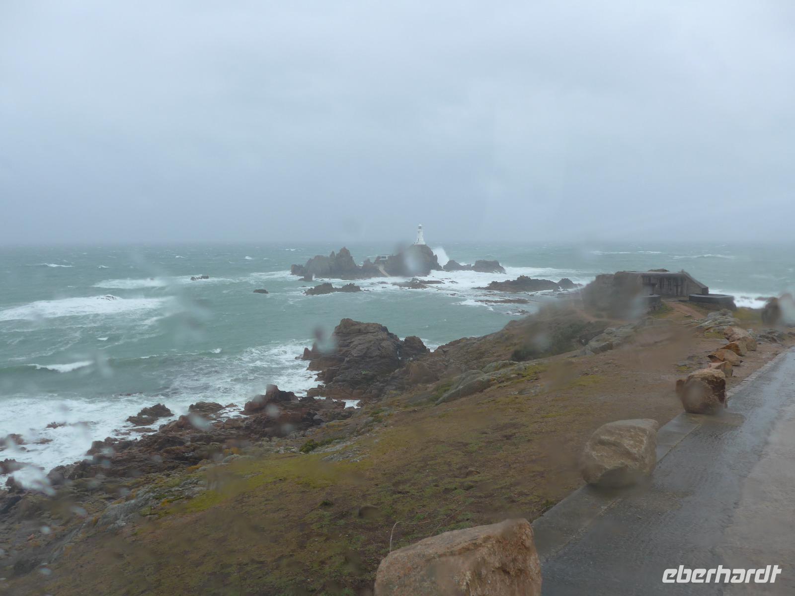 Schon in der Nacht kamen Sturm und Regen auf und so starteten wir wieder mit Heidi zu unserer Inselrundfahrt gegen den Uhrzeigersinn. Es war Flut und so sah die Ostküste wenig spektakulär aus. In Gorey machten wir unsere erste Pause ohne Regen. Dann brachte uns Heidi zu St. Cathrins Breakwater und über die Rozel Bay zur Bouley Bay. Dort gab es wieder eine kurze Pause, um nach Jacobsmuschelschalen Ausschau zu halten. Vorbei an der Bonne Nuit Bay erreichten wir Greve de Lecq für eine längere Mittagspause. Leider regnete es und so konnten wir den schönen Sandstrand nur aus der Ferne betrachten. Nach kurzer Fahrt waren wir am Grosnez Castle und dort waren Regen und Wind so stark, daß nur ich mich aus dem Bus traute. Die Straße hinunter an die Westküste war aussichtsreich aber Sturm und Regen wurden immer stärker. Am Corbiere Leuchtturm fuhr Heidi so weit wie möglich nach vorn und im Wettlauf mit dem Scheibenwischer machten wir Fotos durch die Windschutzscheibe. Aussteigen wollte hier niemand ! In St. Brelade hielt unser Bus an den beiden Kirchen und wir besichtigten sie. Auf die Kaffeepause im Ort verzichteten wir und fuhren gleich zurück ins Hotel. Zum Abendessen brachte uns Ernst mit dem Bus in das Lokal Soy Seafood und Sushi Bar in der Stadt. Besonders die gegrillten Austern schmeckten hervorragend.