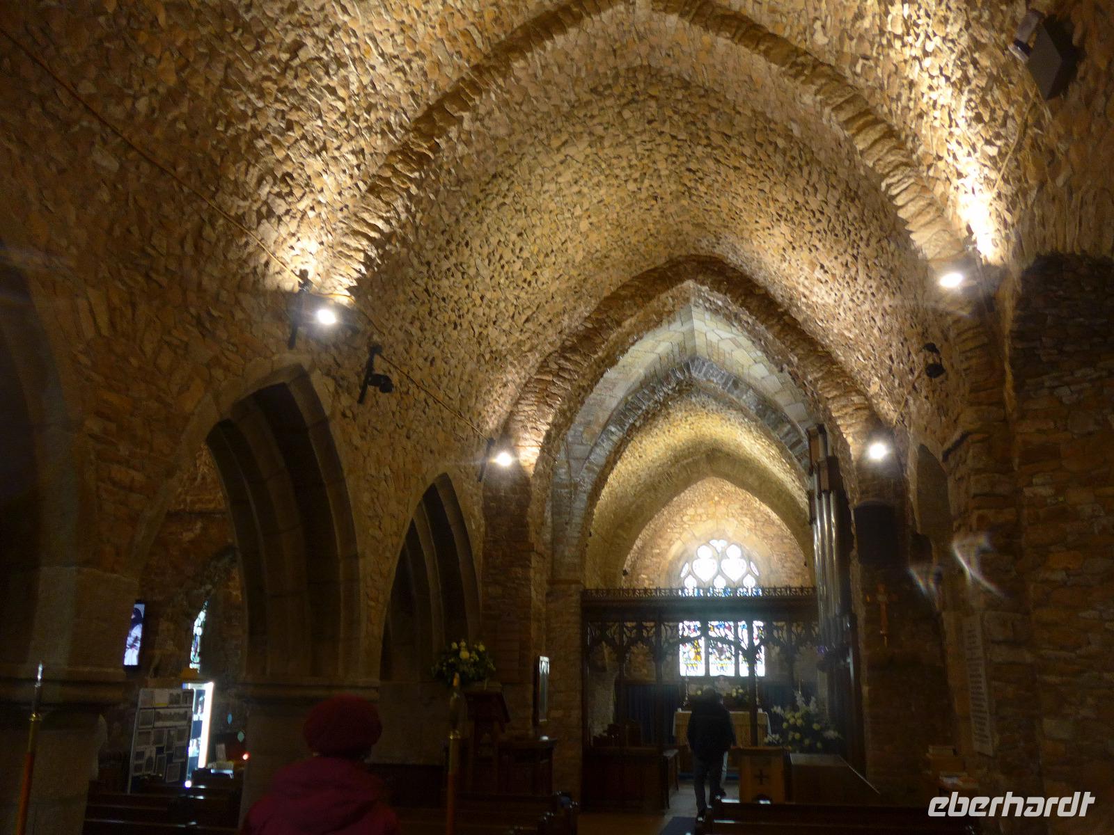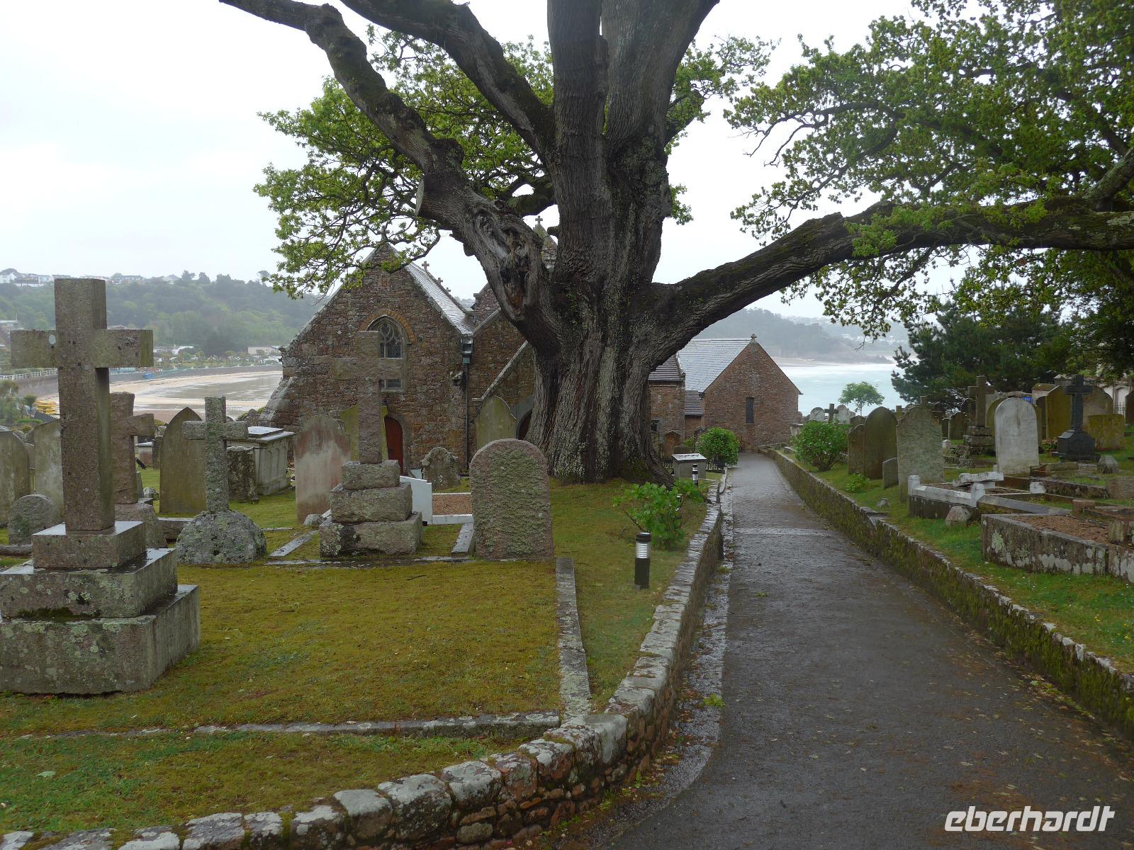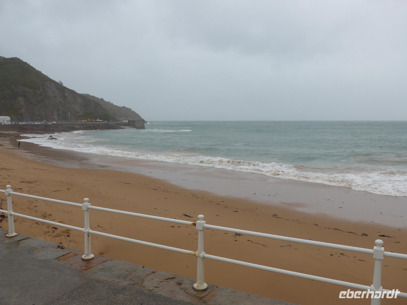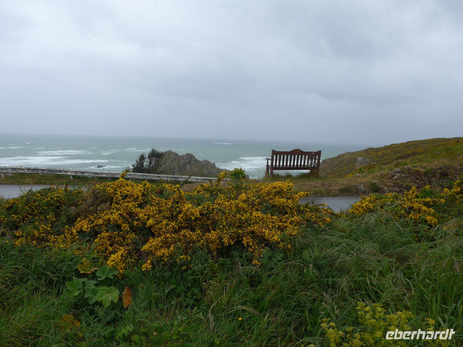 Schon in der Nacht kamen Sturm und Regen auf und so starteten wir wieder mit Heidi zu unserer Inselrundfahrt gegen den Uhrzeigersinn. Es war Flut und so sah die Ostküste wenig spektakulär aus. In Gorey machten wir unsere erste Pause ohne Regen. Dann brachte uns Heidi zu St. Cathrins Breakwater und über die Rozel Bay zur Bouley Bay. Dort gab es wieder eine kurze Pause, um nach Jacobsmuschelschalen Ausschau zu halten. Vorbei an der Bonne Nuit Bay erreichten wir Greve de Lecq für eine längere Mittagspause. Leider regnete es und so konnten wir den schönen Sandstrand nur aus der Ferne betrachten. Nach kurzer Fahrt waren wir am Grosnez Castle und dort waren Regen und Wind so stark, daß nur ich mich aus dem Bus traute. Die Straße hinunter an die Westküste war aussichtsreich aber Sturm und Regen wurden immer stärker. Am Corbiere Leuchtturm fuhr Heidi so weit wie möglich nach vorn und im Wettlauf mit dem Scheibenwischer machten wir Fotos durch die Windschutzscheibe. Aussteigen wollte hier niemand ! In St. Brelade hielt unser Bus an den beiden Kirchen und wir besichtigten sie. Auf die Kaffeepause im Ort verzichteten wir und fuhren gleich zurück ins Hotel. Zum Abendessen brachte uns Ernst mit dem Bus in das Lokal Soy Seafood und Sushi Bar in der Stadt. Besonders die gegrillten Austern schmeckten hervorragend.