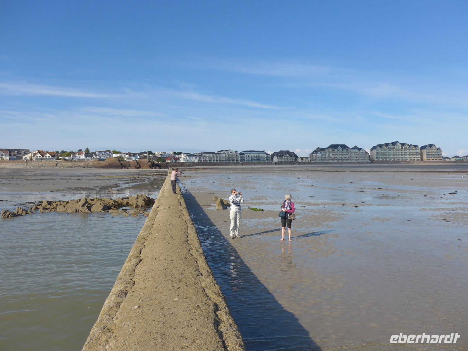 6 Singles machten sich mit mir auf den Weg zum Busbahnhof und für 2 Pfund fuhren wir nach La Hougue Bie. Dort besuchten wir das Museum mit dem neu ausgestellten Goldschmuck der Kelten und das berühmte Ganggrab. Es wurde 1924 zufällig entdeckt beim Abriss eines alten Hotels. Das Grab ist von einem 14 m hohen Hügel bedeckt, auf dem 2 Kirchen stehen. Über Green Lanes wanderten wir dann durch die Insel bis zum Garten-Center Ramsons, wo wir unsere Mittagspause machten. Weiter gings zum Faldouet Dolmen und dann zum Gorey Castle. Die "Stolze Burg" war bis zum Bau des Elizabeth Castle die Hauptfestung der Insel, später ein Gefängnis und heute ist ein fantastisches Museum in den Räumen untergebracht. Wir krochen fast in jeden Winkel und hatten viel Spaß beim Erkunden der Burg. Von ganz oben sahen wir deutlich die Küste der Nomandie. Mit dem Linienbus fuhren wir entlang der Ostküste diesmal bei Ebbe bis zu unserem Hotel zurück. Die Landschaft bei Ebbe in Ufernähe ist grandios und die Fläche der Insel Jersey verdoppelt sich - unglaublich !