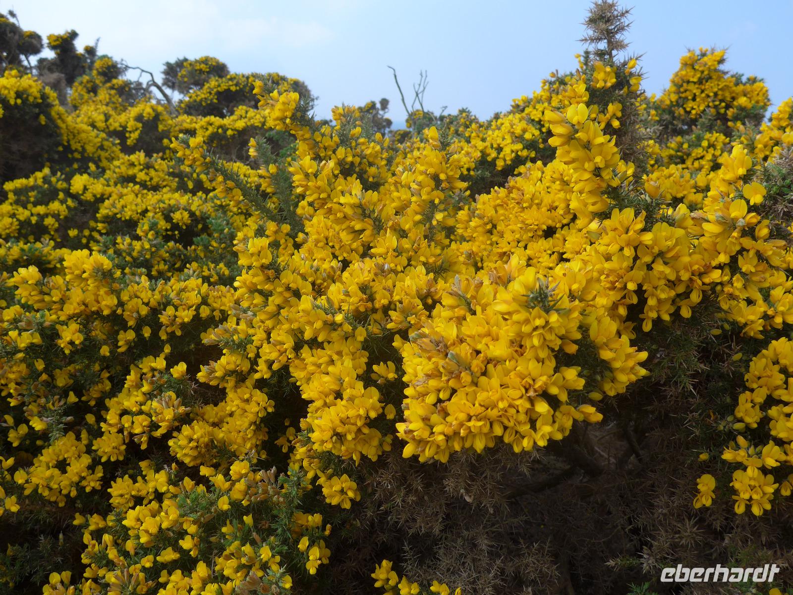Zum Frühstück gab es erst einmal ein Geburtstagsständchen für eine Teilnehmerin unserer Gruppe. Dazu hatte ich am Vortag unterwegs Wiesenblumen gepflückt. Ernst brachte uns dann mit seinem Bus nach St. Brelade und dort startete unsere Wanderung auf dem Küstenweg in Richtung Corbiere Leuchtturm. Das Gelb des Stech- und Besenginsters begleitete uns und später waren die Hänge voll mit afrikanischen Mittagsblumen in hellgelb und pink. Unser Weg ging teilweise steil bergan und bergab über Stufen und immer wieder waren herrliche Ausblicke zu genießen. Die Sonne schien, ein frischer Wind wehte - einfach perfekt zum Wandern. Gegen Mittag erreichten wir den Corbiere Leuchtturm und stärkten uns in einem Lokal mit Blick auf das Meer. Das Wasser stand noch zu hoch, um zum Leuchtturm hinüber zu laufen. So traten wir nach der ausgiebigen Mittagspause den Rückweg über den Corbiere Walk an. Dieser 7 km lange Weg verläuft auf der 1936 stillgelegten Eisenbahntrasse vom Leuchtturm bis nach St. Aubin und ist sehr gut zu gehen. In St. Aubin gönnten wir uns in der Harbour Gallery noch ein Kaffeetrinken und dann fuhren wir mit Ernst zurück zum Hotel. Es war noch früh am Tag und wieder Ebbe - die Gelegenheit für einen Strandspaziergang, Muscheln sammeln, Golfbälle finden usw.