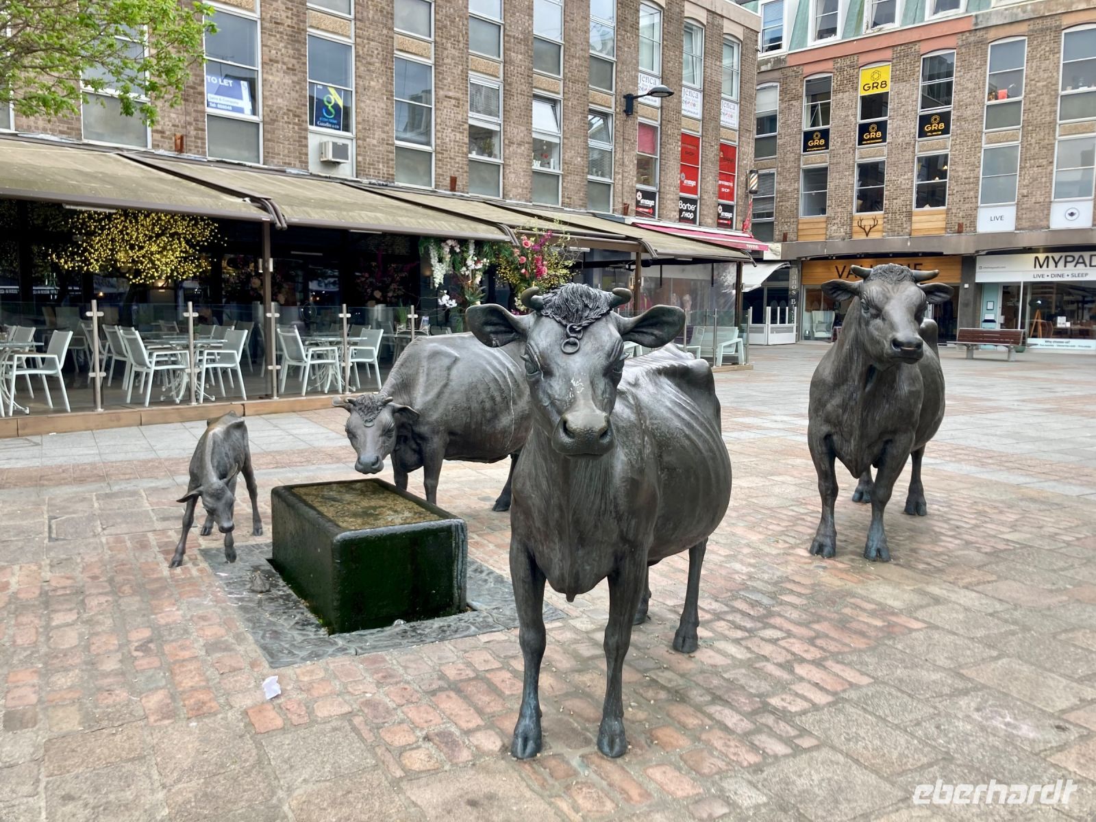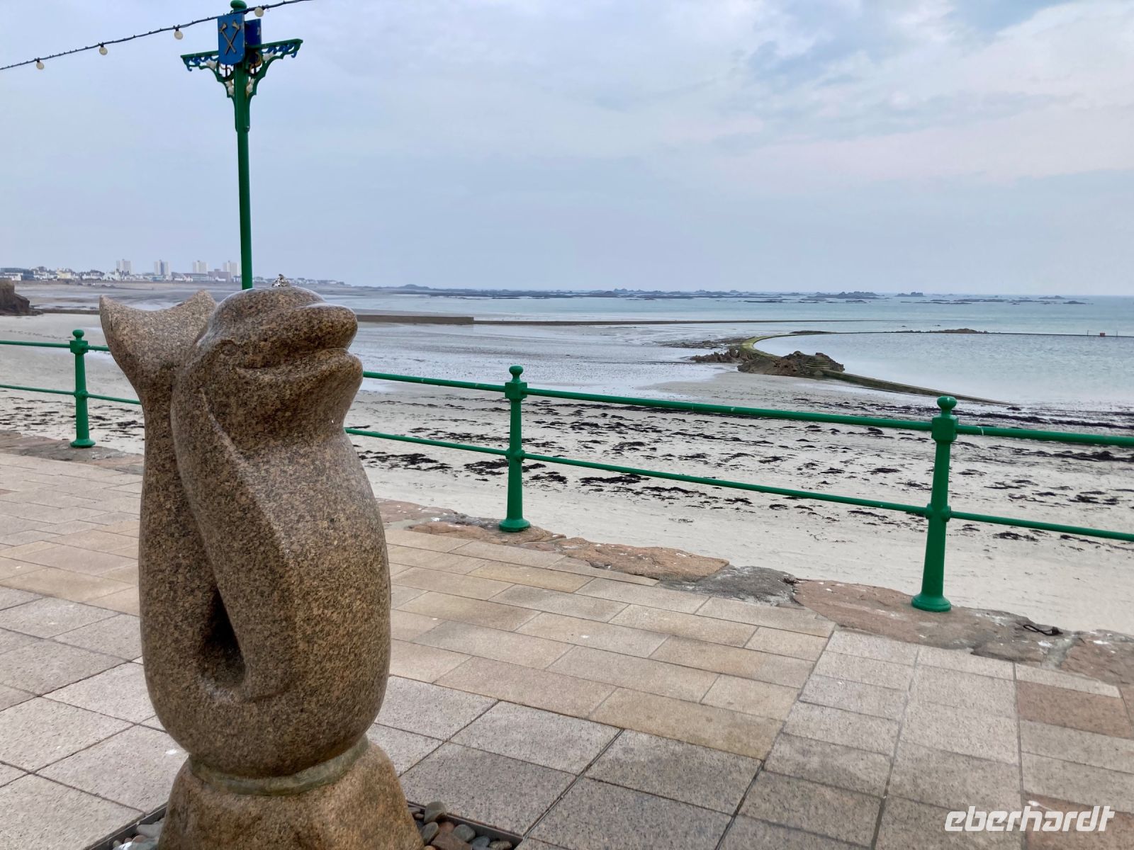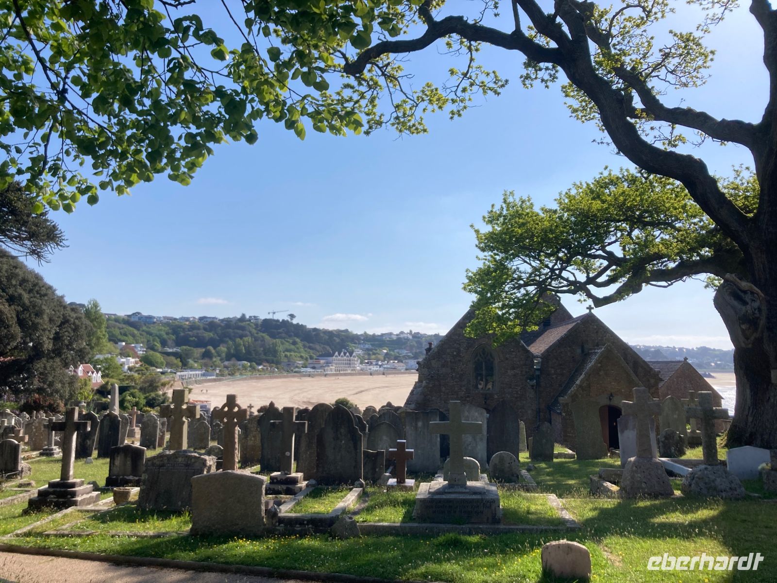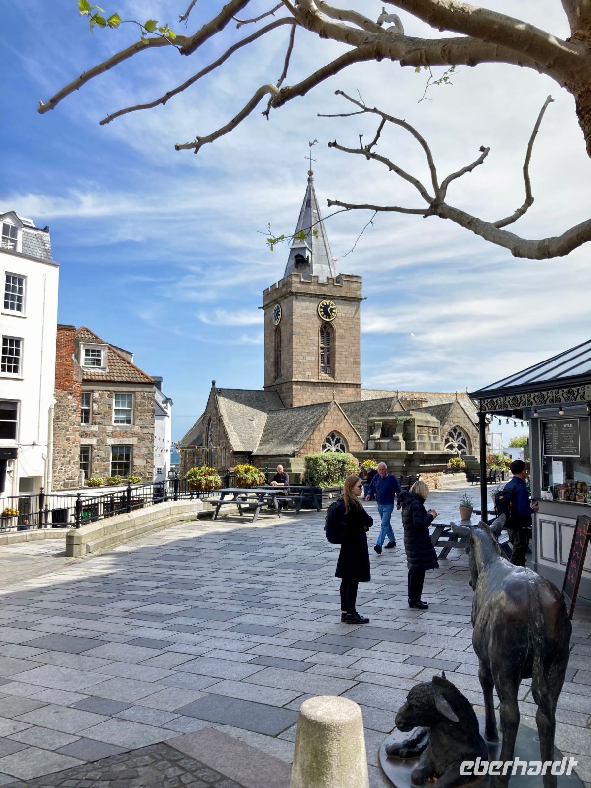 Der erste Tag startet noch vor Mitternacht für einige Gäste. Wir begeben uns aus unterschiedlichsten Himmelsrichtungen in Richtung unserer Flughäfen Düsseldorf oder Berlin. Wir landen mit etwas Verspätung am Nachmittag in Jersey und werden durch unsere örtliche Reiseleitung Heidi begrüßt. Auf der kurzen Autofahrt in Richtung Hotel staunen wir über das satte Grün der Bäume und sehen erste schöne Blüten. Im Hotel warten bereits weitere Gäste aus München auf uns, die durch eine Flugstornierung nun bereits am Vortag angereist sind. Nach kurzer Verschnaufpause im Hotel treffen sich einige Gäste von uns bereits für einen ersten Spaziergang in die Stadt. Wir schlendern die Einkaufsstraße entlang in Richtung Markthalle und sehen das Monument Jersey Cows. Guten Augen haben einen kleinen Frosch entdeckt. Am Royal Square schauen wir in die Town Church und kehren anschließend zum Hotel zurück.