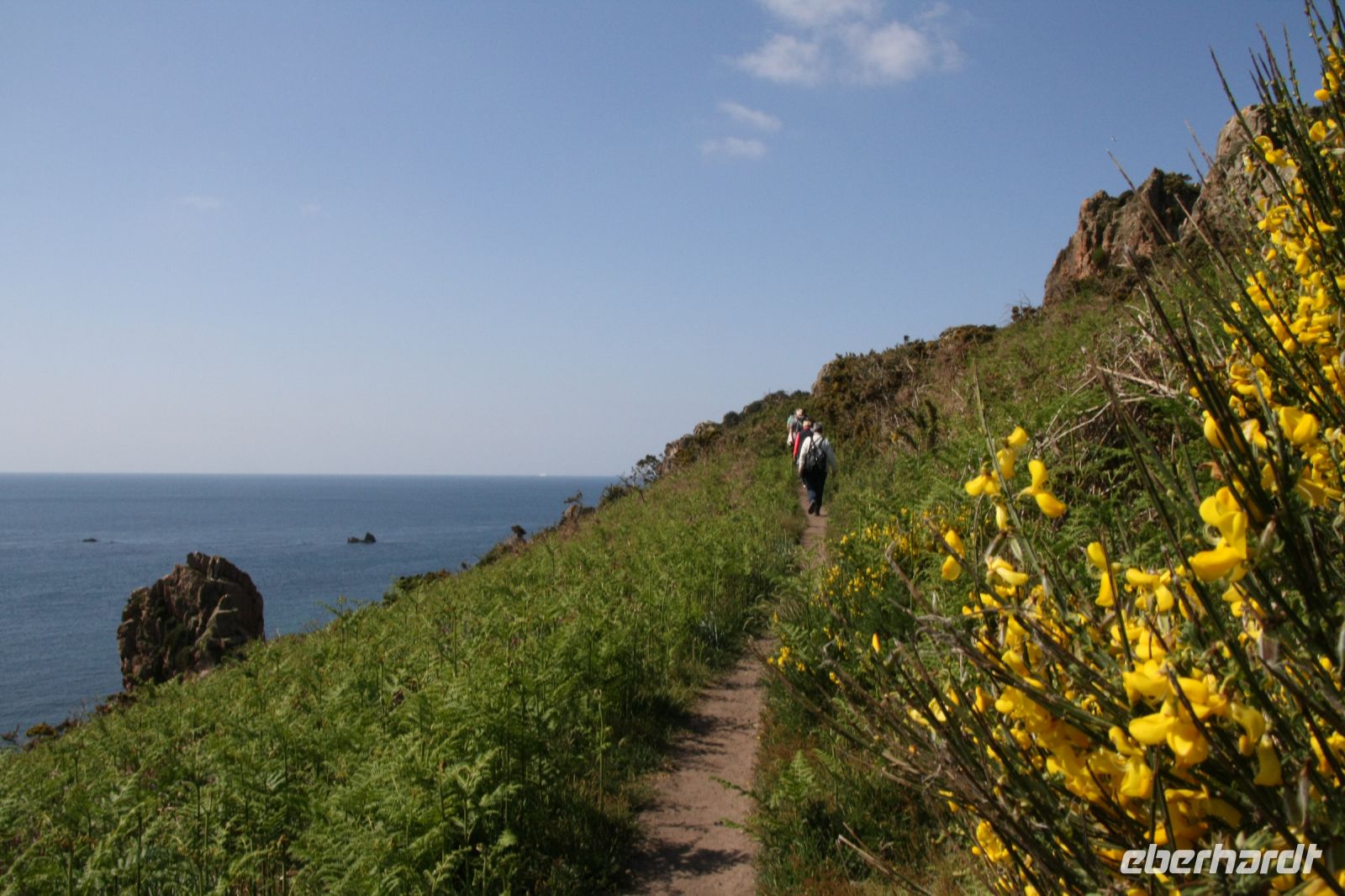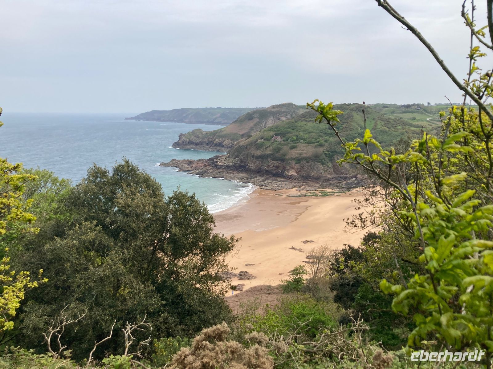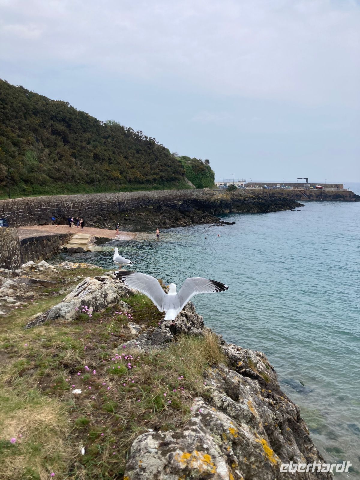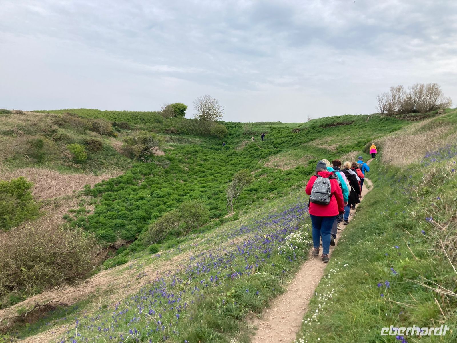Heidi und Ernst holen uns morgens am Hotel ab. Bis auf drei Gäste nehmen alle an der optionalen Wanderung an der Nordküste teil. Wir fahren vorbei an alten Mühlen durch das St Peter Valley in den Nordwesten der Insel. Bei Grosnez Castle starten wir unsere Wanderung. Zunächst ist es etwas windig und kühl. Durch die Bewegung wird uns aber schnell warm. Es geht auf und ab, immer entlang der Küste. Nach einer halben Stunde erreichen wir die Plèmont Bay. Hier befindet sich ein traumhafter Strand in einer breiten Bucht inmitten der Steilküste. Es gibt auch einen Tearoom, wo man sich ein Getränk oder Eis kaufen kann. Die Küste blüht weiß, gelb, lila und blau: Leimkraut, Ginster, Osterglocken, Hyazinthen und Bluebells. Mittagspause legen wir in Greve de Lecq ein, bevor es wieder steil hinauf geht. Insgesamt wandern wir heute ca. elf Kilometer zusammen mit Ernst. Heidi kommt uns den letzten Kilometer entgegen. Auf dem Rückweg fahren wir durch das hübsche Waterworks-Valley und sehen schöne Gärten.