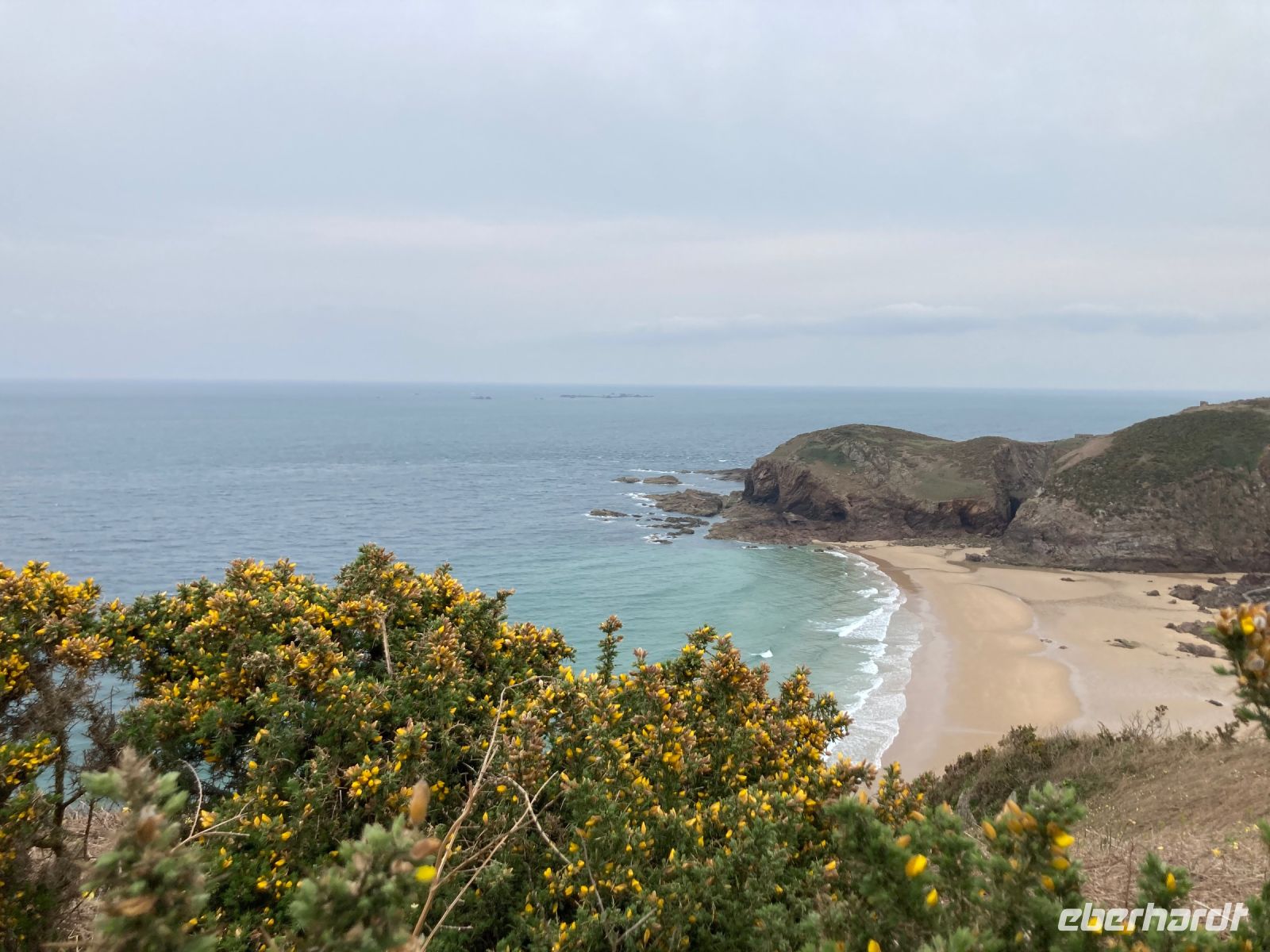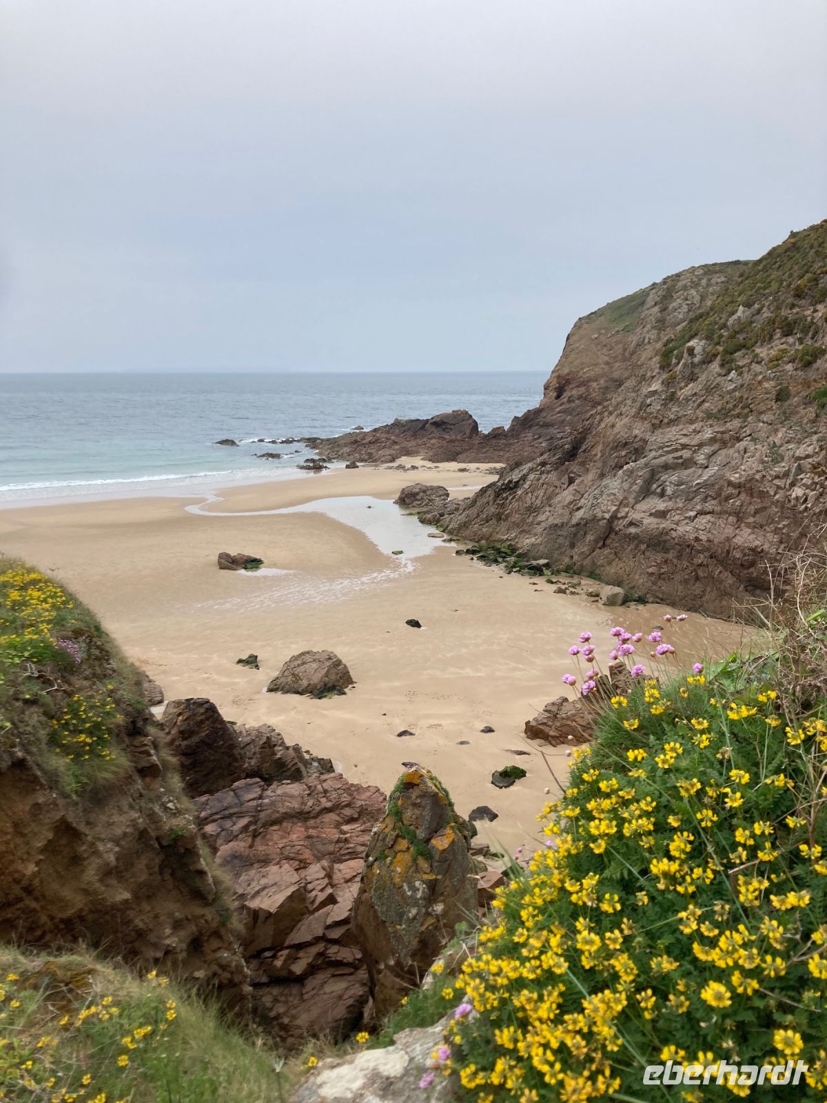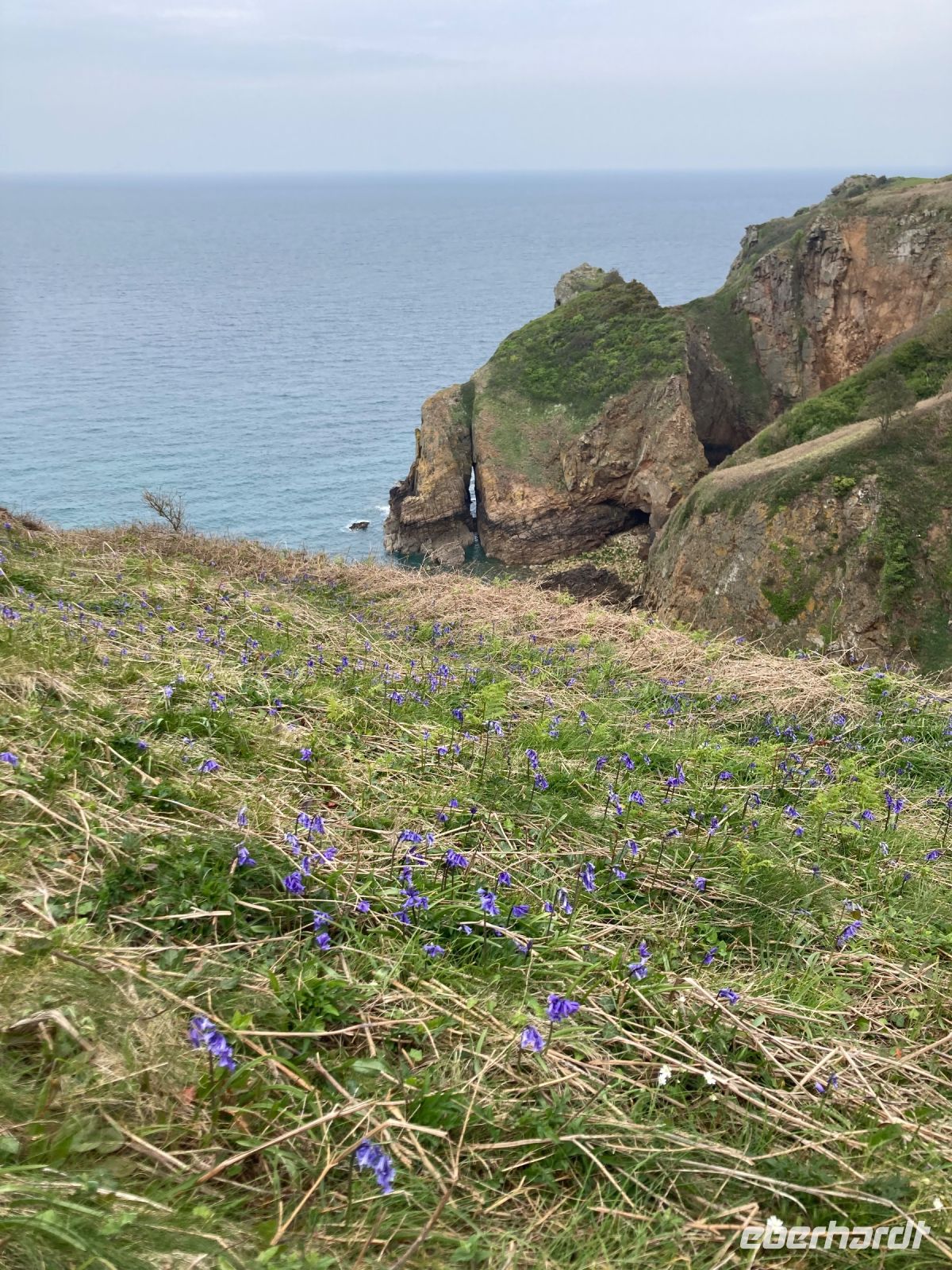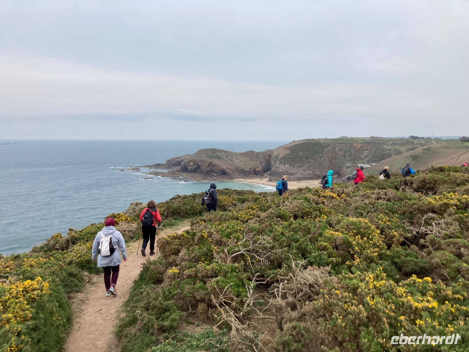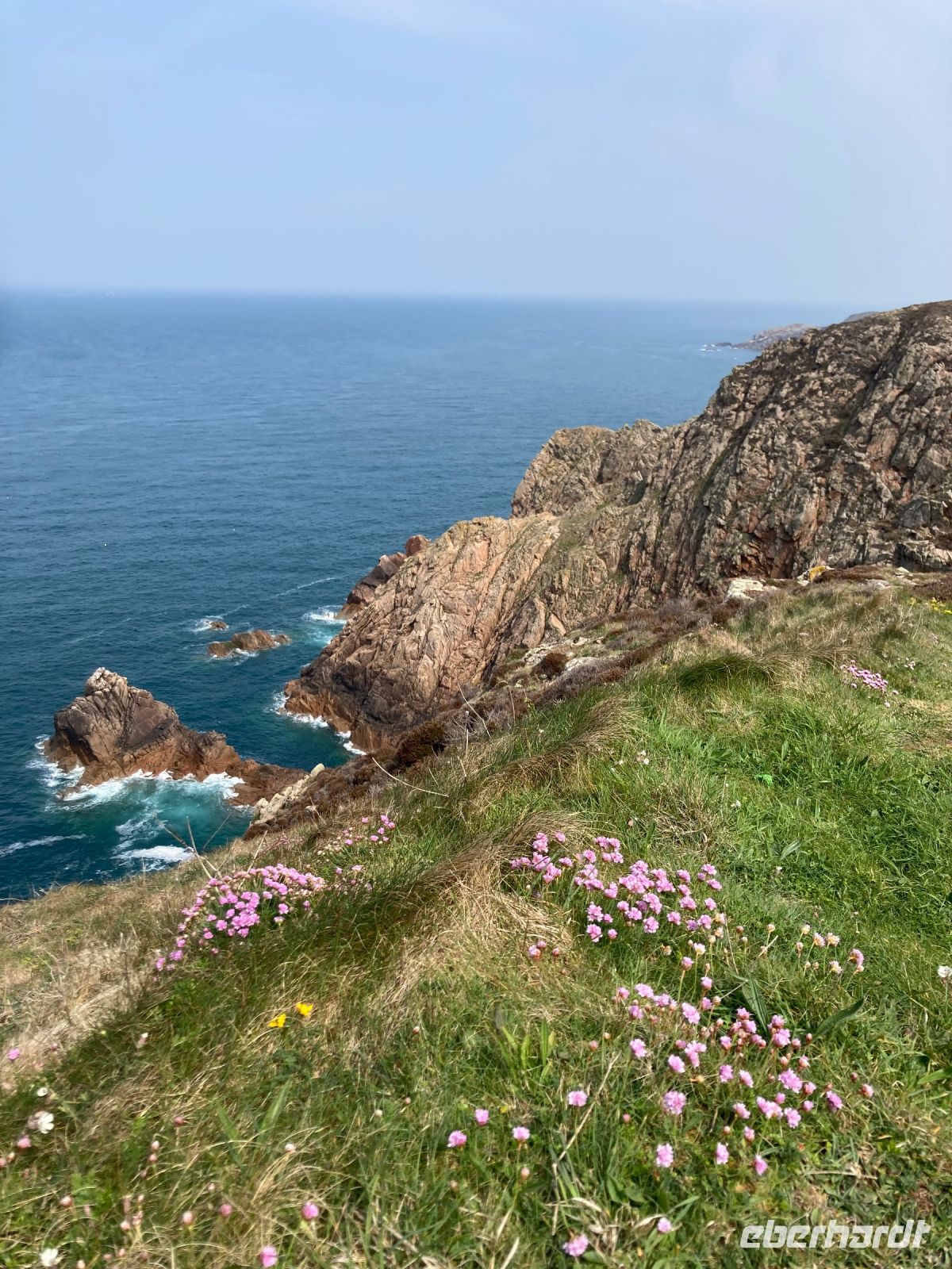 Heidi und Ernst holen uns morgens am Hotel ab. Bis auf drei Gäste nehmen alle an der optionalen Wanderung an der Nordküste teil. Wir fahren vorbei an alten Mühlen durch das St Peter Valley in den Nordwesten der Insel. Bei Grosnez Castle starten wir unsere Wanderung. Zunächst ist es etwas windig und kühl. Durch die Bewegung wird uns aber schnell warm. Es geht auf und ab, immer entlang der Küste. Nach einer halben Stunde erreichen wir die Plèmont Bay. Hier befindet sich ein traumhafter Strand in einer breiten Bucht inmitten der Steilküste. Es gibt auch einen Tearoom, wo man sich ein Getränk oder Eis kaufen kann. Die Küste blüht weiß, gelb, lila und blau: Leimkraut, Ginster, Osterglocken, Hyazinthen und Bluebells. Mittagspause legen wir in Greve de Lecq ein, bevor es wieder steil hinauf geht. Insgesamt wandern wir heute ca. elf Kilometer zusammen mit Ernst. Heidi kommt uns den letzten Kilometer entgegen. Auf dem Rückweg fahren wir durch das hübsche Waterworks-Valley und sehen schöne Gärten.