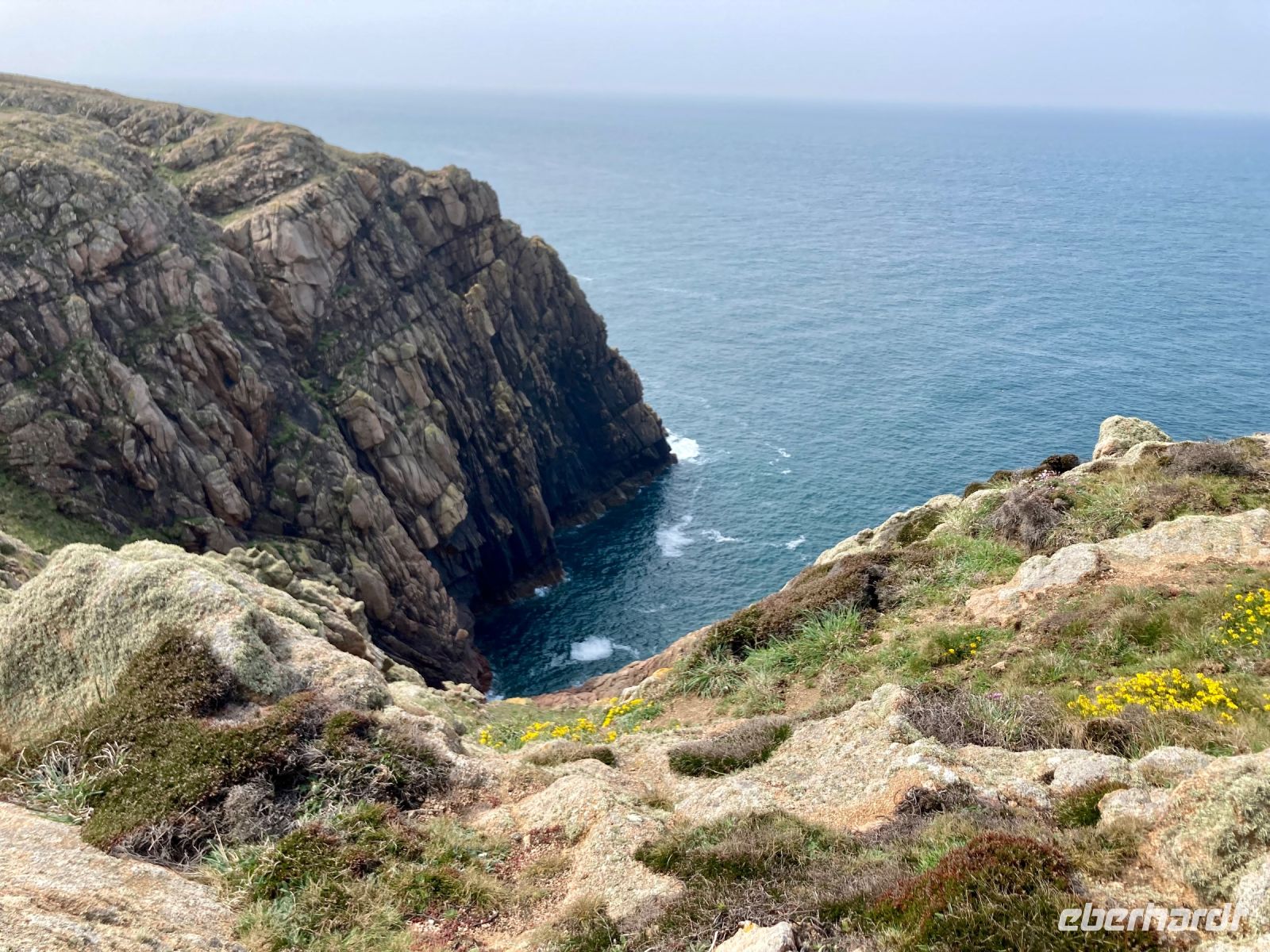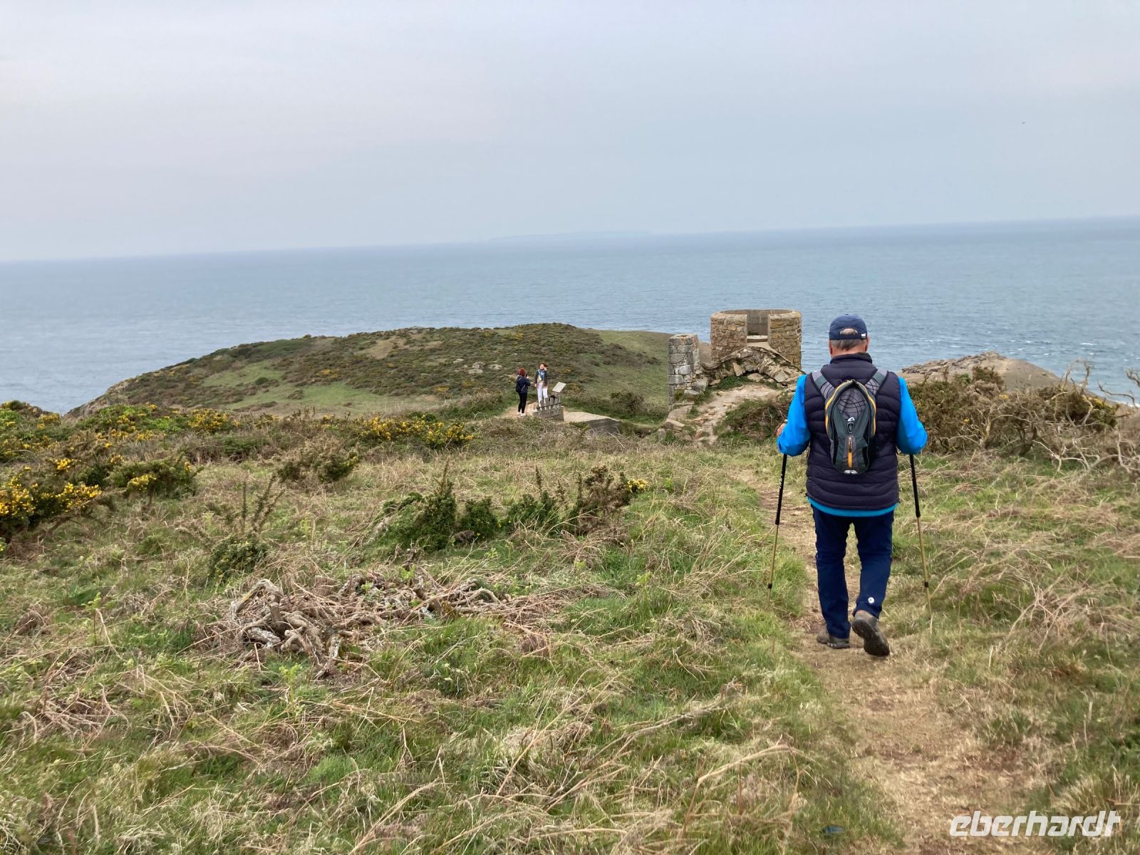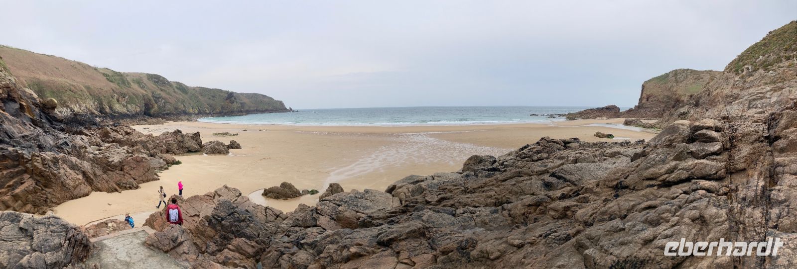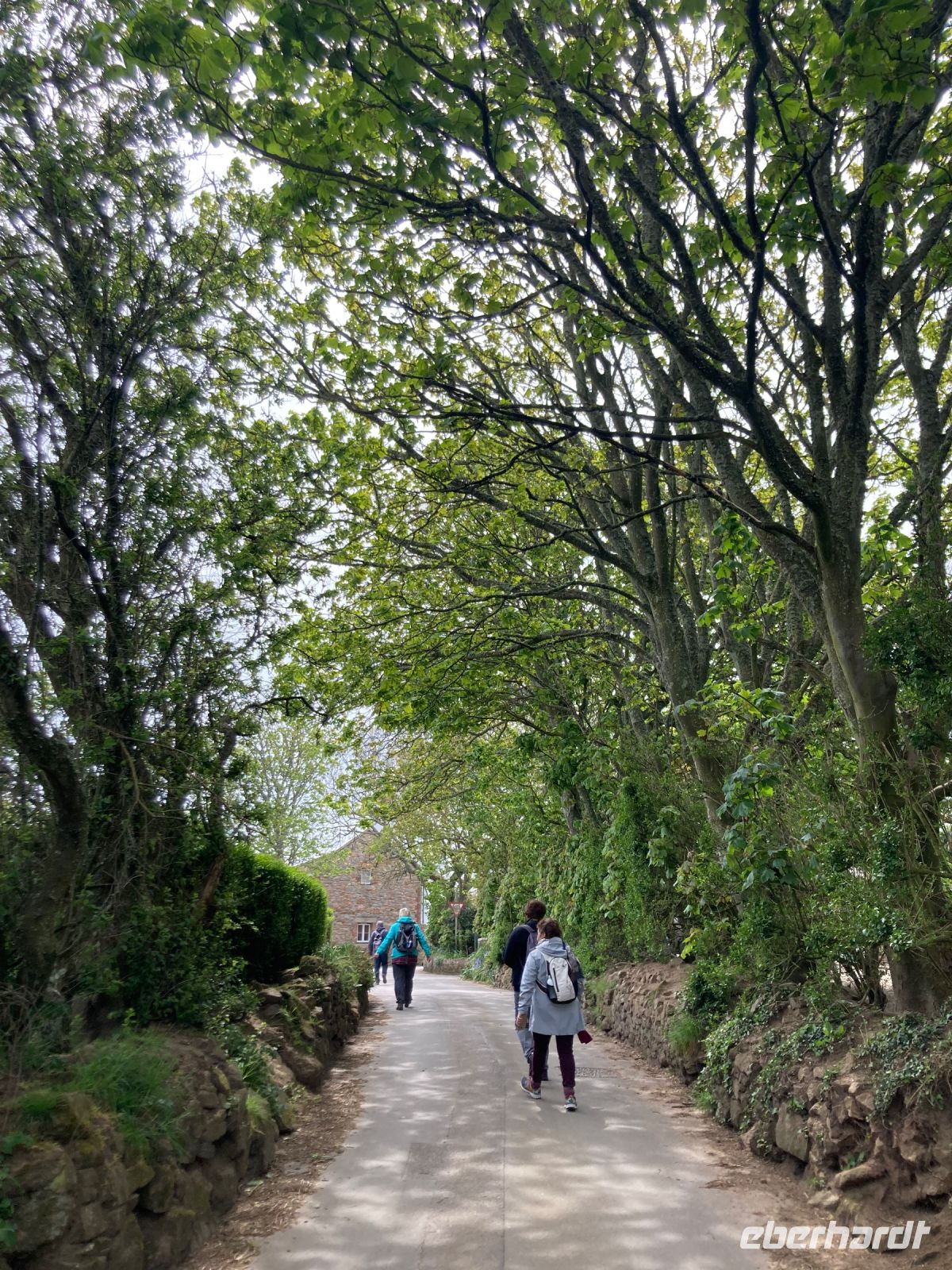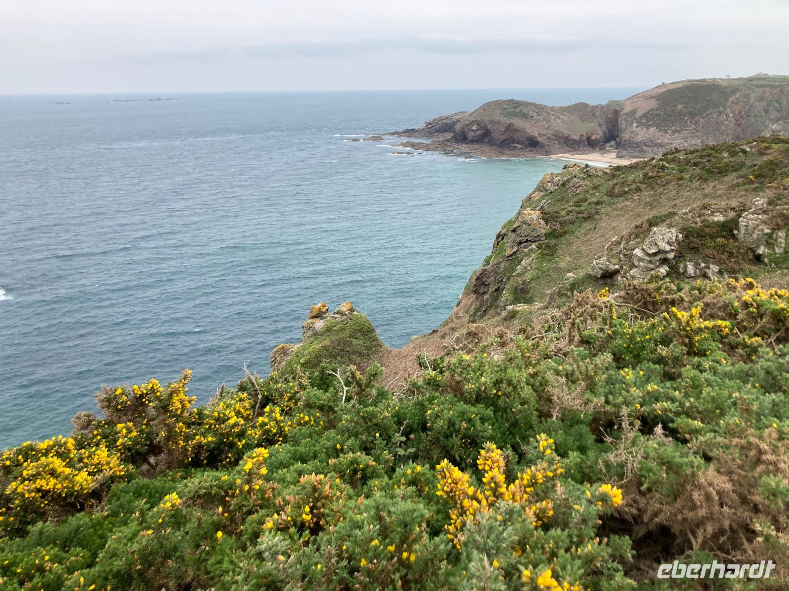 Heidi und Ernst holen uns morgens am Hotel ab. Bis auf drei Gäste nehmen alle an der optionalen Wanderung an der Nordküste teil. Wir fahren vorbei an alten Mühlen durch das St Peter Valley in den Nordwesten der Insel. Bei Grosnez Castle starten wir unsere Wanderung. Zunächst ist es etwas windig und kühl. Durch die Bewegung wird uns aber schnell warm. Es geht auf und ab, immer entlang der Küste. Nach einer halben Stunde erreichen wir die Plèmont Bay. Hier befindet sich ein traumhafter Strand in einer breiten Bucht inmitten der Steilküste. Es gibt auch einen Tearoom, wo man sich ein Getränk oder Eis kaufen kann. Die Küste blüht weiß, gelb, lila und blau: Leimkraut, Ginster, Osterglocken, Hyazinthen und Bluebells. Mittagspause legen wir in Greve de Lecq ein, bevor es wieder steil hinauf geht. Insgesamt wandern wir heute ca. elf Kilometer zusammen mit Ernst. Heidi kommt uns den letzten Kilometer entgegen. Auf dem Rückweg fahren wir durch das hübsche Waterworks-Valley und sehen schöne Gärten.