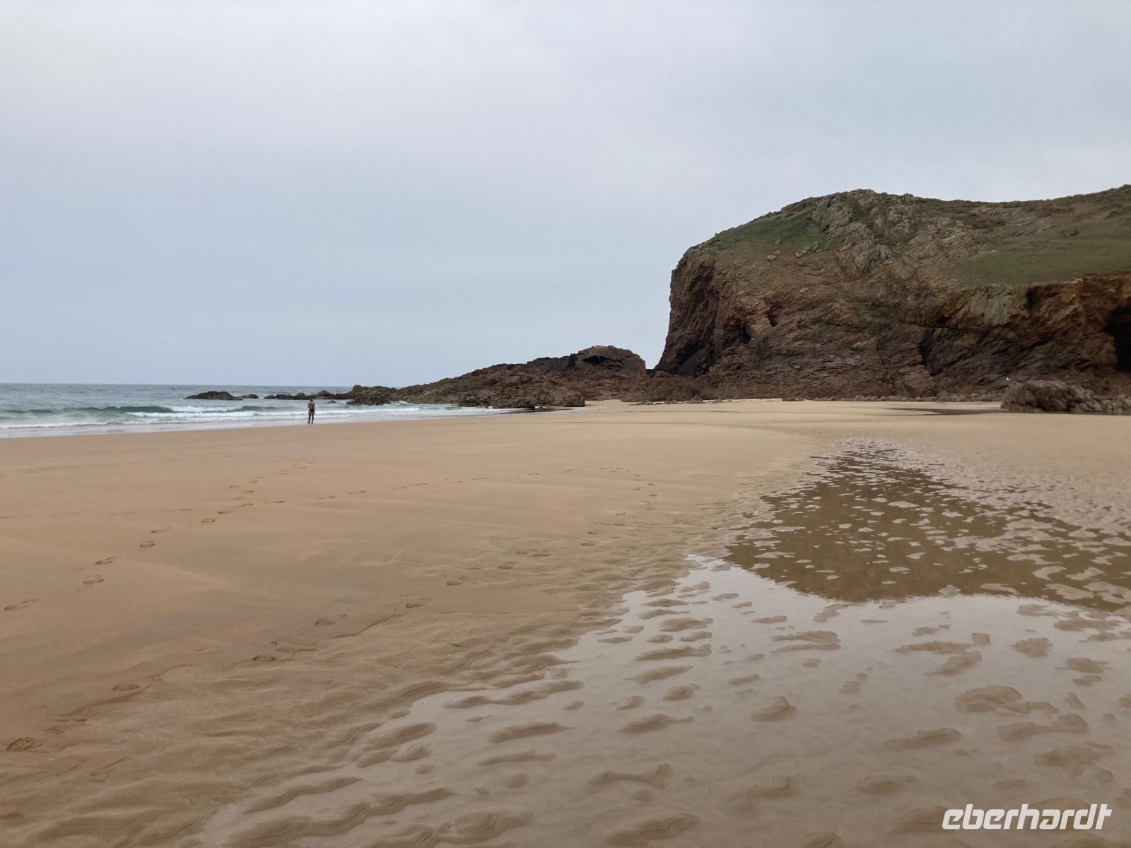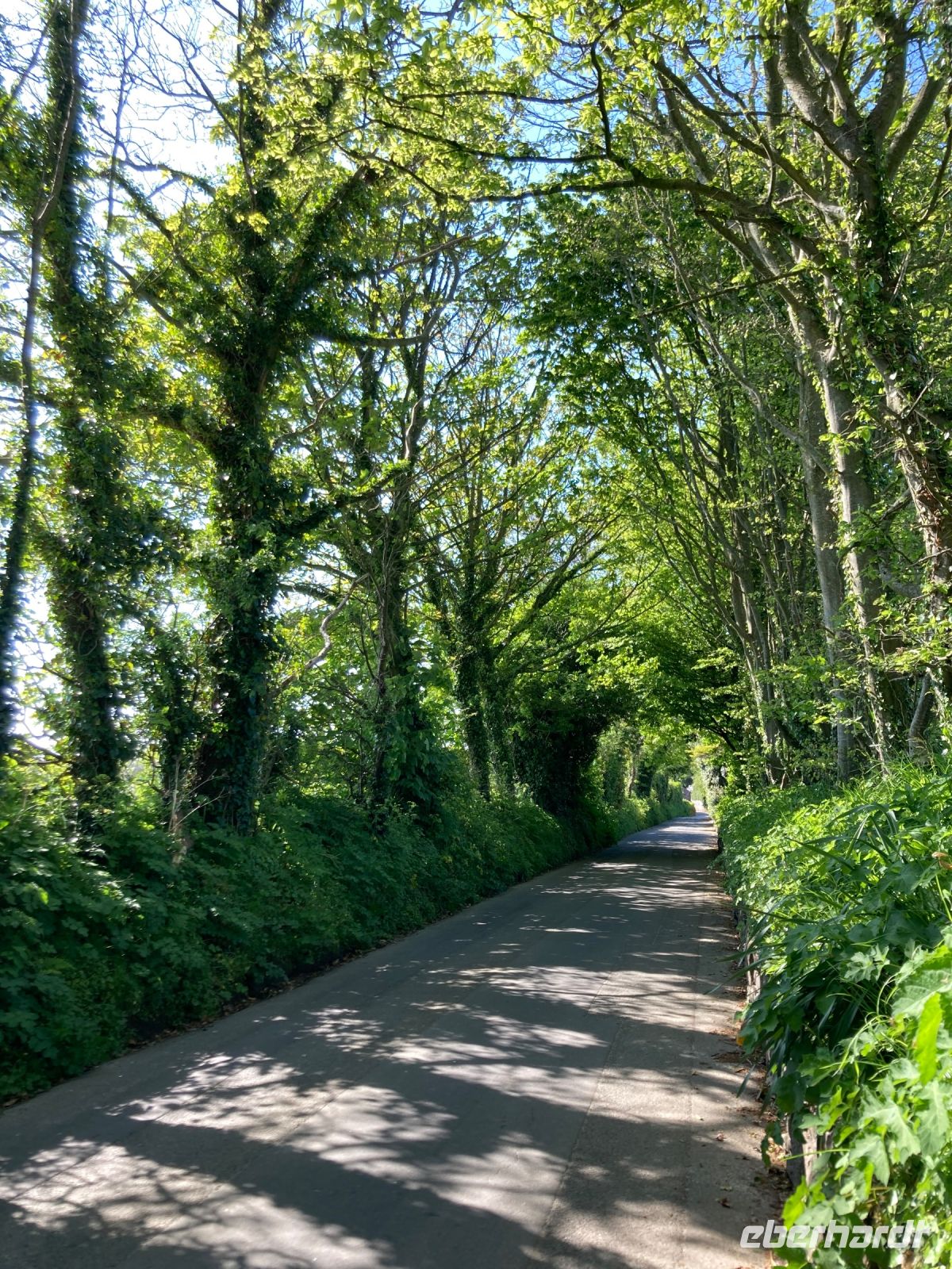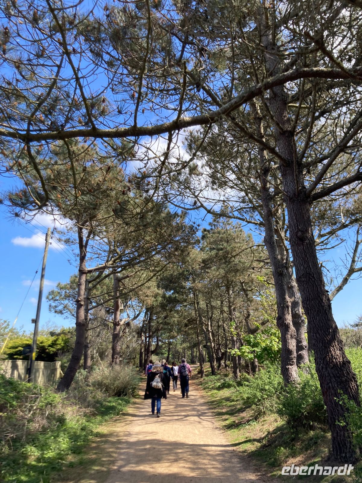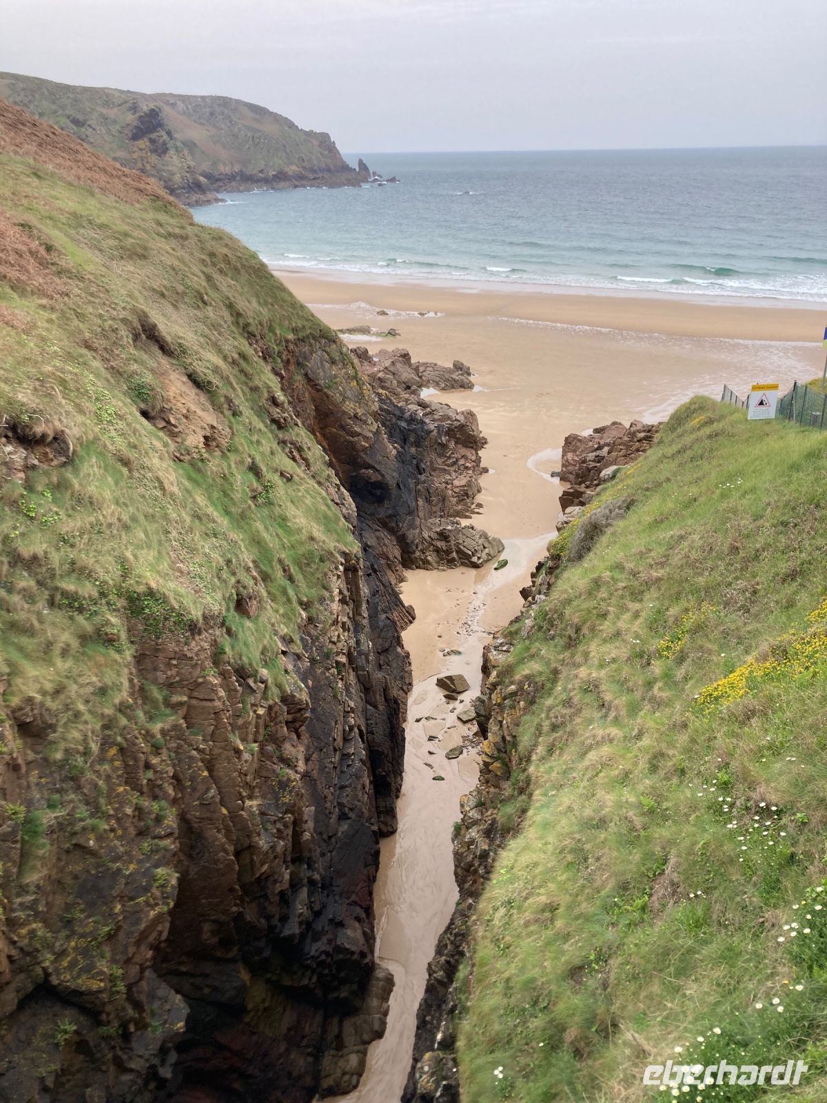 Heidi und Ernst holen uns morgens am Hotel ab. Bis auf drei Gäste nehmen alle an der optionalen Wanderung an der Nordküste teil. Wir fahren vorbei an alten Mühlen durch das St Peter Valley in den Nordwesten der Insel. Bei Grosnez Castle starten wir unsere Wanderung. Zunächst ist es etwas windig und kühl. Durch die Bewegung wird uns aber schnell warm. Es geht auf und ab, immer entlang der Küste. Nach einer halben Stunde erreichen wir die Plèmont Bay. Hier befindet sich ein traumhafter Strand in einer breiten Bucht inmitten der Steilküste. Es gibt auch einen Tearoom, wo man sich ein Getränk oder Eis kaufen kann. Die Küste blüht weiß, gelb, lila und blau: Leimkraut, Ginster, Osterglocken, Hyazinthen und Bluebells. Mittagspause legen wir in Greve de Lecq ein, bevor es wieder steil hinauf geht. Insgesamt wandern wir heute ca. elf Kilometer zusammen mit Ernst. Heidi kommt uns den letzten Kilometer entgegen. Auf dem Rückweg fahren wir durch das hübsche Waterworks-Valley und sehen schöne Gärten.