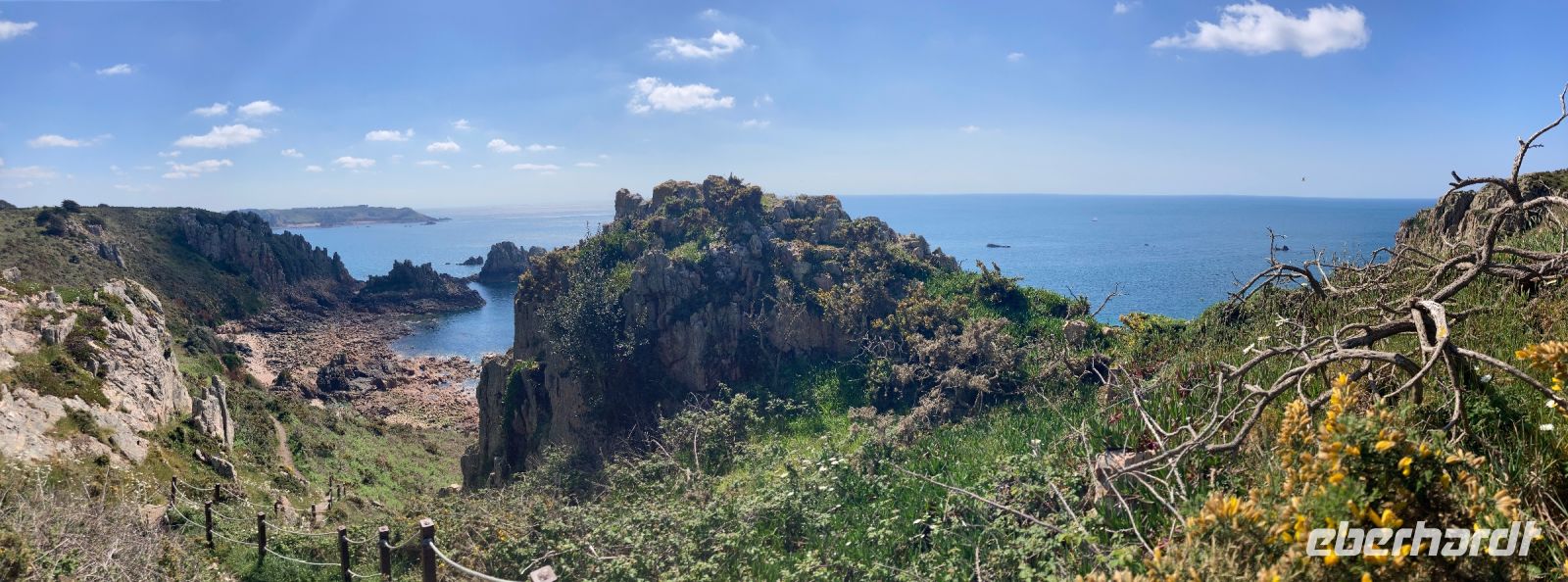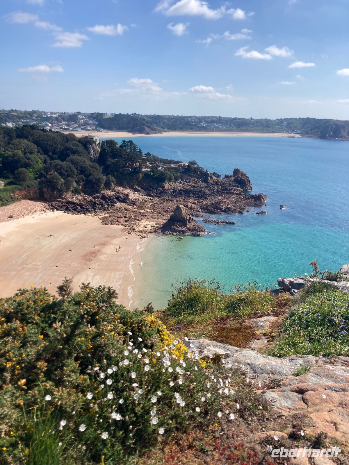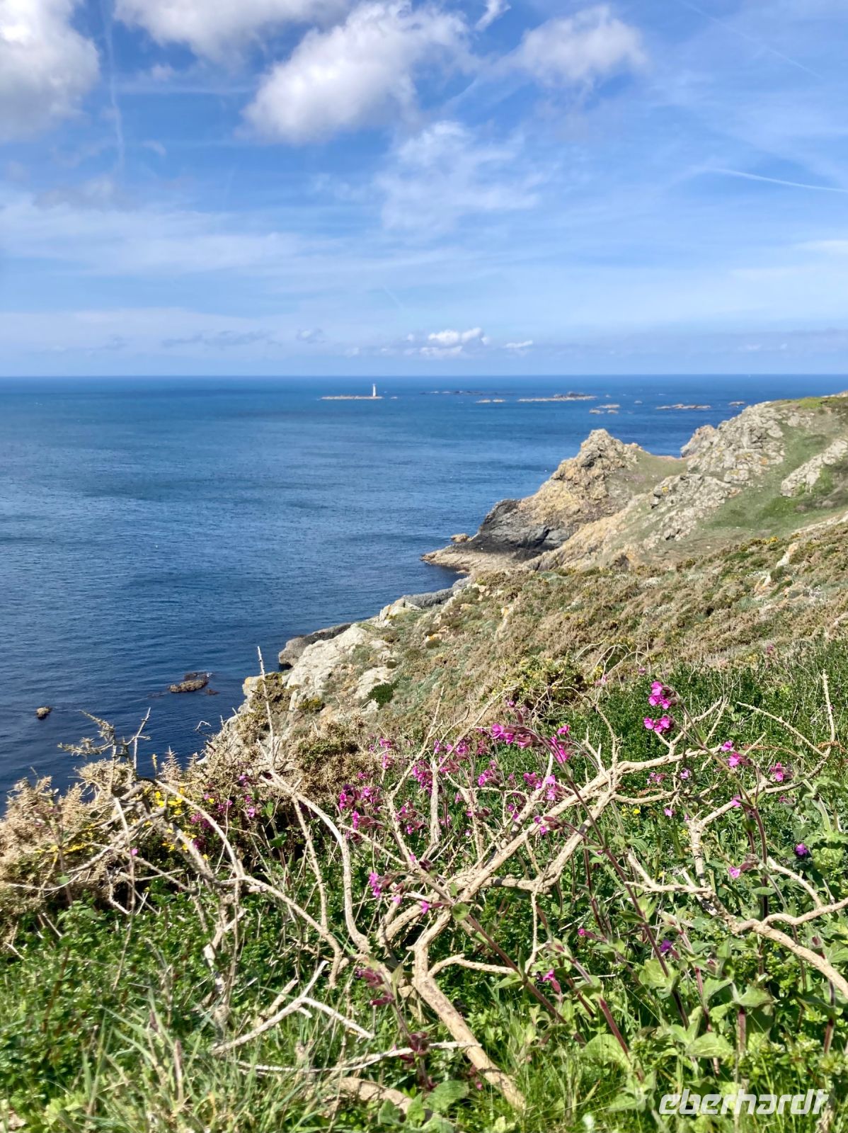 Nach einem guten Frühstück steht heute eine Wanderung an der Südwest-Küste auf dem Plan. Der Wettergott meint es sehr gut mit uns, es sind 15° Celsius und herrlicher Sonnenschein. So starten wir gut gelaunt an der Kirche St Brelade in Richtung Küste. Immer wieder stoppen wir für Fotos. Die Ausblicke in die kleinen Buchten und blühenden Klippen sind fantastisch. Wir sehen viele Margeriten, Fingerhut und Mittagsblumen. Der Weg ist nicht einfach, über Stock und Stein geht es immer entlang der Küste, aber die Ausblicke entlohnen! Zum Mittag erreichen wir La Corbiere Leuchtturm. Wir etwas zu spät. Die Flut kommt hinein und der Weg wird abgeschnitten.