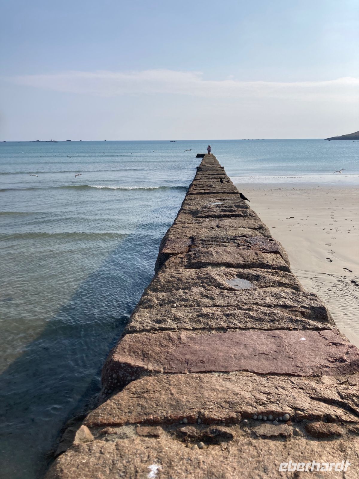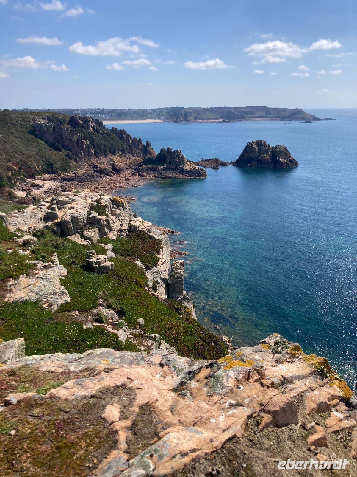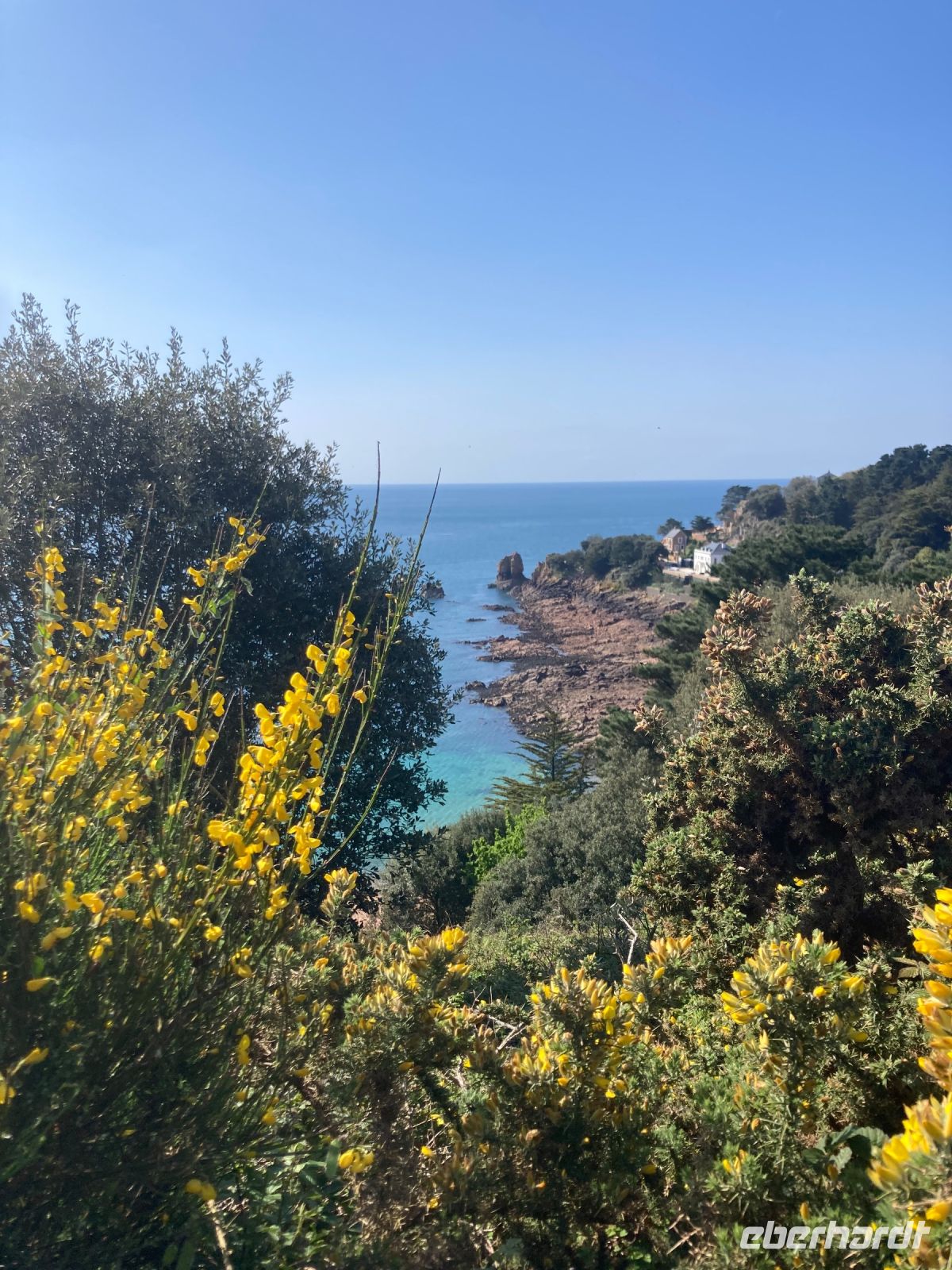 Nach einem guten Frühstück steht heute eine Wanderung an der Südwest-Küste auf dem Plan. Der Wettergott meint es sehr gut mit uns, es sind 15° Celsius und herrlicher Sonnenschein. So starten wir gut gelaunt an der Kirche St Brelade in Richtung Küste. Immer wieder stoppen wir für Fotos. Die Ausblicke in die kleinen Buchten und blühenden Klippen sind fantastisch. Wir sehen viele Margeriten, Fingerhut und Mittagsblumen. Der Weg ist nicht einfach, über Stock und Stein geht es immer entlang der Küste, aber die Ausblicke entlohnen! Zum Mittag erreichen wir La Corbiere Leuchtturm. Wir etwas zu spät. Die Flut kommt hinein und der Weg wird abgeschnitten.