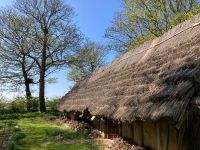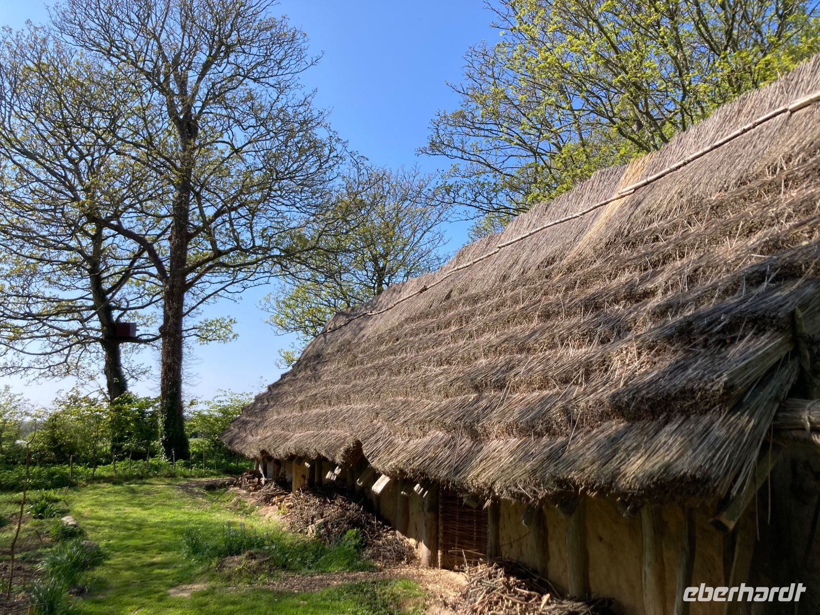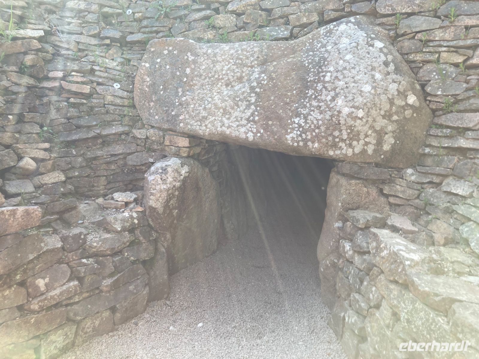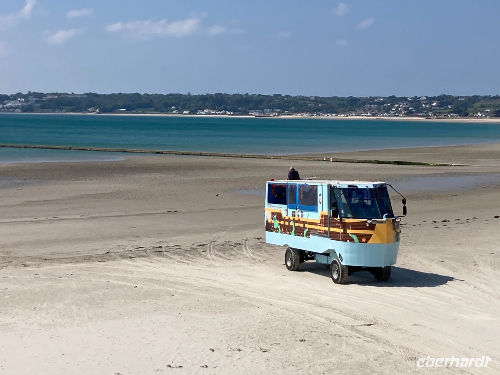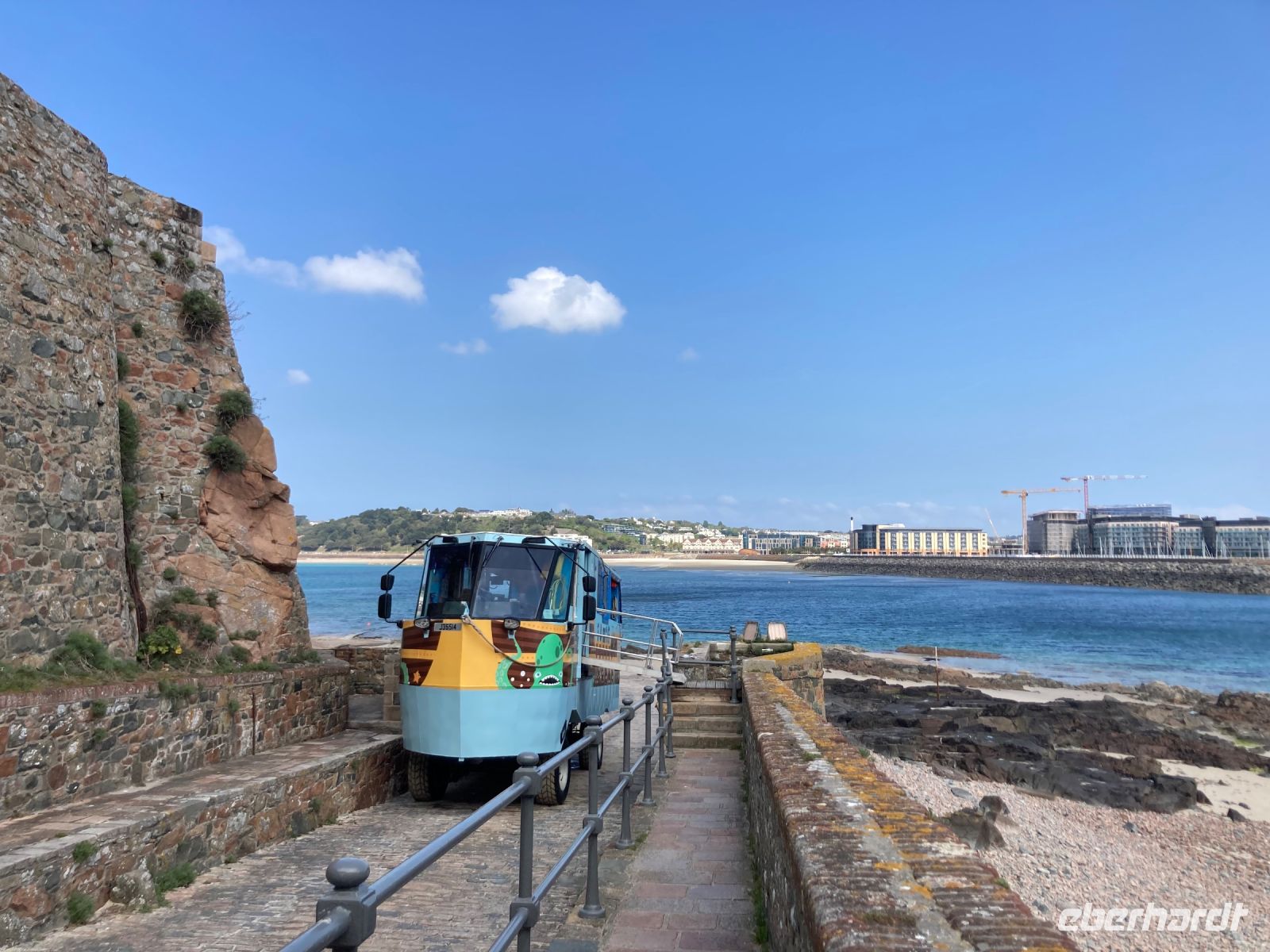 Der heutige Dienstag war als Freizeittag angedacht und so hatten sich einige Gäste schon ein paar eigene Pläne zurechtgelegt. Mit den übrigen Gästen laufen wir zusammen in Richtung Liberation Square, um dort ganz in der Nähe die Fähre zu Elisabeth Castle zu nehmen. Da noch Ebbe war, ist die Fähre auf Rädern zum Castle gefahren. Ein unterhaltsames Erlebnis. Die Burganlage ist recht groß, sodass man einen ausgedehnten Spaziergang an der Burgmauer entlang unternehmen kann. Wir sehen unter anderem ein altes Krankenhaus, die Wehr-Anlagen, Schießpulver-Kammern und die Kanonen. Wir laufen entlang des Wellenbrechers bis zum Hermitage Felsen. Hier soll St. Helier im 6. Jahrhundert gelebt haben. Gegen Mittag erhalten wir eine unterhaltsame Vorführung - Parade - eines Offiziers. Er erklärt uns die Kriegsführung der Engländer und das Laden der Munition in die Waffen. Anschließend fahren wir mit dem Amphibienfahrzeug durch die Bucht nach St. Helier zurück. Die Flut ist nun da, sodass wir durch das Wasser fahren. Wir haben noch etwas Zeit für eine kleine Mittagspause, bevor ein kleiner Teil der Reisegruppe mit dem öffentlichen Bus zum Ganggrab Hougue Bie fährt. Wir erhalten einen kleinen Einführungsfilm auf Deutsch, bevor wir den Grabhügel mit dem Ganggrab und der kleinen Kapelle darüber besichtigen. Es ist eine bedeutende Megalithanlage und wird für 3.500 v.Chr. datiert. Der Eingang zur Grabhalle ist sehr niedrig und nichts für Menschen mit Platzangst. Einige von uns wagen sich hinein und bestaunen die Grabkammern. Der Grabhügel, der die Anlage umgibt, ist 14 Meter hoch.