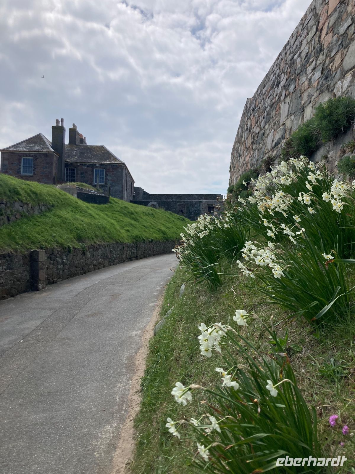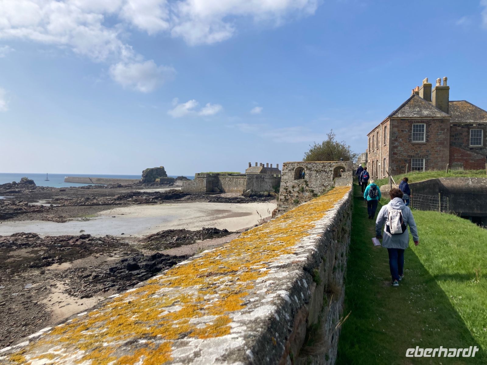 Heute starten wir gut gelaunt zu einer Inselrundfahrt Jersey. Das Wetter war noch etwas trüb, aber trotzdem angenehm. Zunächst fahren wir circa 20 Minuten entlang der Südküste in Richtung Osten und halten bei La Roque. Gemeinsam mit Heidi spazieren wir auf der Kaimauer entlang und bestaunen die vielen Felsen, die hier in der Bucht bei Ebbe zu sehen sind. Die Natur ist schon richtig weit und alles blüht üppig grün. Auch bei Gorey Castle, in der gleichnamigen Bucht Gorey, spazieren wir an der Promenade entlang und sehen das mächtige Castle, welches über der Bucht thront. Einen weiteren Spaziergang unternehmen wir bei St Catherine‘s Bay, bevor wir durch das Inselinnere vorbei an hübschen Cottages und Herrenhäusern zu unserer Mittagspause im Pub Les Fontaines Tavern fahren. Nun sind wir schon an der Nordküste der Insel und können hier Fish and Chips, Shrimps oder das lokale Bier im Pub probieren. Als nächster Höhepunkt steht Grosnez Castle, eine Ruine ganz im Nord-Westen, auf dem Programm. Hier sehen wir die fantastischen Klippen an der Steilküste und das schäumende Meer unter uns!