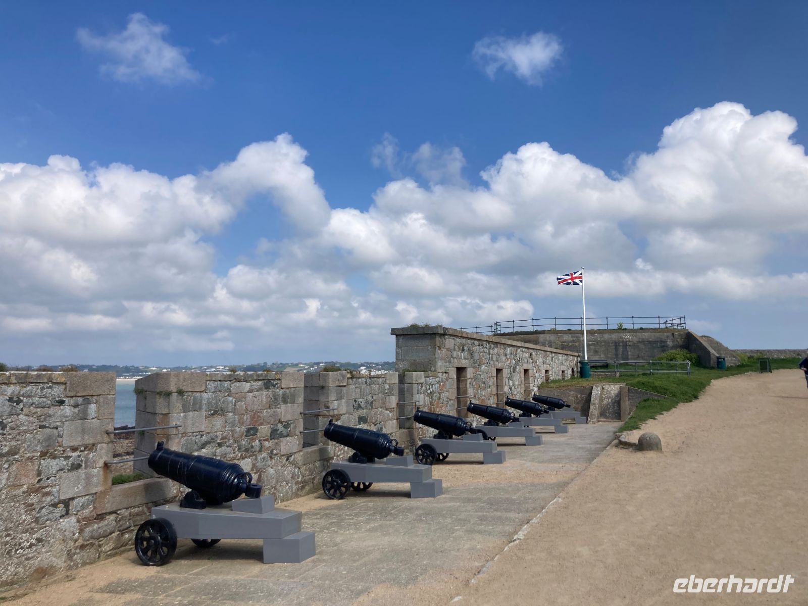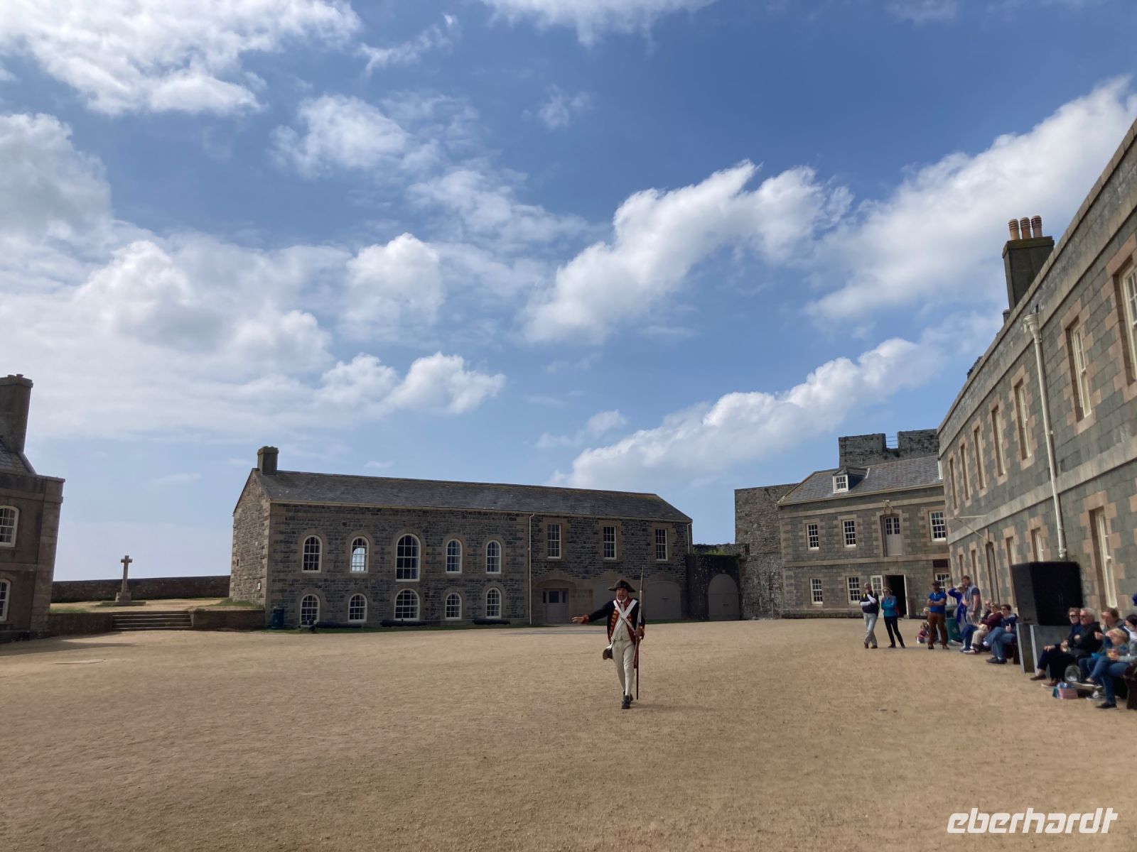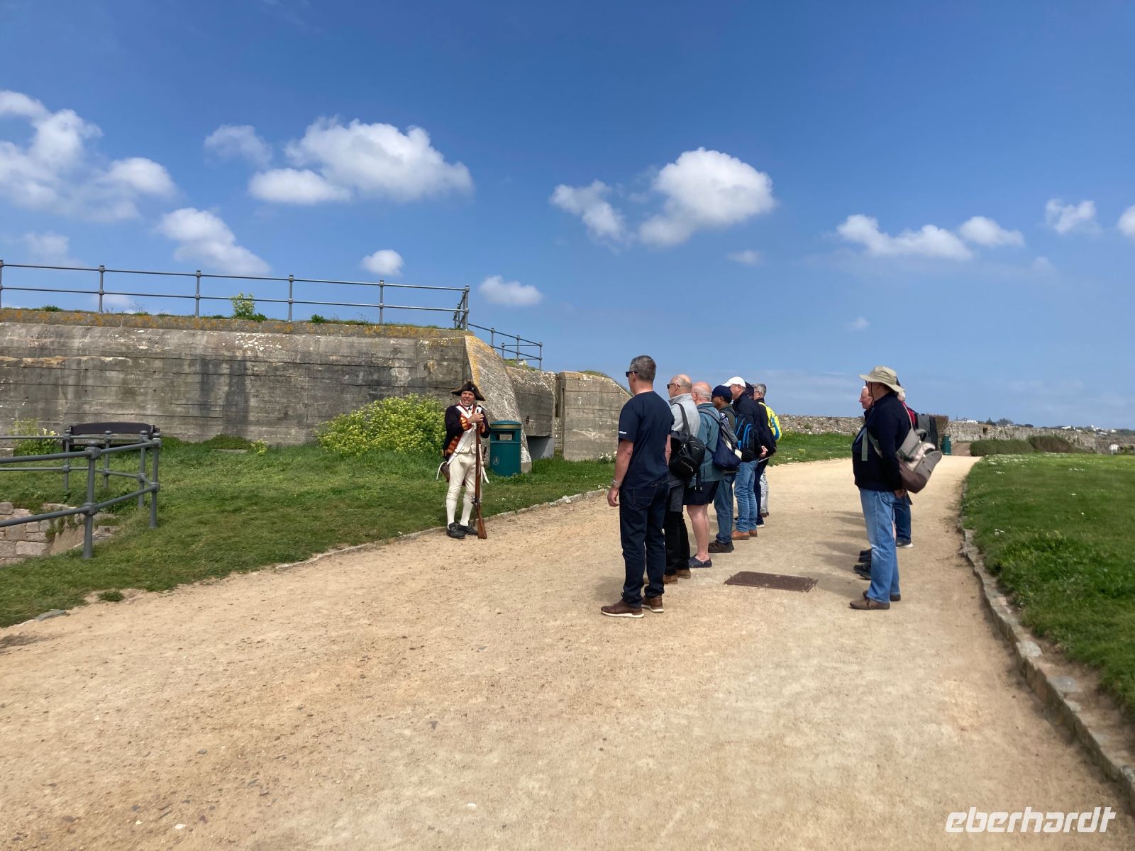 Tag 4 gab uns Gelegenheit zum Trip in die Vergangenheit. Amphibientechnisch transportiert, wurden wir zu Elisabeth Castle geführt. Hier wurde alles inspiziert und schneidig Kriegskunst vorgeführt. Es machte zweimal kräftig „Bumm“, aber zum Glück fiel keiner um! Bei anhaltendem Sonnenwetter war dann zum Stadtbummel noch Zeit, man orientierte sich schon ‚better‘ und zum Geldausgeben fand jeder Gelegenheit.