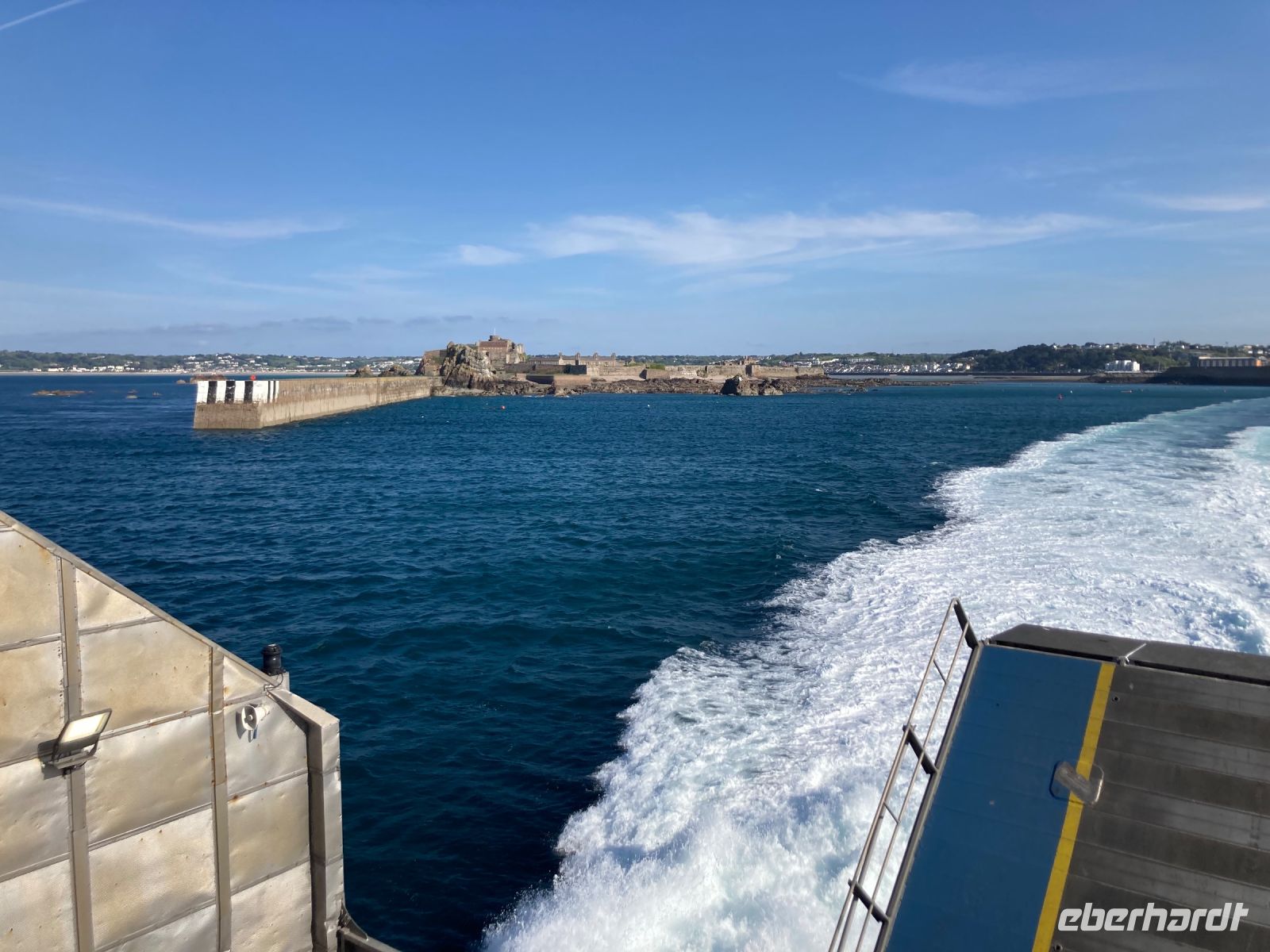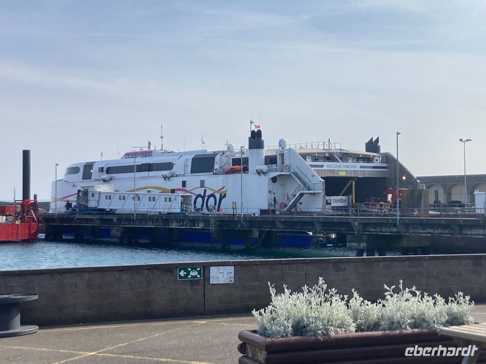 Die Nacht ist heute zeitiger vorbei, denn 7:15 Uhr treffen wir uns beim Frühstück. Gegen 8 Uhr holen uns Ernst & Heidi mit dem Bus ab, um uns zur Fähre zu bringen. Nach etwas Wartezeit gehen wir an Bord der Condor-Fähre nach Guernsey. Auf der Fähre gibt es alle modernen Annehmlichkeiten und man kann sich mit Kreditkarte einen Kaffee oder Snacks kaufen. Die Überfahrt ist nur leicht schaukelig und allen geht es gut.