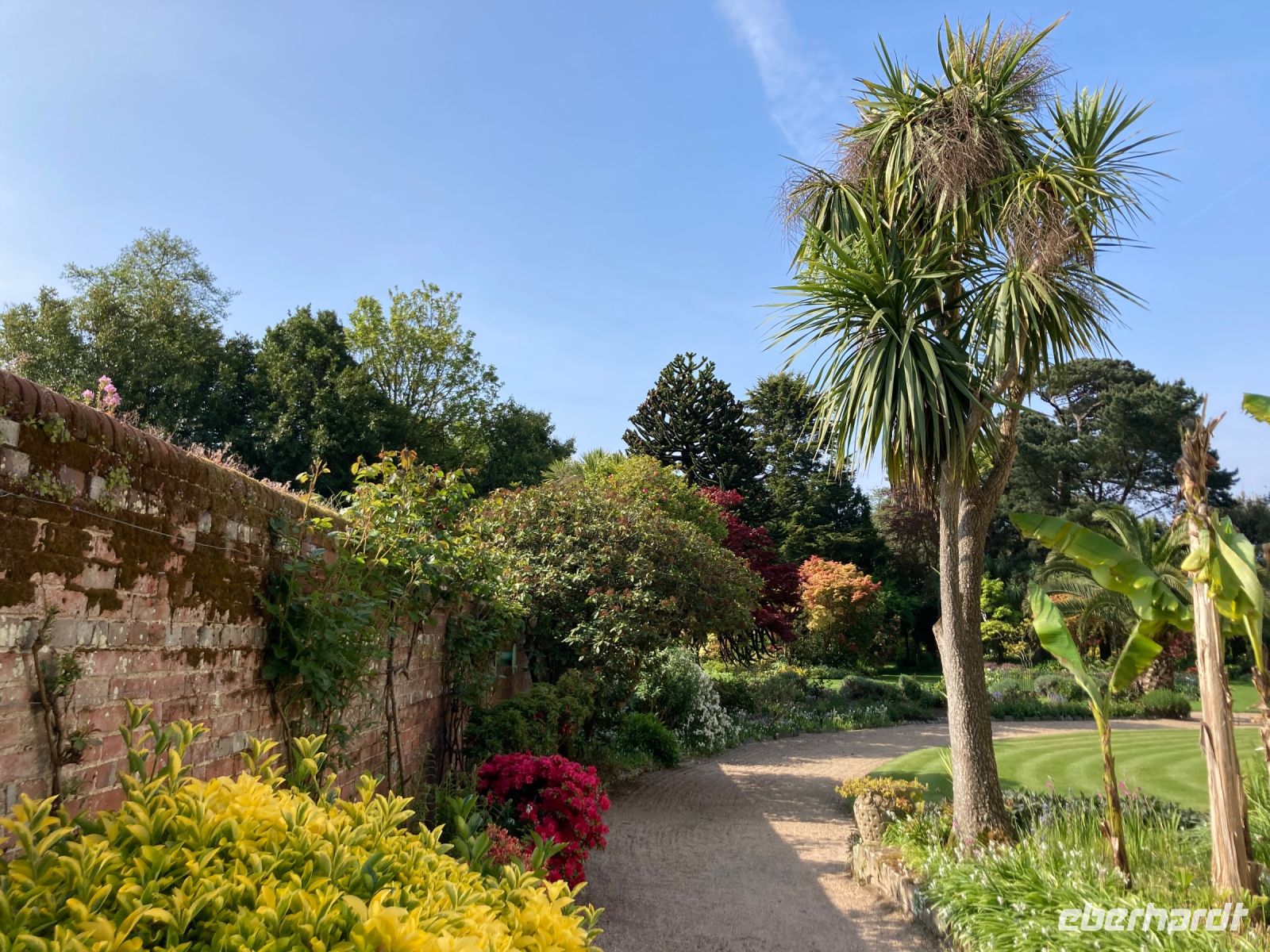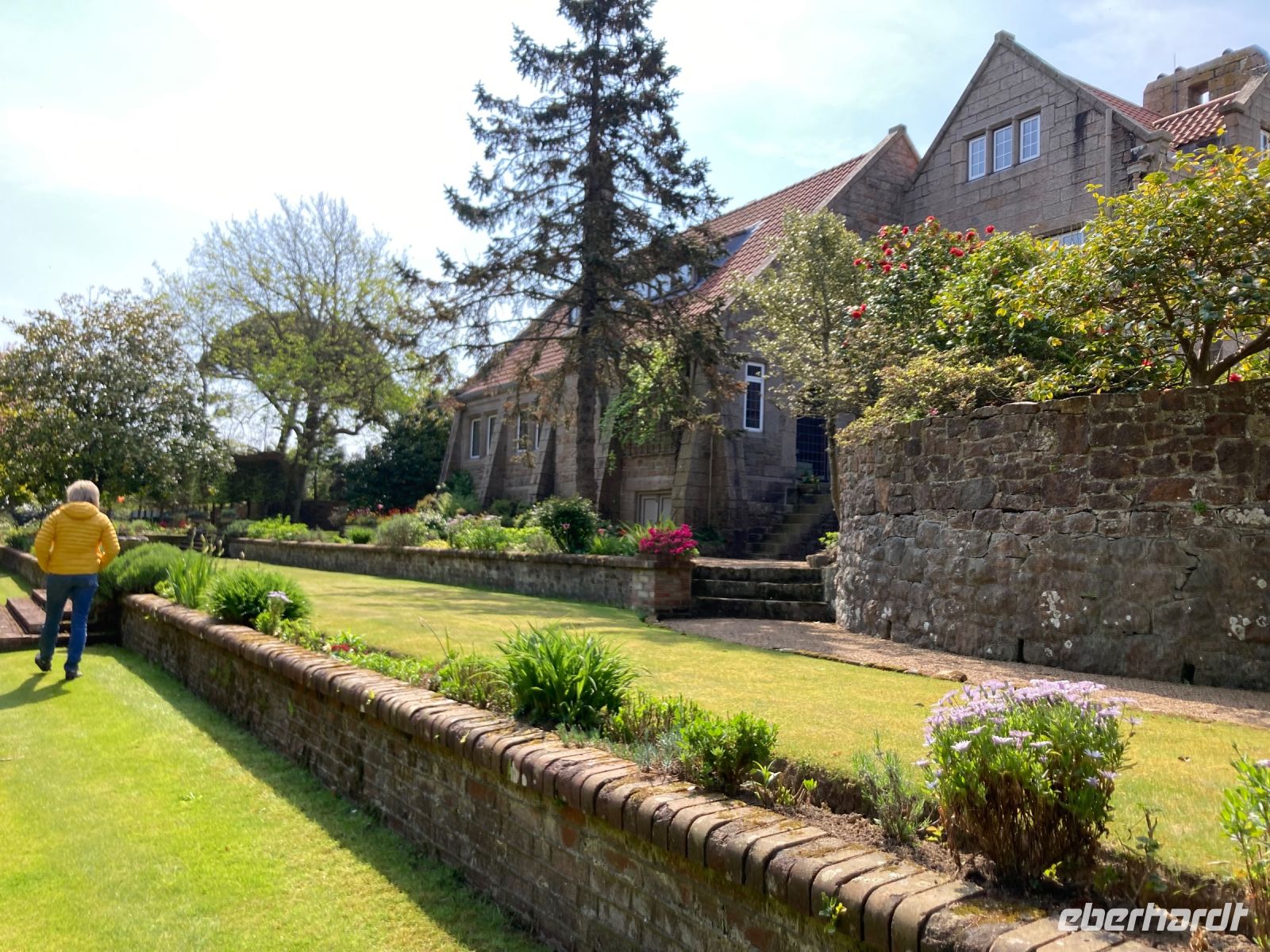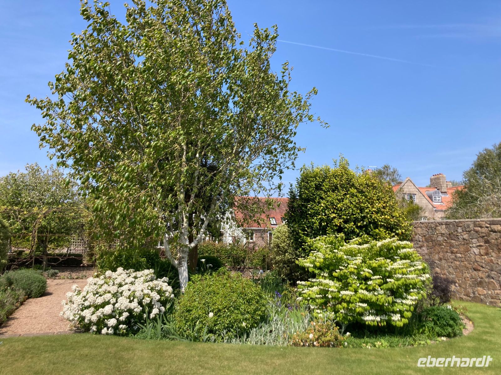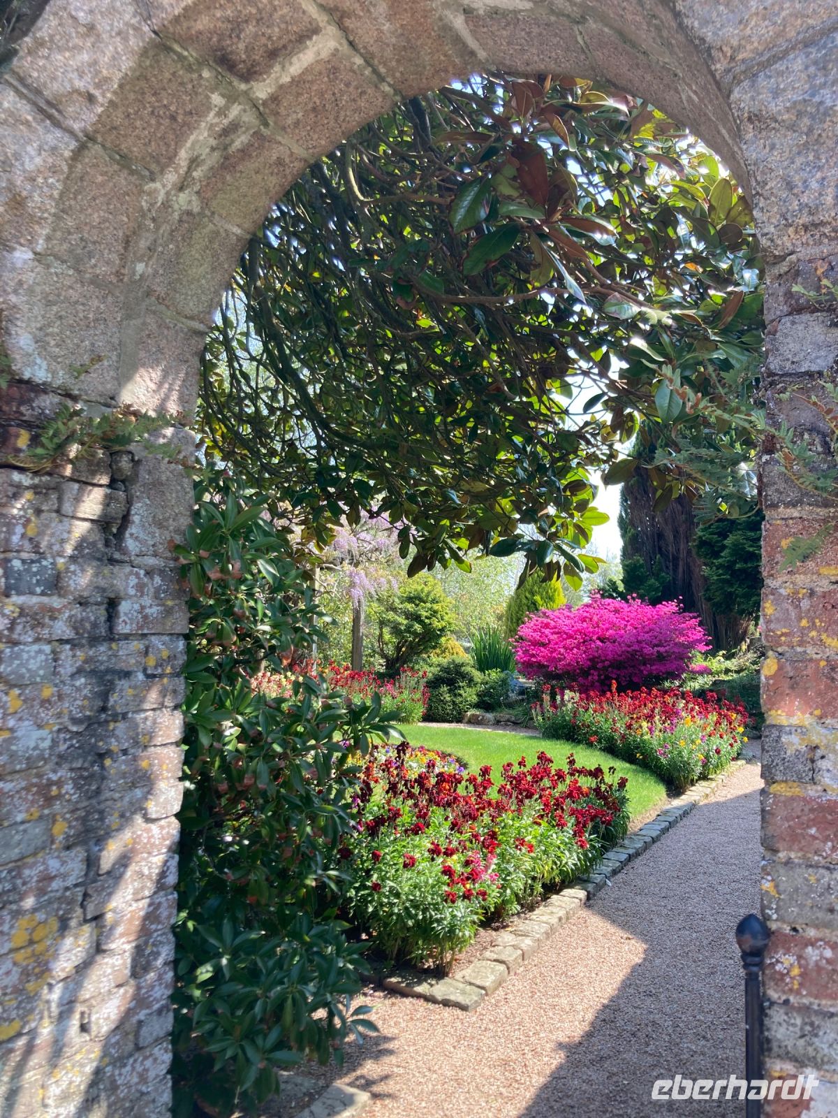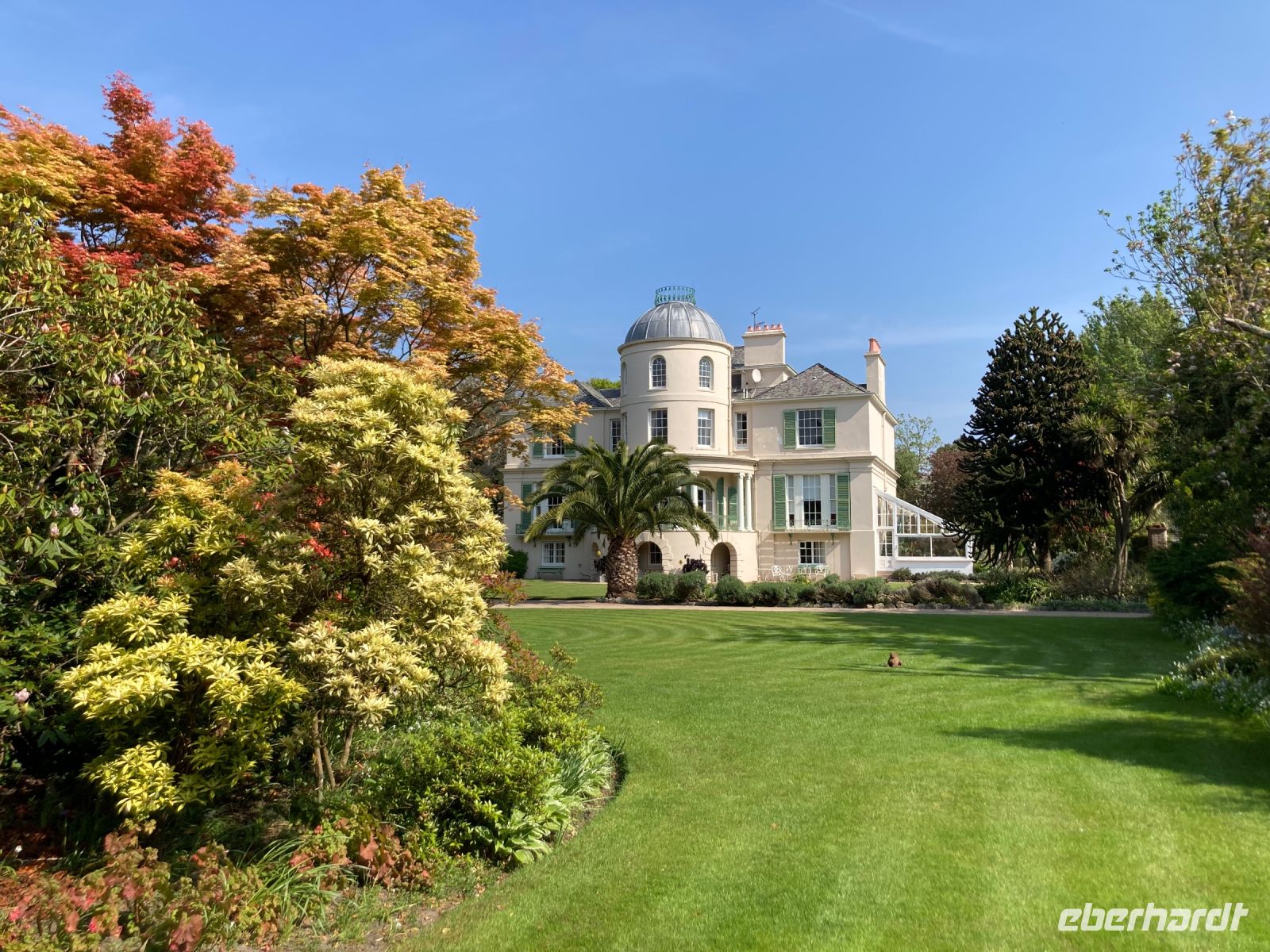 Ein letzter schöner Reisetag steht heute auf dem Programm. Heidi und Ernst holen uns bei Sonnenschein am Hotel ab. Zunächst halten wir für einen Fotostopp an der Bucht mit Blick auf Elizabeth Castle bei Flut. Anschließend dürfen wir das Anwesen von Mr. Miles besuchen. Dies ist ein sehr geschichtsträchtiges Haus mit prächtigem Garten. Er führt uns höchstpersönlich über das Gelände. Die Familie ist Anfang des letzten Jahrhunderts von Irland nach Jersey ausgewandert. Zunächst bestaunen wir die Pflanzen und Gemüse im Mauergarten - walled garden. Neben brasilianischem Rhabarber wachsen hier Artischocken, Feigen, Kiwis und vieles mehr. Anschließend sehen wir den weitläufigen Garten, wo alles wunderschön arrangiert ist: Rhododendron, Pfingstrosen, Geranien, Kamelien u. v. m. Auch preisgekrönte Azaleen stehen hier.