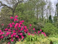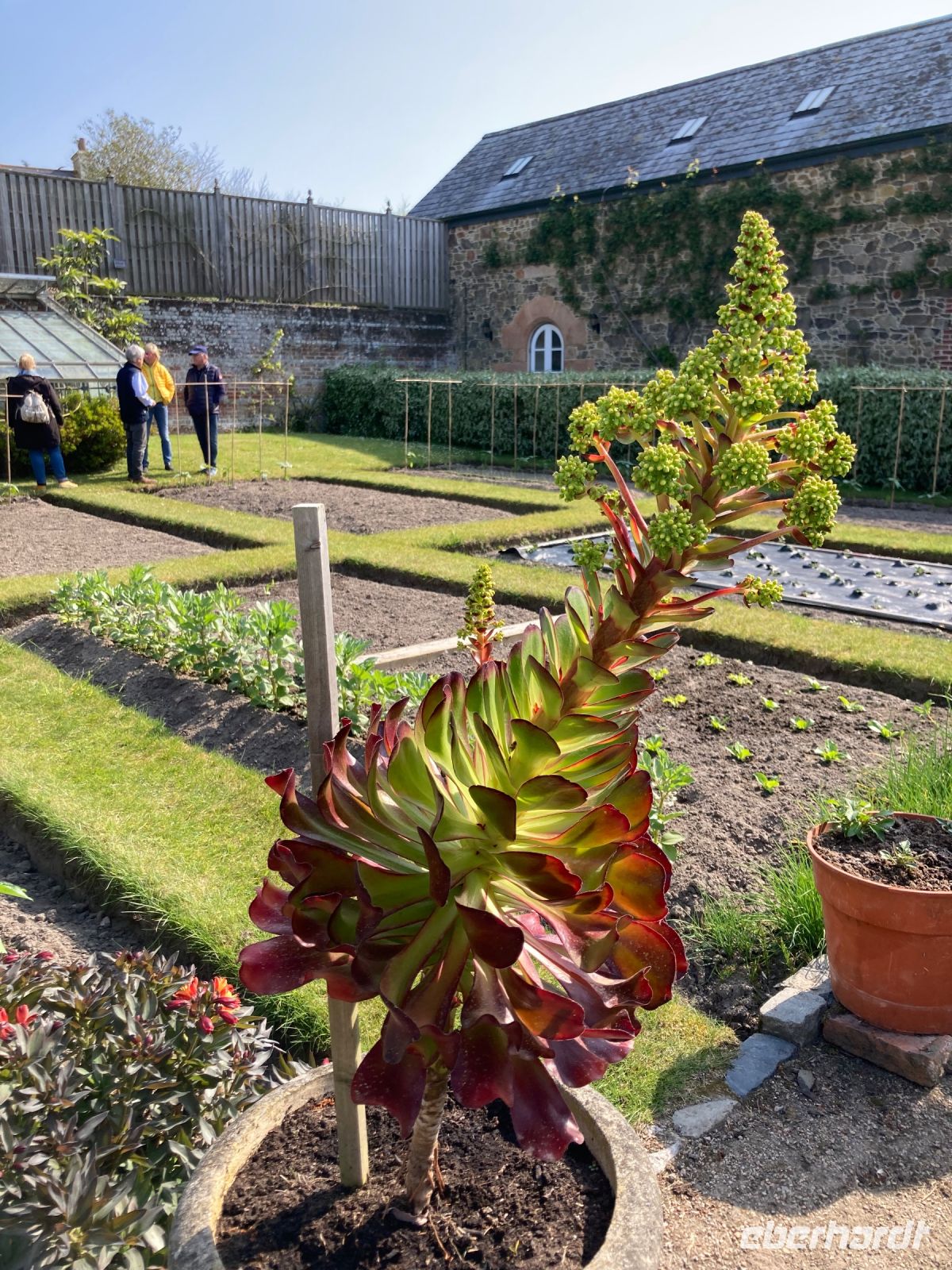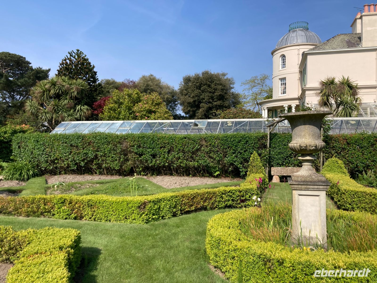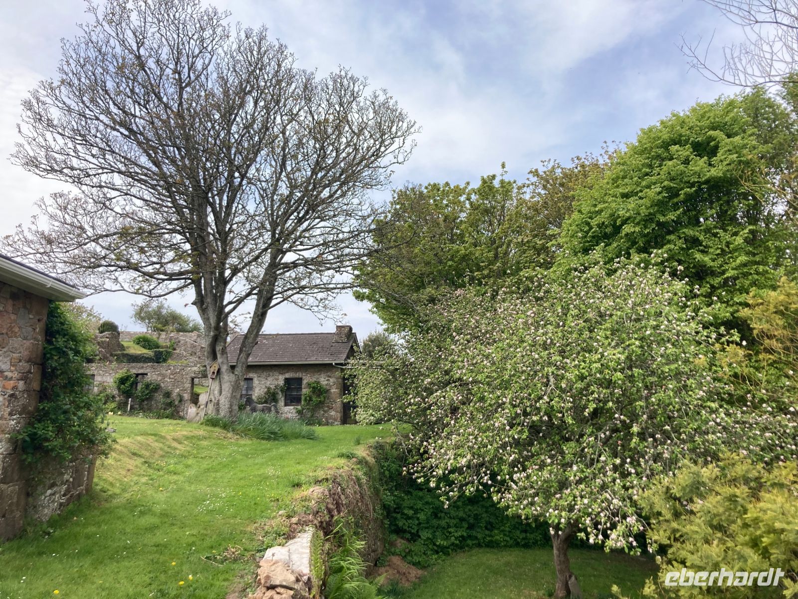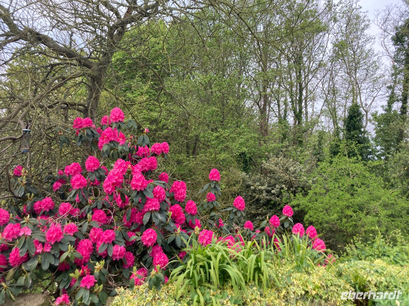 Ein letzter schöner Reisetag steht heute auf dem Programm. Heidi und Ernst holen uns bei Sonnenschein am Hotel ab. Zunächst halten wir für einen Fotostopp an der Bucht mit Blick auf Elizabeth Castle bei Flut. Anschließend dürfen wir das Anwesen von Mr. Miles besuchen. Dies ist ein sehr geschichtsträchtiges Haus mit prächtigem Garten. Er führt uns höchstpersönlich über das Gelände. Die Familie ist Anfang des letzten Jahrhunderts von Irland nach Jersey ausgewandert. Zunächst bestaunen wir die Pflanzen und Gemüse im Mauergarten - walled garden. Neben brasilianischem Rhabarber wachsen hier Artischocken, Feigen, Kiwis und vieles mehr. Anschließend sehen wir den weitläufigen Garten, wo alles wunderschön arrangiert ist: Rhododendron, Pfingstrosen, Geranien, Kamelien u. v. m. Auch preisgekrönte Azaleen stehen hier.
