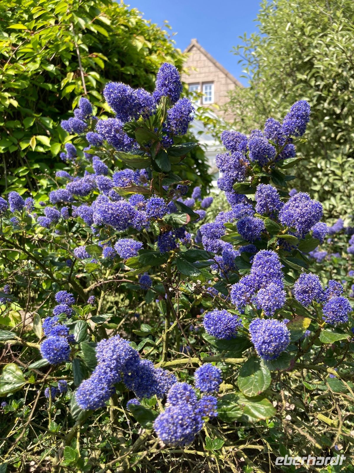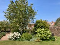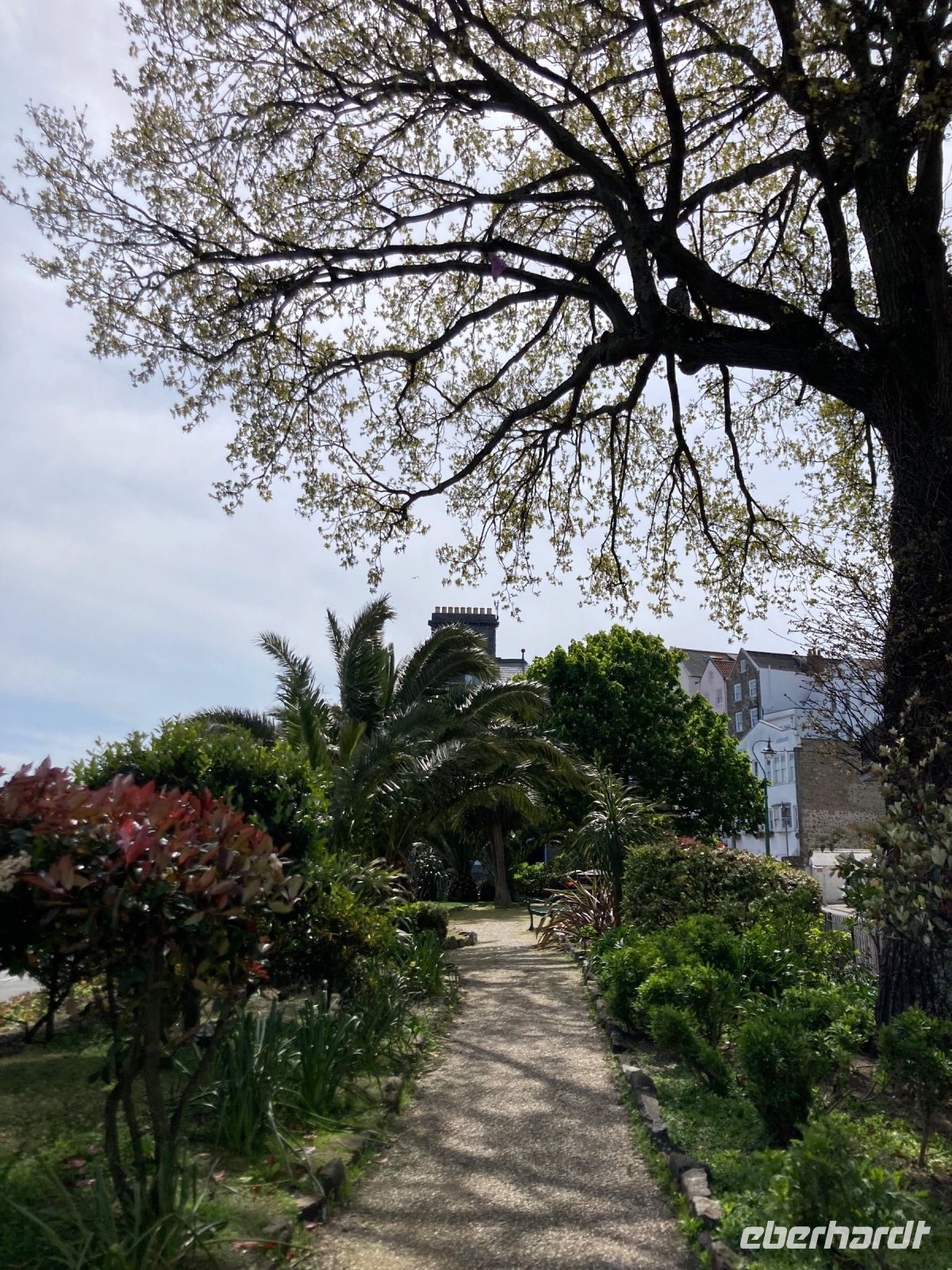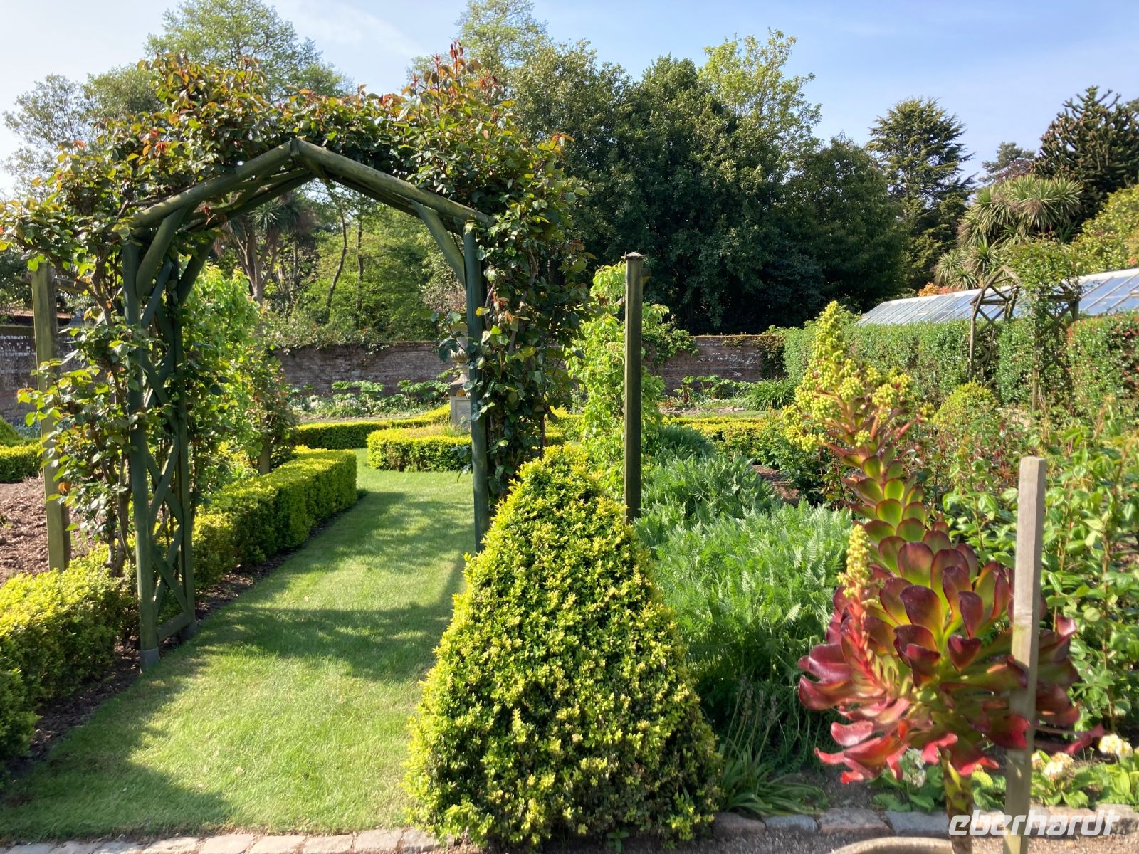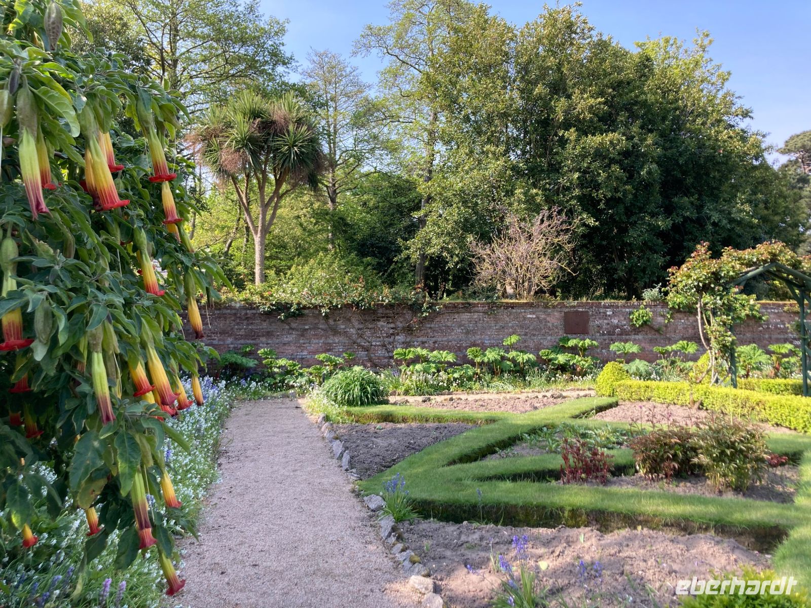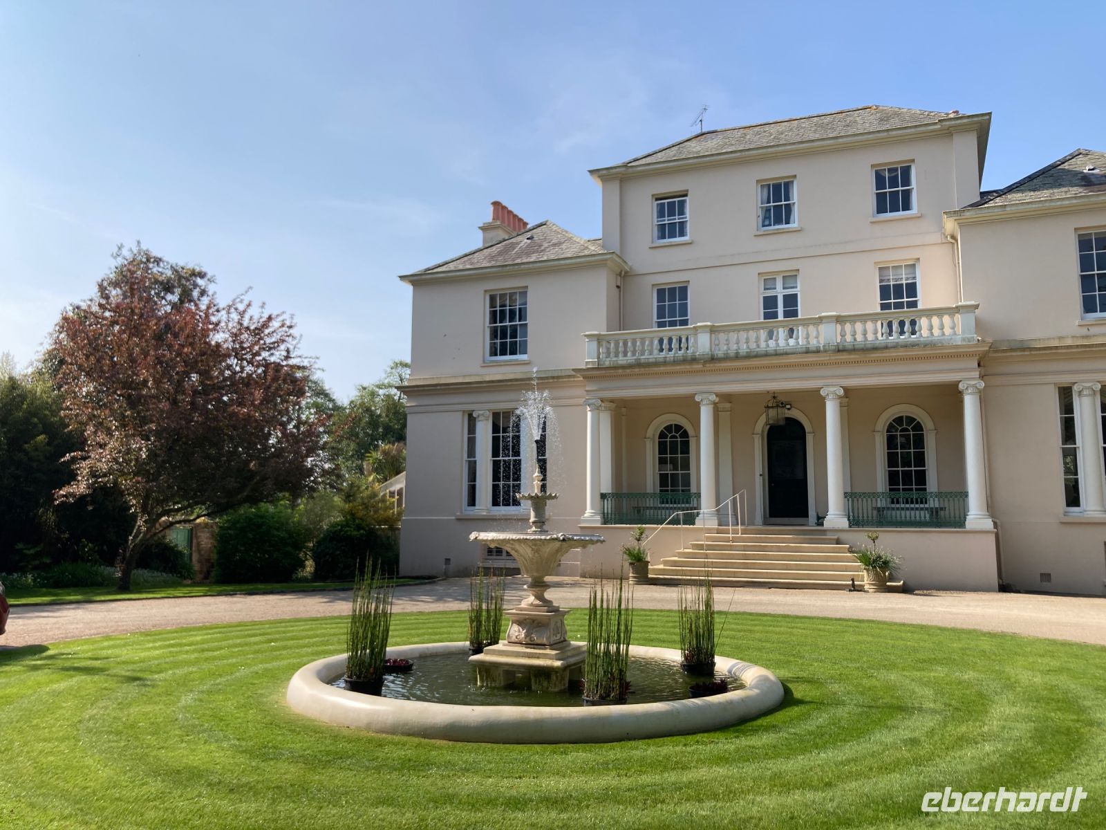 Ein letzter schöner Reisetag steht heute auf dem Programm. Heidi und Ernst holen uns bei Sonnenschein am Hotel ab. Zunächst halten wir für einen Fotostopp an der Bucht mit Blick auf Elizabeth Castle bei Flut. Anschließend dürfen wir das Anwesen von Mr. Miles besuchen. Dies ist ein sehr geschichtsträchtiges Haus mit prächtigem Garten. Er führt uns höchstpersönlich über das Gelände. Die Familie ist Anfang des letzten Jahrhunderts von Irland nach Jersey ausgewandert. Zunächst bestaunen wir die Pflanzen und Gemüse im Mauergarten - walled garden. Neben brasilianischem Rhabarber wachsen hier Artischocken, Feigen, Kiwis und vieles mehr. Anschließend sehen wir den weitläufigen Garten, wo alles wunderschön arrangiert ist: Rhododendron, Pfingstrosen, Geranien, Kamelien u. v. m. Auch preisgekrönte Azaleen stehen hier.