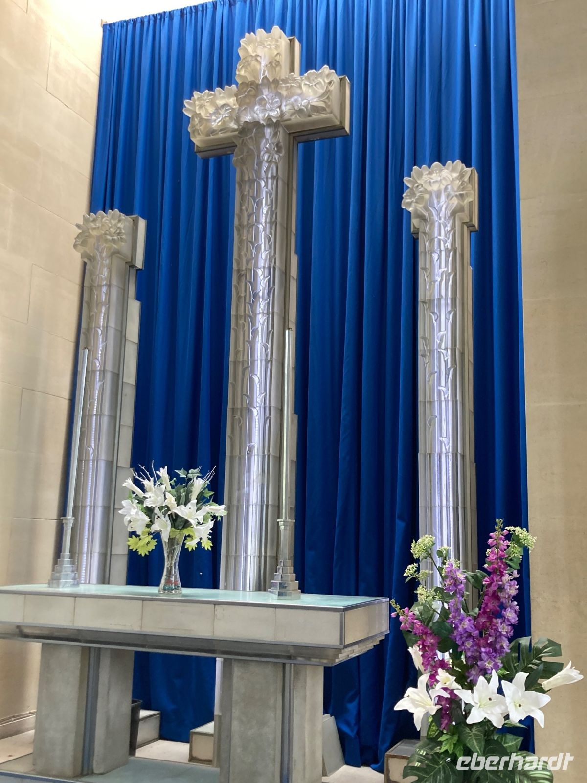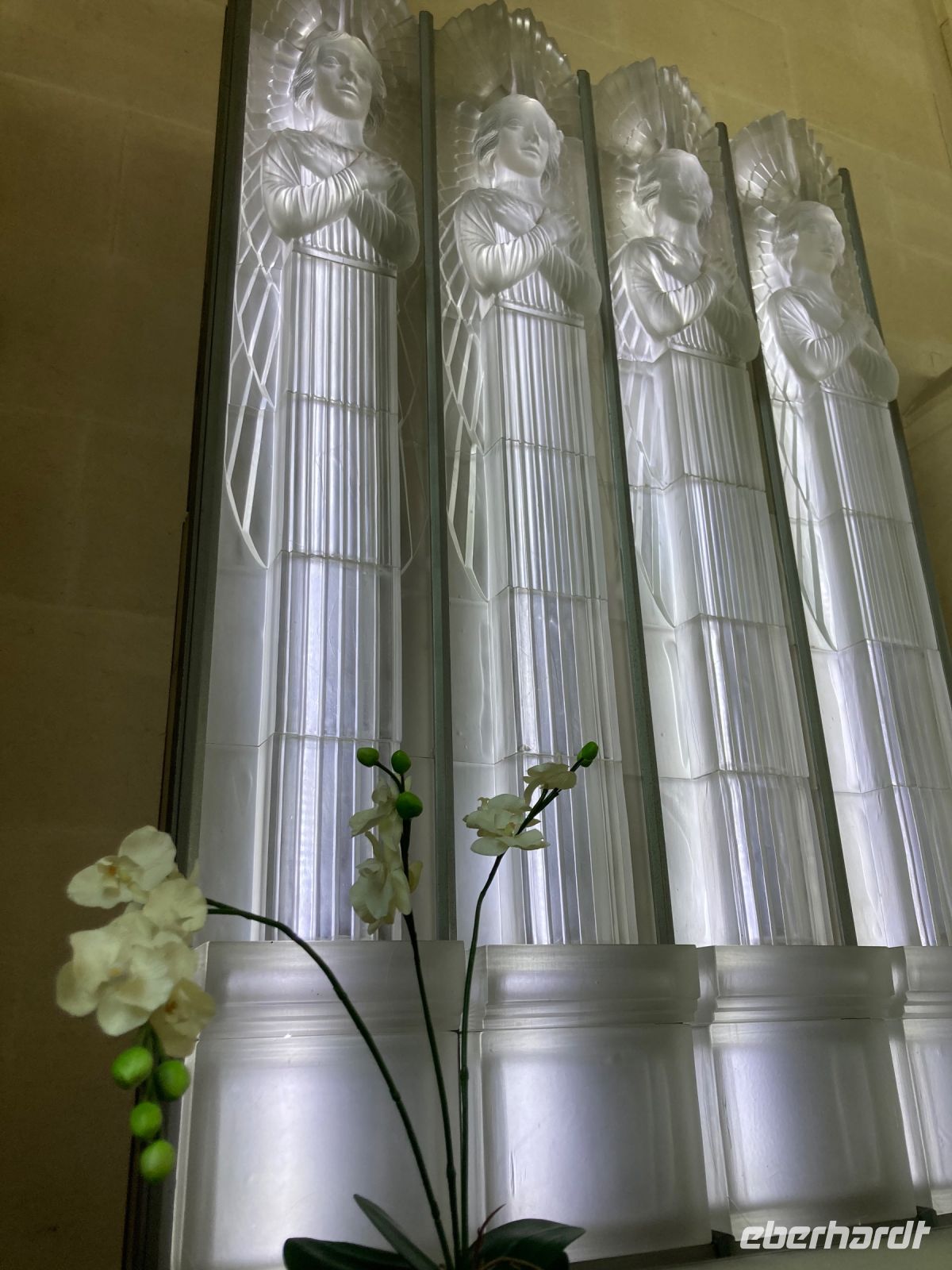 Als kleine Überraschung besuchen wir die Glaskirche in St. Helier. Diese ist an Türen, Fenstern und auch am Altar mit Werken von René Lalique ausgestattet. Die Kirche ist ansonsten schlicht gehalten, aber durch die besonderen Glasskulpturen und Reliefs sehr eindrucksvoll.