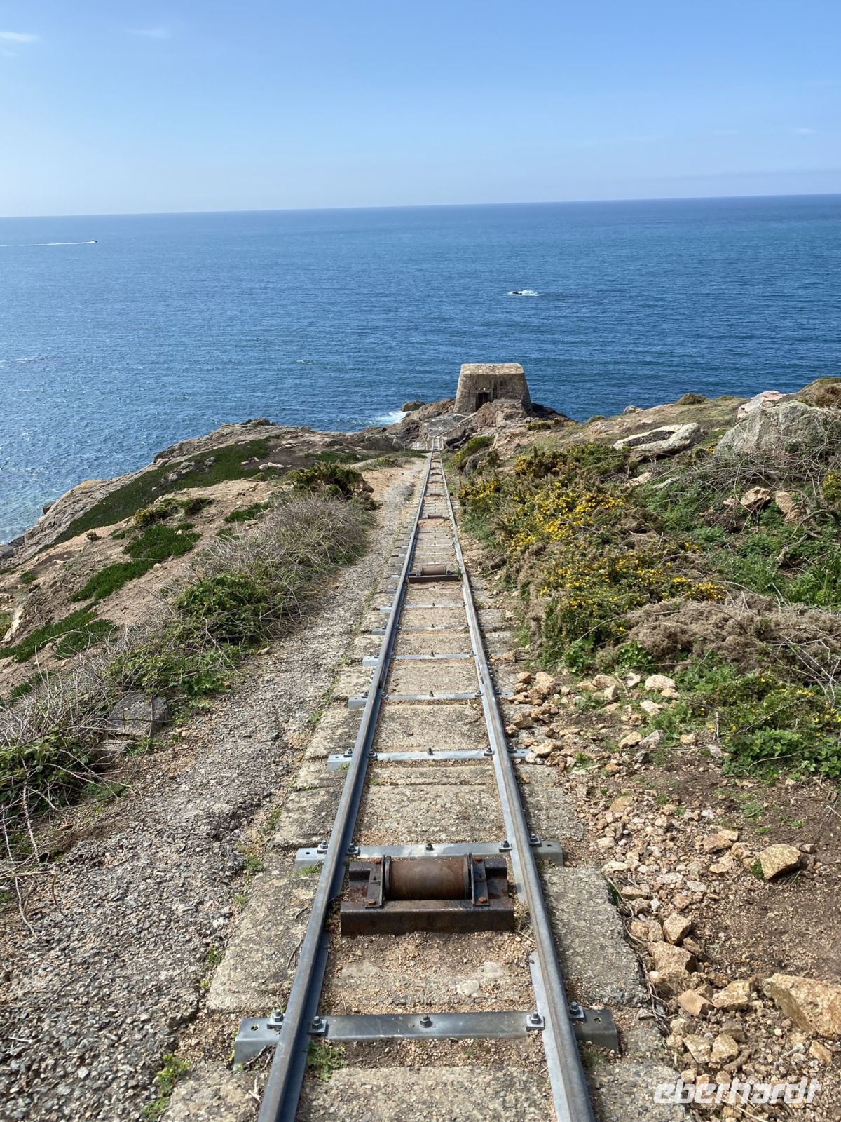 Ziel der ersten Etappe war der Leuchtturm in Corbiere, wo wir für eine Mittagspause halt machten. Wir hatten das Glück, dass gerade Ebbe herrschte und wir somit die Möglichkeit hatten zu, Leuchtturm zu laufen. Nach einer kleinen Stärkung führte uns unser Weg weiter Richtung unserem Ausgangspunkt St. Aubin entlang der Entsalzungsanlage und den ehemaligen Eisenbahnschienen.