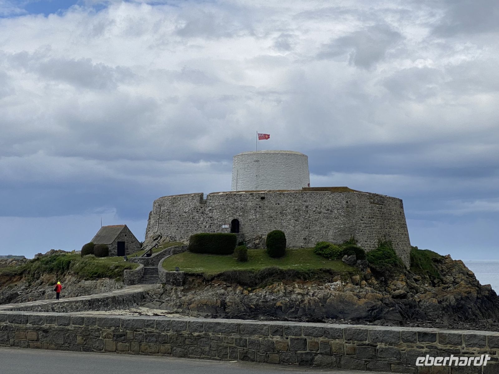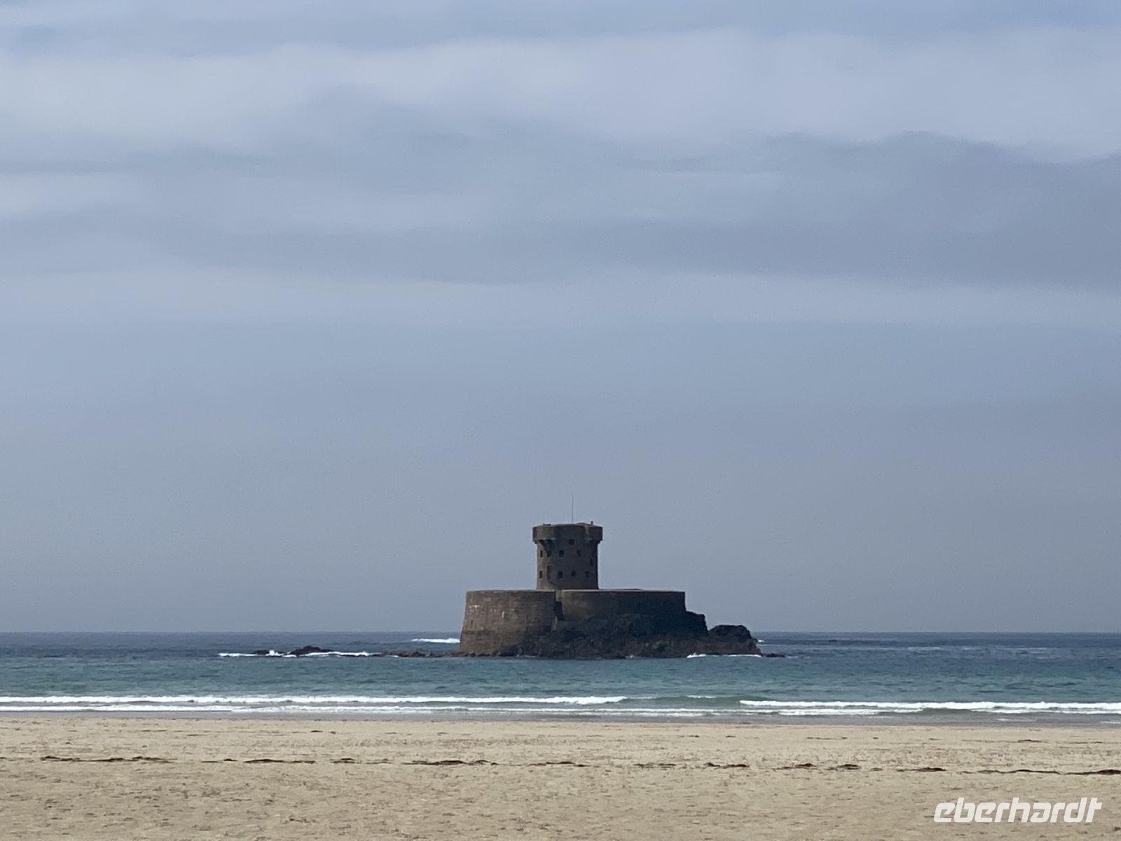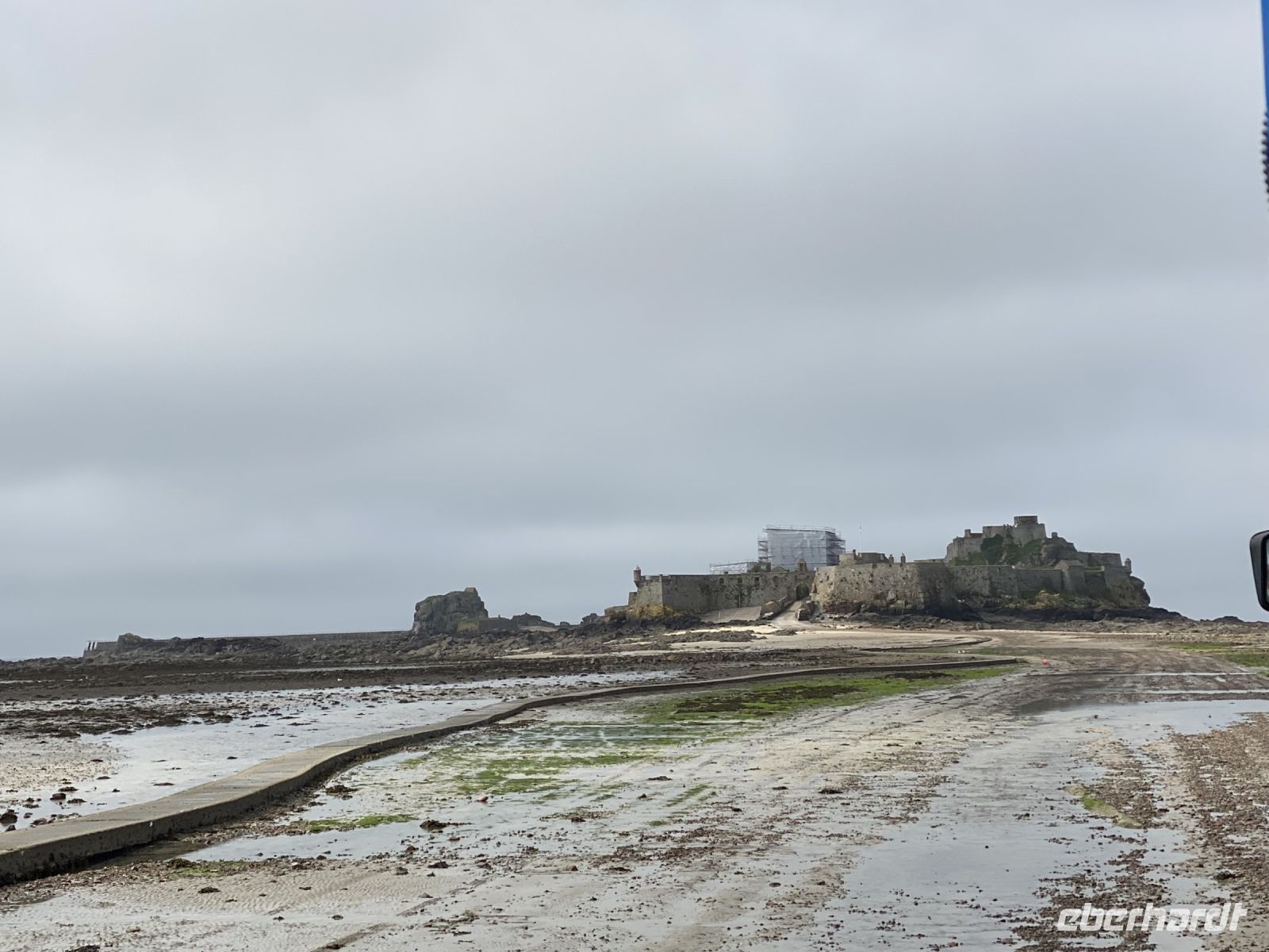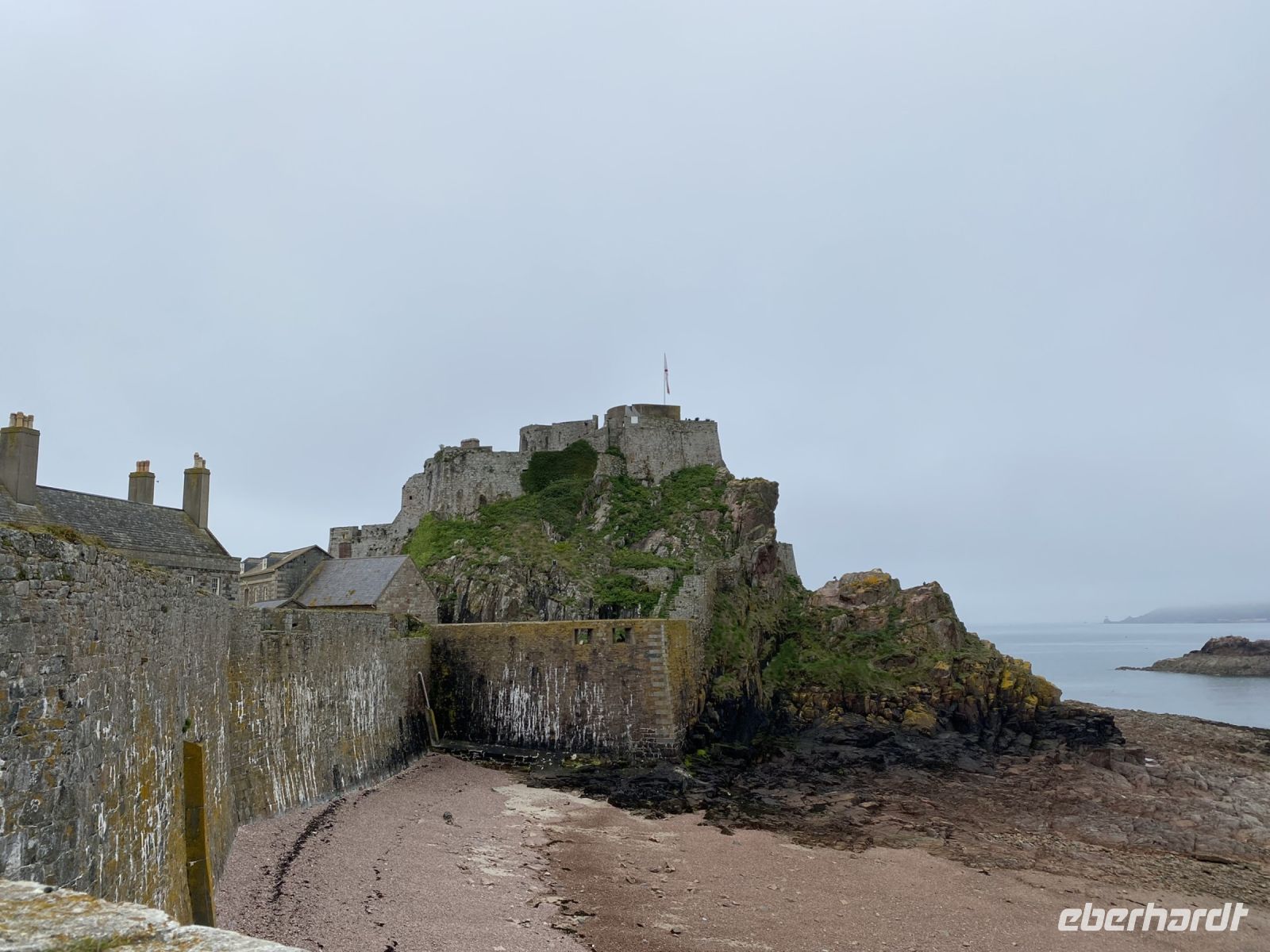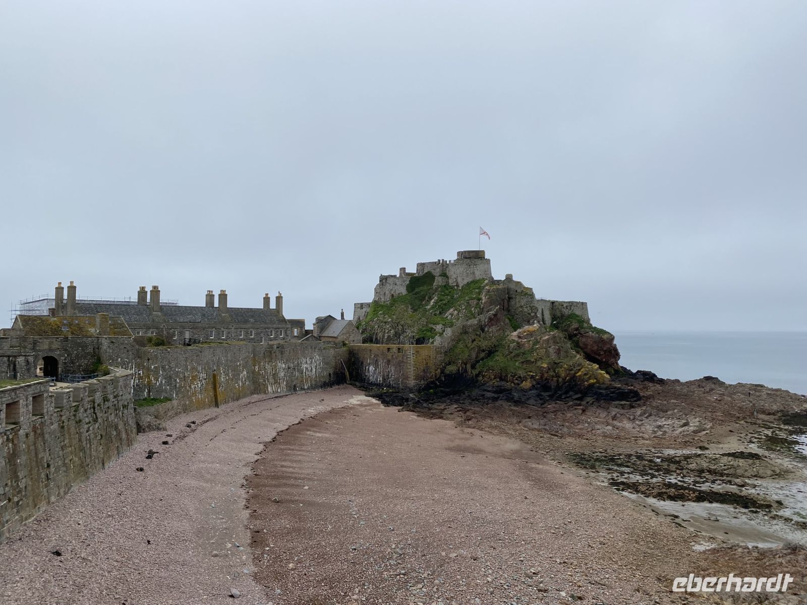 Elizabeth Castle liegt auf einer vorgelagerten Insel Saint Helier in der St. Aubins Bay und wird bei Flut komplett mit Wasser umspült.