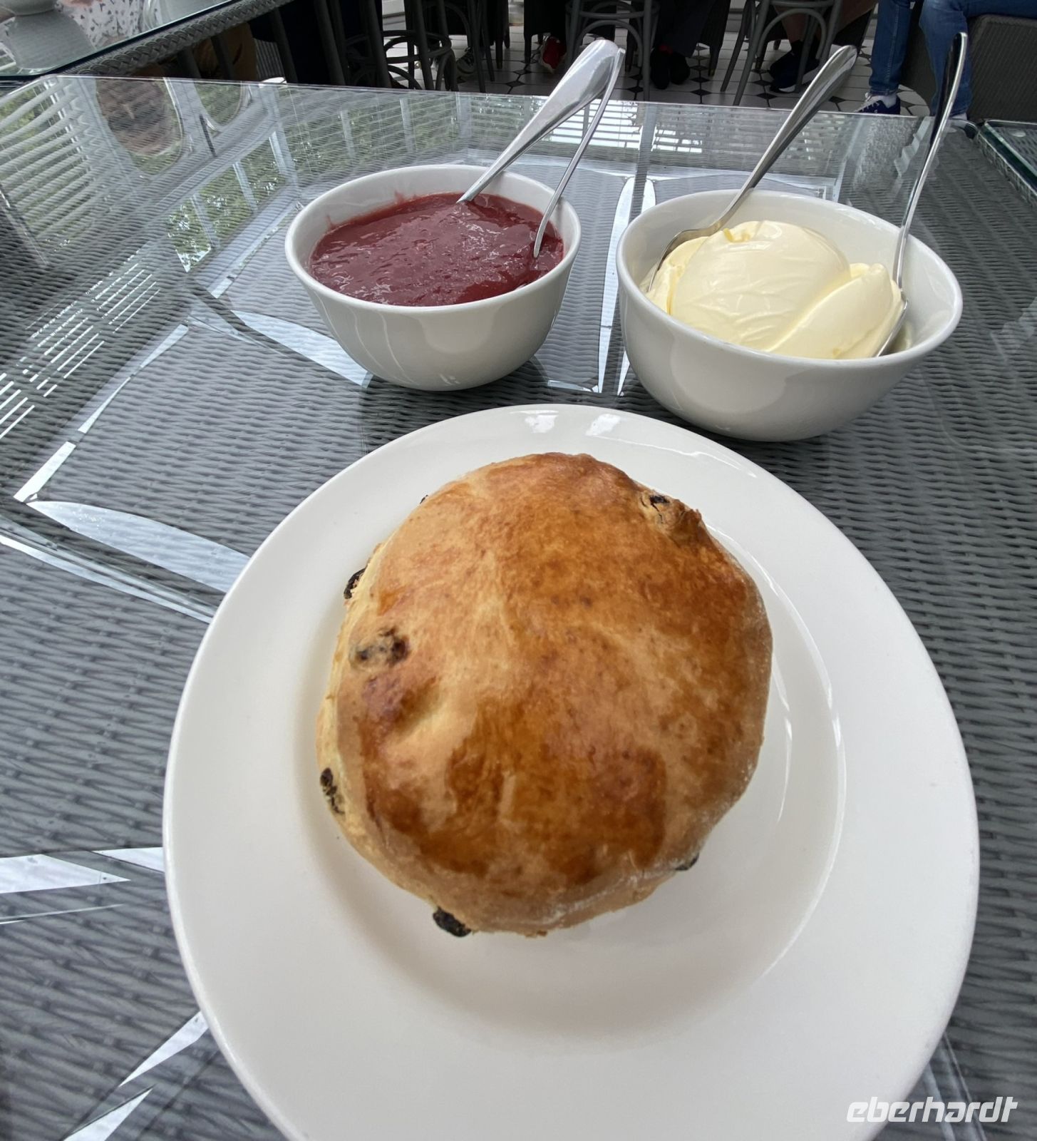 Da wir uns in England befinden, konnten wir uns eine klassische Teestunde natürlich nicht entgehen lassen. Diese besteht aus frisch gebackenen Scones - ein Art süßes Brötchen, wahlweise mit Rosinen dazu wurde Clotted Cream, Erdbeerkonfitüre und schwarzer Tee gereicht.