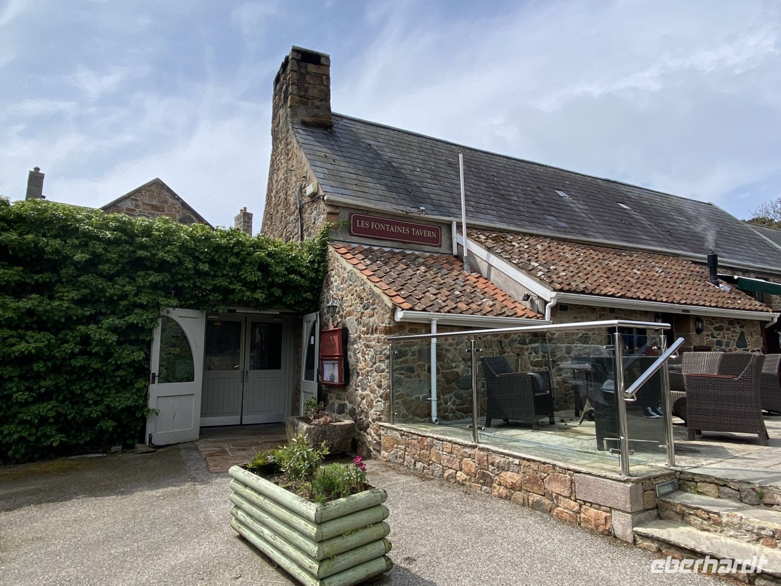 Wir fuhren weiter entlang an Austernbänken, Kieselstränden, dem Architondel Tower und Rozel Bay in Richtung Bouley Bay, wo wir einen nächsten Halt machten um Steine und Muscheln zu sammeln und um die frische Meeresluft zu genießen. Entlang der Bonne Nuit Bay fuhren wir durch die Gemeinde St. John zum Restaurant Les Fountaines Tavern, ein hübsches kleines Bauernhaus aus dem 17. Jahrhundert. Hier hieß es Köpfe einziehen, denn die Decken hingen sehr niedrig. Das störte aber nicht im geringsten. das Essen war reichhaltig und sehr schmackhaft. Gut gestärkt stiegen wir wieder in den Bus und fuhren durch die Gemeinde St. Mary in Richtung La Cobiere.