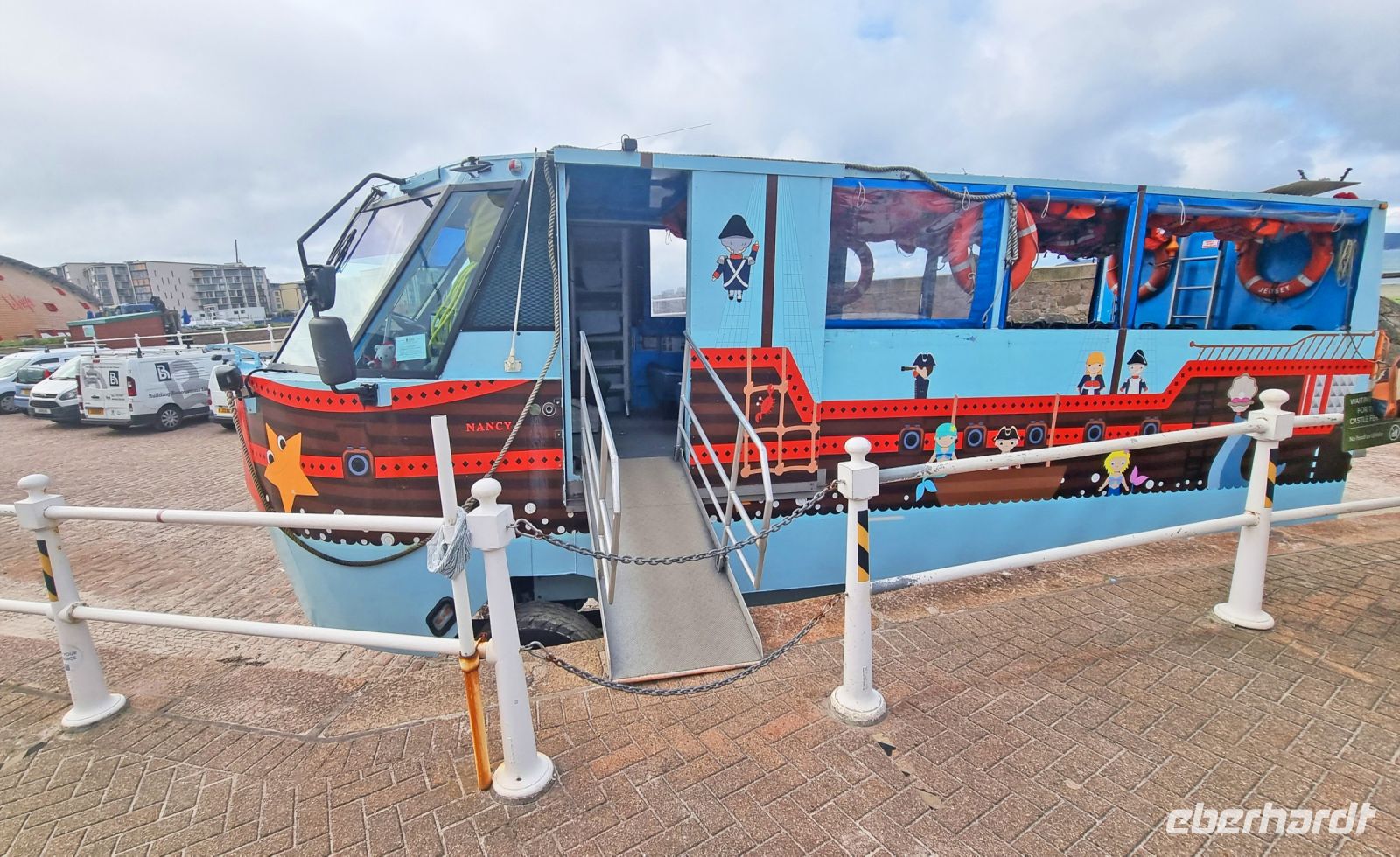 An unserem heutigen Freizeittag kann jeder die Zeit für eigene Aktivitäten auf Jersey nutzen. Wer sich einfach mal entspannen möchte oder in der Stadt bummeln möchte, kann das heute tun. Wer an diesem Tag aber noch mehr von Jersey sehen möchte, schließt sich einfach der Eberhardt-Reisebegleitung an, die als erstes einen Ausflug zum Elizabeth Castle geplant hat. Ein Großteil unserer Gruppe ist dabei. Damit wir nicht allzu weit laufen müssen, nehmen wir am Morgen kurzerhand den Bus der Linie 1, der direkt vorm Hotel abfährt, und fahren bis zum Busbahnhof Liberation Station in St. Helier. Von hier geht's zu Fuß weiter durch den kleinen Park "Les Jardins de la Mer" bis zum Elizabeth Castle Ferry Kiosk an der Strandpromenade. Hier ist unsere Gruppe bereits vorangemeldet und das erste Amphibienfahrzeug um 10 Uhr wird für uns bereitgestellt. Eine Überfahrt mit diesem Puddleduck (übersetzt Pfützenente) gehört zum Besuch des Elizabeth Castle einfach dazu! ;-)