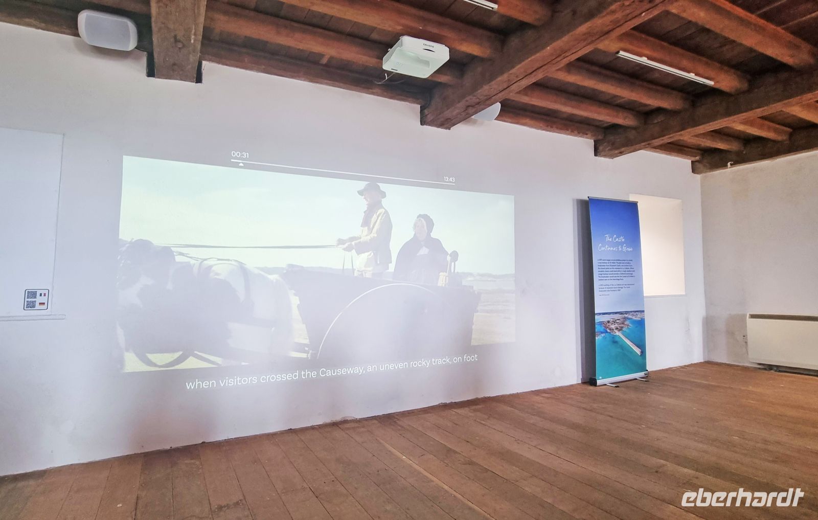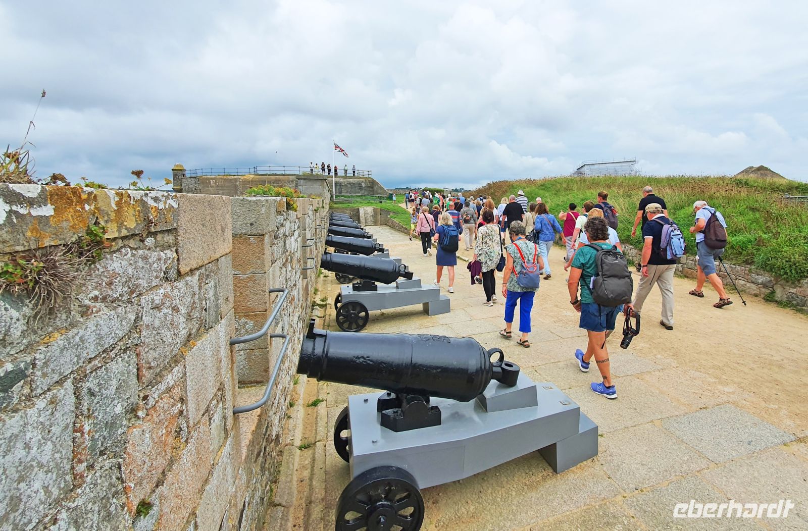 Damit wir alle zusammen fahren können, dürfen wir als erstes einsteigen und los geht die etwa 15-minütige Fahrt mit dem Amphibienbus, der sich sowohl bei Ebbe auf Rädern als auch bei Flut mit einer kleinen Schiffsschraube bewegen kann. Elizabeth Castle liegt schließlich auf einer Gezeiteninsel einige Hundert Meter vor der Küste von St. Helier. Die schaukelige Überfahrt ist immer sehr lustig, denn im Fahrzeug wird ein witziges kleines Video gezeigt. Nachdem wir die Zufahrt an der Burg mit dem Puddleduck erklommen haben, steigen wir aus und unternehmen einen kleinen Rundgang in der Burganlage, die aus mehreren Teilen besteht: dem äußeren Bezirk mit Wachhaus und Hospital, der Unterburg mit der Kaserne und Offizierswohnungen sowie der Oberburg mit den ältesten Gebäuden der Festung und deutschen Bunkeranlagen aus dem 2. Weltkrieg. Im Governor's House gab es auch einen kleinen Film zur Geschichte der Burg. Über den Wellenbrecher liefen wir auch zum Hermitage-Felsen, wo im 6. Jahrhundert der Geistliche Helerius als Einsiedler gelebt haben soll. Er wurde von Wikinger-Piraten getötet und später heilig gesprochen. Nach ihm wurde die Inselhauptstadt St. Helier (Heiliger Helerius) benannt.