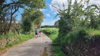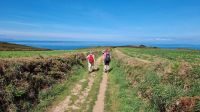 Dann geht es auf einem etwa 100 Meter langen, steilen Anstieg mit Stufen hinauf zum Küstenpfad. Durch Ginsterbüsche und kleine Wäldchen wandern wir entlang des Küstenpfades oberhalb von Beauport Bay, einer kleinen versteckten Bucht. Der Küstenpfad ist geröllig und teils felsig, feste Schuhe sind unbedingt nötig, Wanderstöcke kann man mitnehmen, wenn man sich sicherer fühlt, sind aber nicht zwingend nötig. Es sind auch einige Stufen und kurze steile Steigungen und Abstiege dabei.