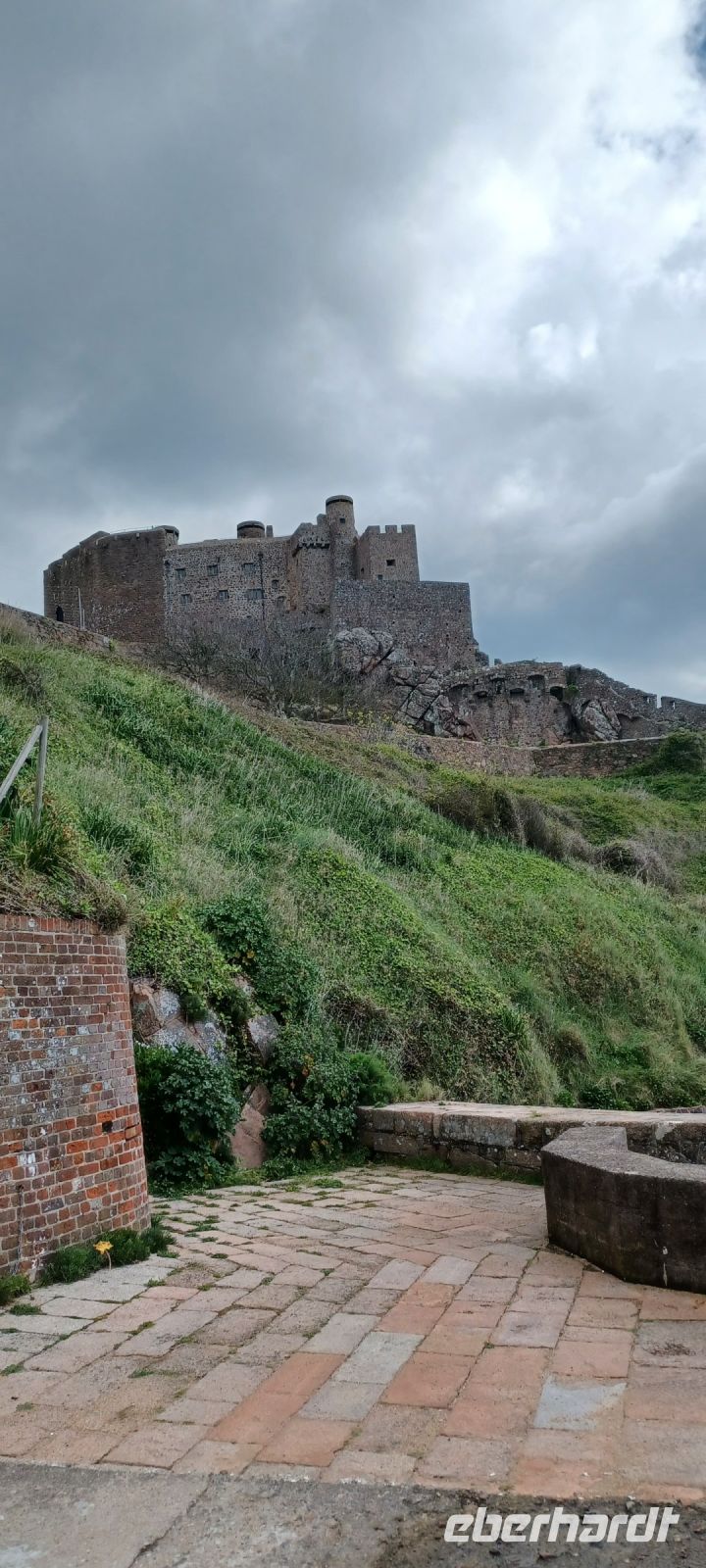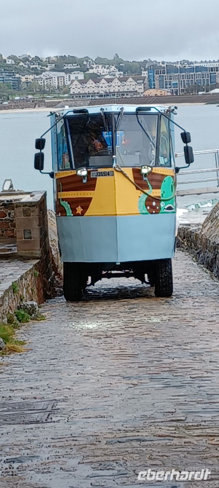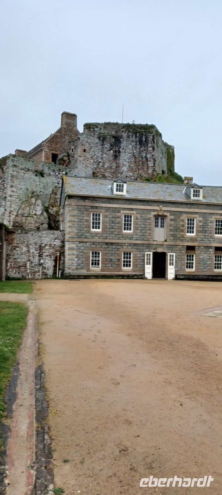 Tunnels zu besuchen. Nebenbei gesagt, war die Entscheidung, gestern wandern zu gehen, goldrichtig. Wenige Gäste gehen trotz des schlechten Wetters zum Elisabeth Castle - dem Wahrzeichen von St. Helier. Die Festungsanlage ist in der St. Aubin`s Bay gelegen und nach der englischen Königin Elisabeth I. benannt. Wir könnten zu Fuß bis zur Burg bei Niedrigwasser über einen Pflasterweg, der dann sichtbar ist, laufen. Jetzt ist jedoch Flut und wir nehmen das Amphibienfahrzeug.st gerade Ebbe und. Aber wir bevorzugen das Amphibienfahrzeug. Gemeinsam besichtigen wir die Burganlage, erfahren etwas über die Geschichte dieser und ihren wohl berühmtesten Bewohner- Charles II., der nach der Ermordung seines Vaters, Charles I., im Exil hier Zuflucht fand, mit der Tochter des Gouverneurs von Jersey, Margaret de Carteret, einen Sommer verbracht hat, die bald darauf einen Sohn gebar, den er aber nie offiziell als seinen Sohn anerkannte. Nach der bürgerlichen Revolution in England und der Wiederherstellung der Monarchie (Restauration) wurde er englischer König Charles II. Die Herkunft des Namens New Jersey ist für uns auch interessant. Wir erfahren, dass der König später dem Gouverneur von Jersey für dessen Unterstützung während des Exils als Dank ein Stück Land in Amerika - in der Neuen Welt geschenkt hat. Es ist heute allen als New Jersey, getrennt von New York durch den Hudson River, bekannt. Unser Rundgang in der Burganlage wird heute leider nicht durch die Demonstration und Beschreibung der „Langen Waffen“ der “Redrocks“ (so nannte man die englischen Soldaten aufgrund der Farbe ihrer Uniformen), das Einüben vom Marschieren im Gleichschritt und einen Kanonenschuss beendet.